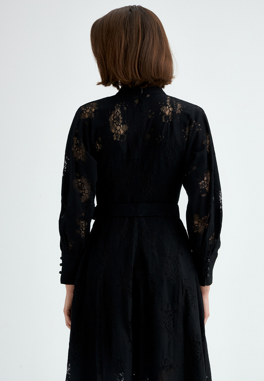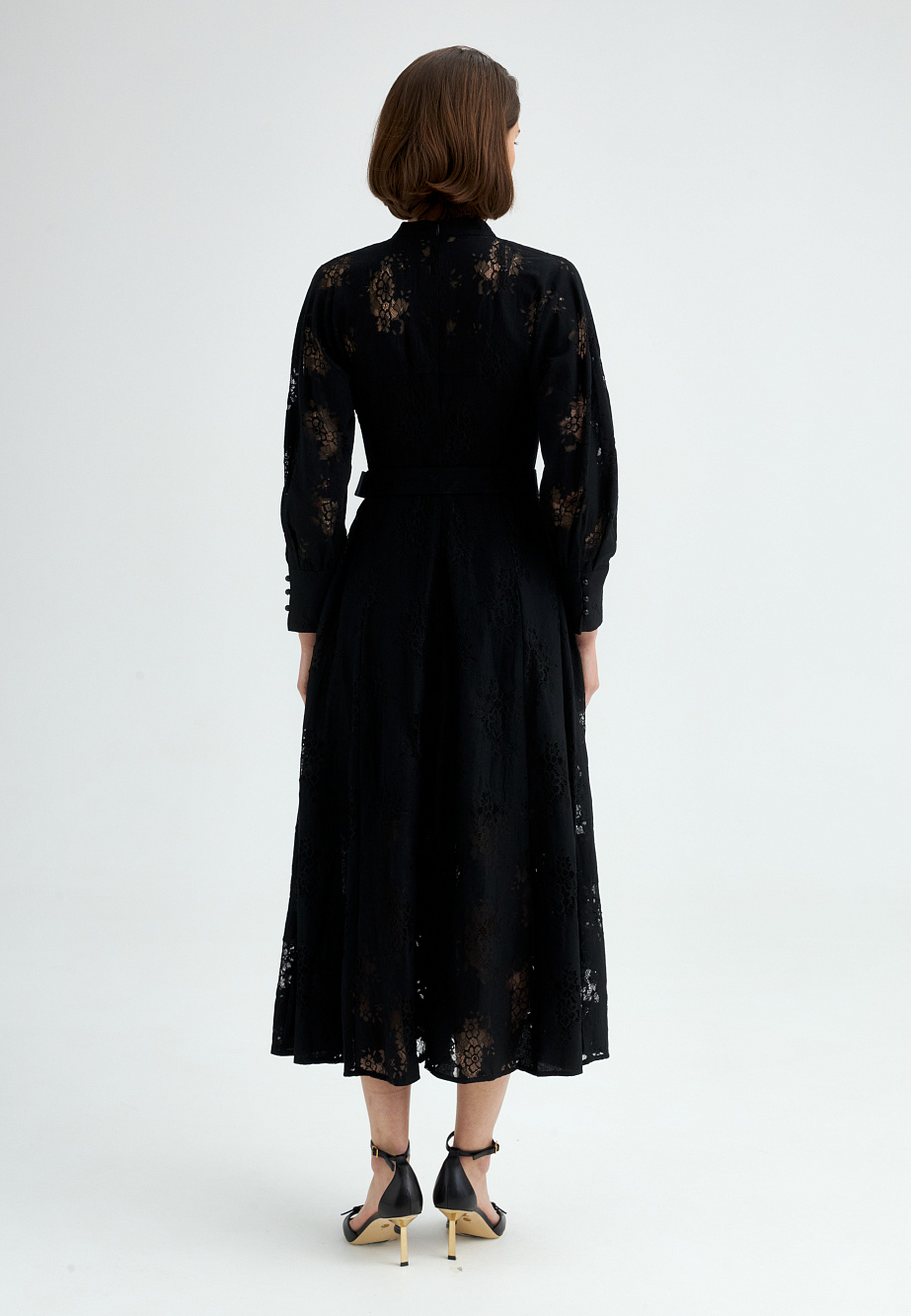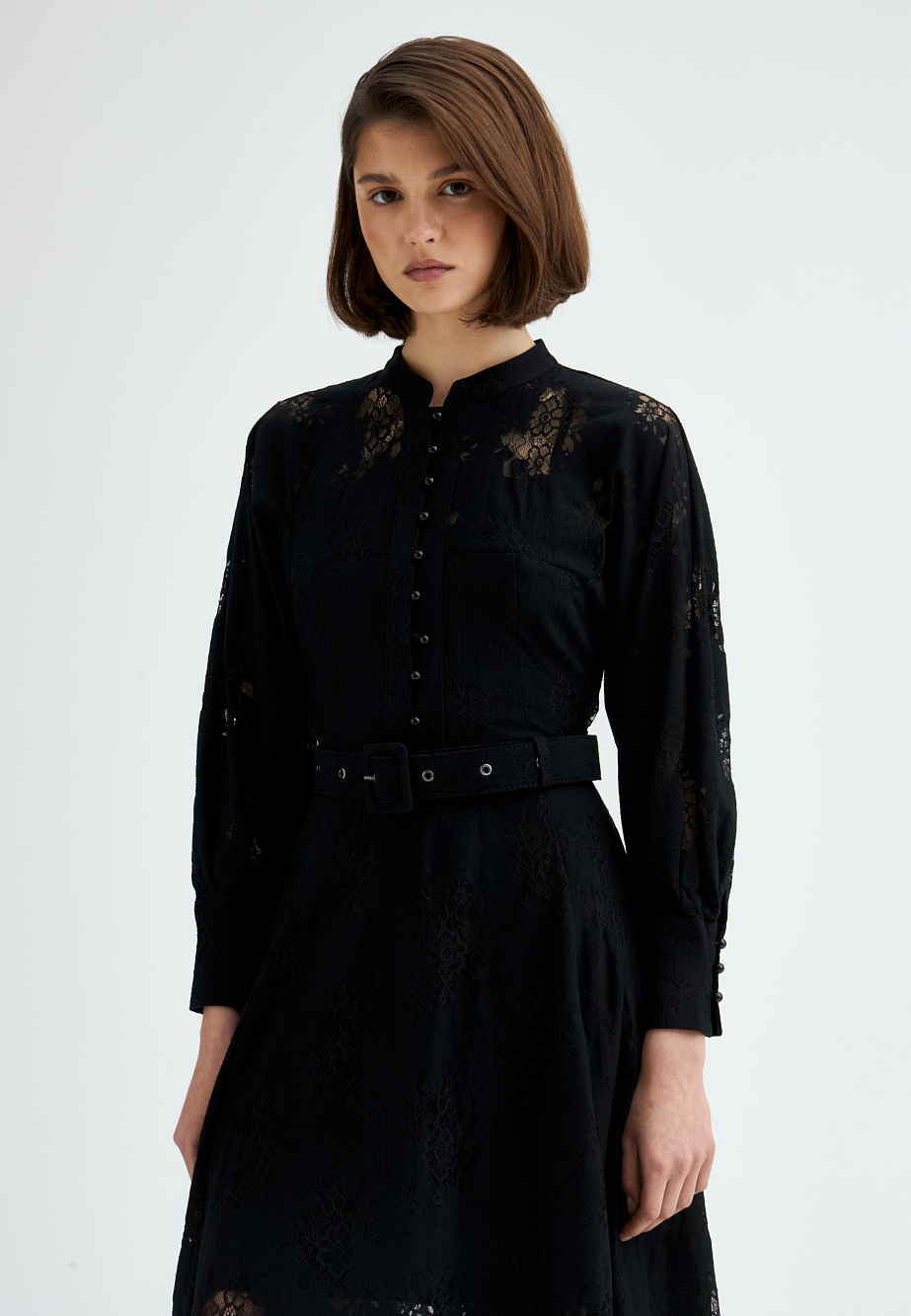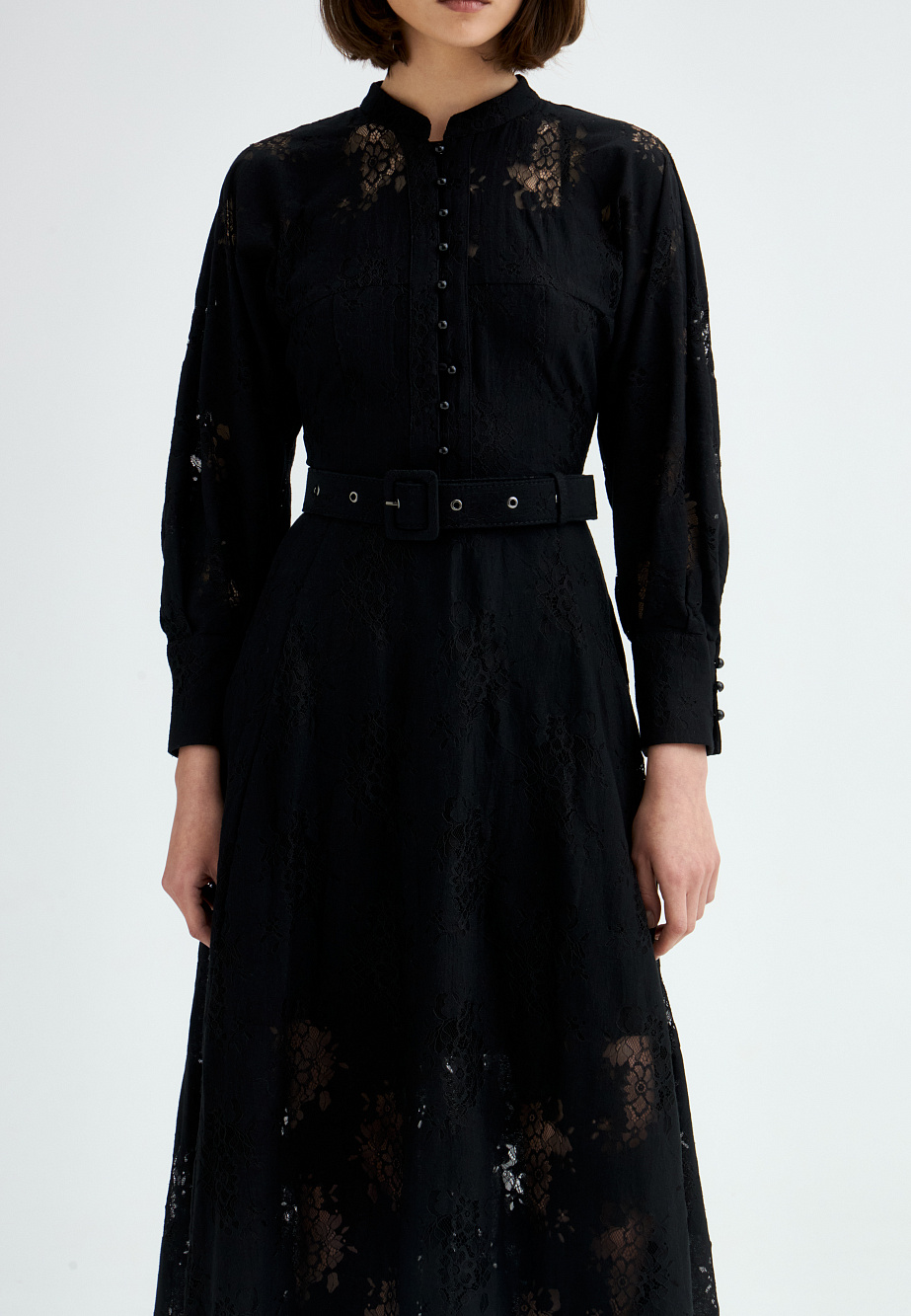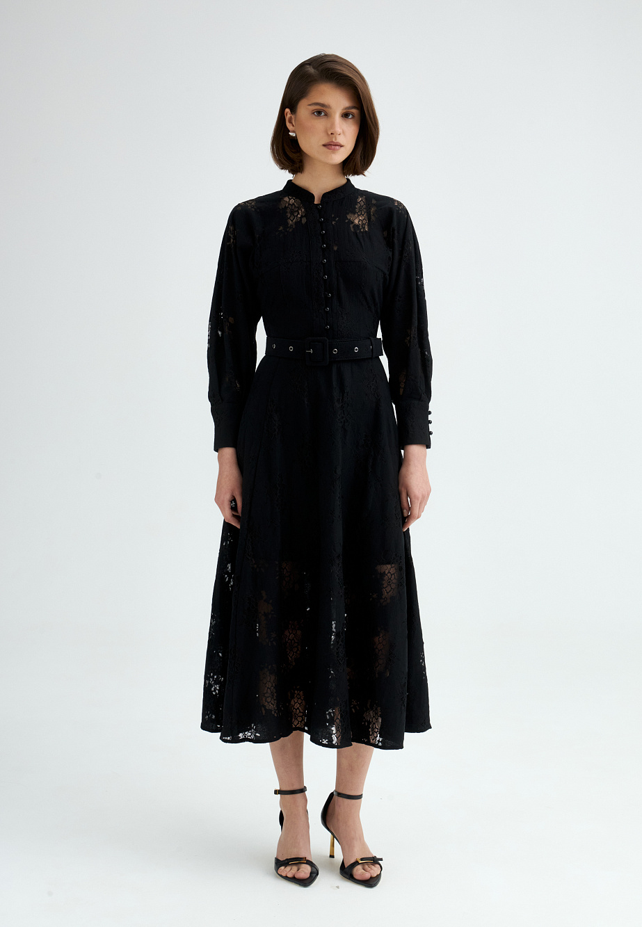 Платье из полупрозрачного хлопкового кружева с утонченной фактурой и безупречной отделкой. Приталенный силуэт с цельнокроеными объемными рукавами на манжетах, воротником-стойкой и декоративной застежкой на воздушные петли создает выразительный и элегантный образ. Расклешенная юбка и текстильный пояс подчеркивают линию талии, добавляя женственности. Благодаря универсальному характеру модели, образ легко адаптируется — от романтичного до вдохновленного стилем вестерн. В комплект входит платье-комбинация из тонкой вискозы в тон основному материалу, на регулируемых бретелях.