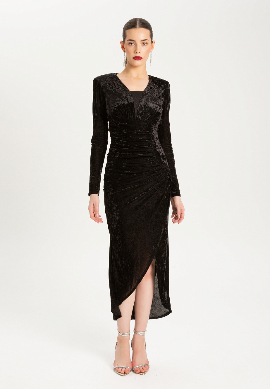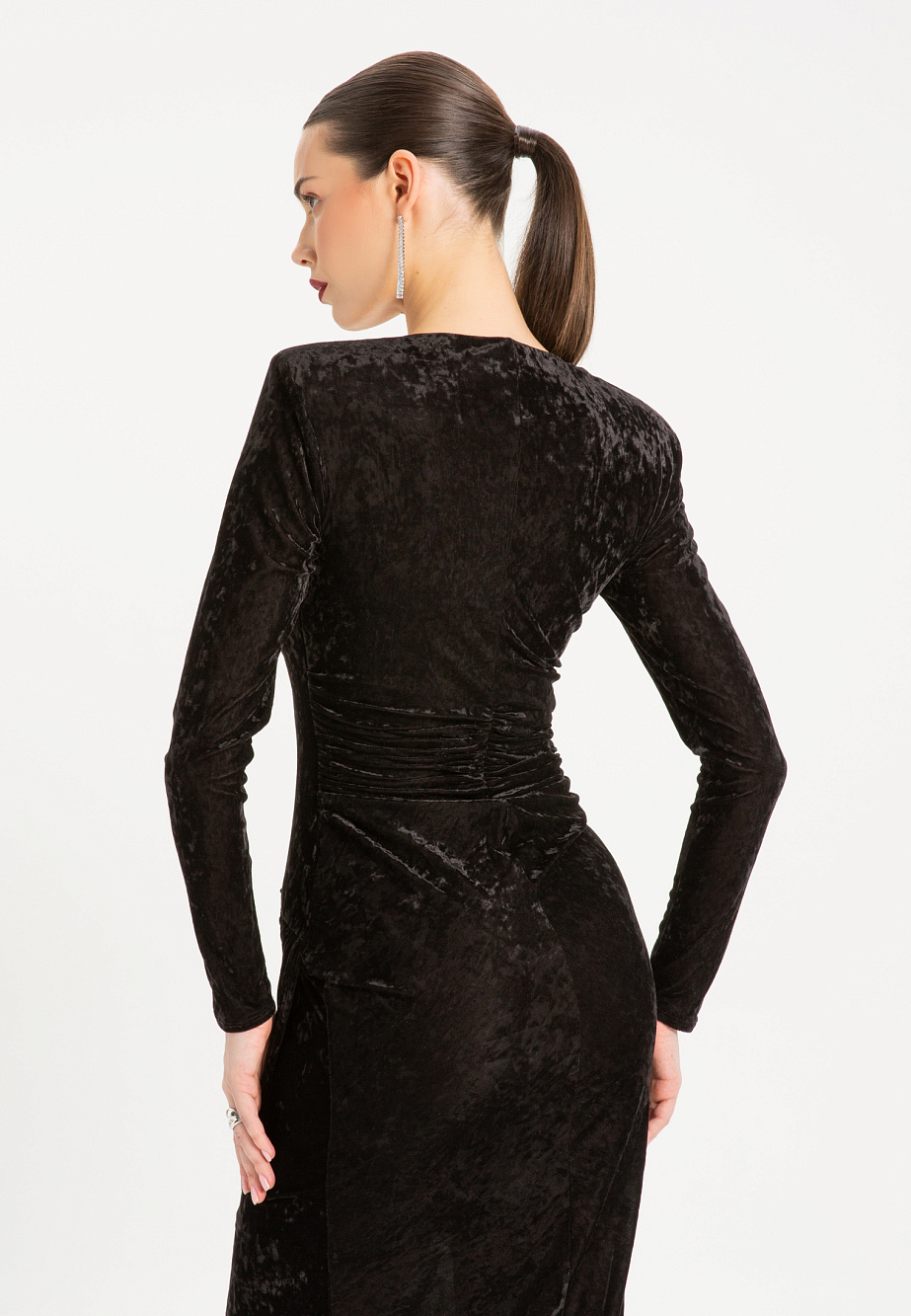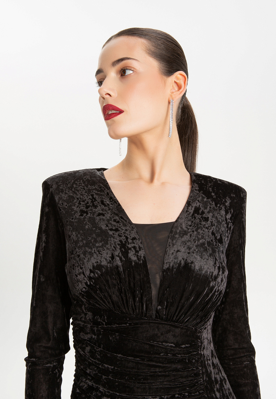 Элегантное платье из эластичного панбархата с мраморным эффектом, с асимметричными драпировками. Модель с высокими плечевыми накладками создает выразительный силуэт, а вставка из сетки на горловине добавляет образу легкости. Асимметричный низ и встроенные мягкие чашки подчеркивают женственность, а эластичная сетчатая подкладка обеспечивает идеальную посадку и удобство в носке.