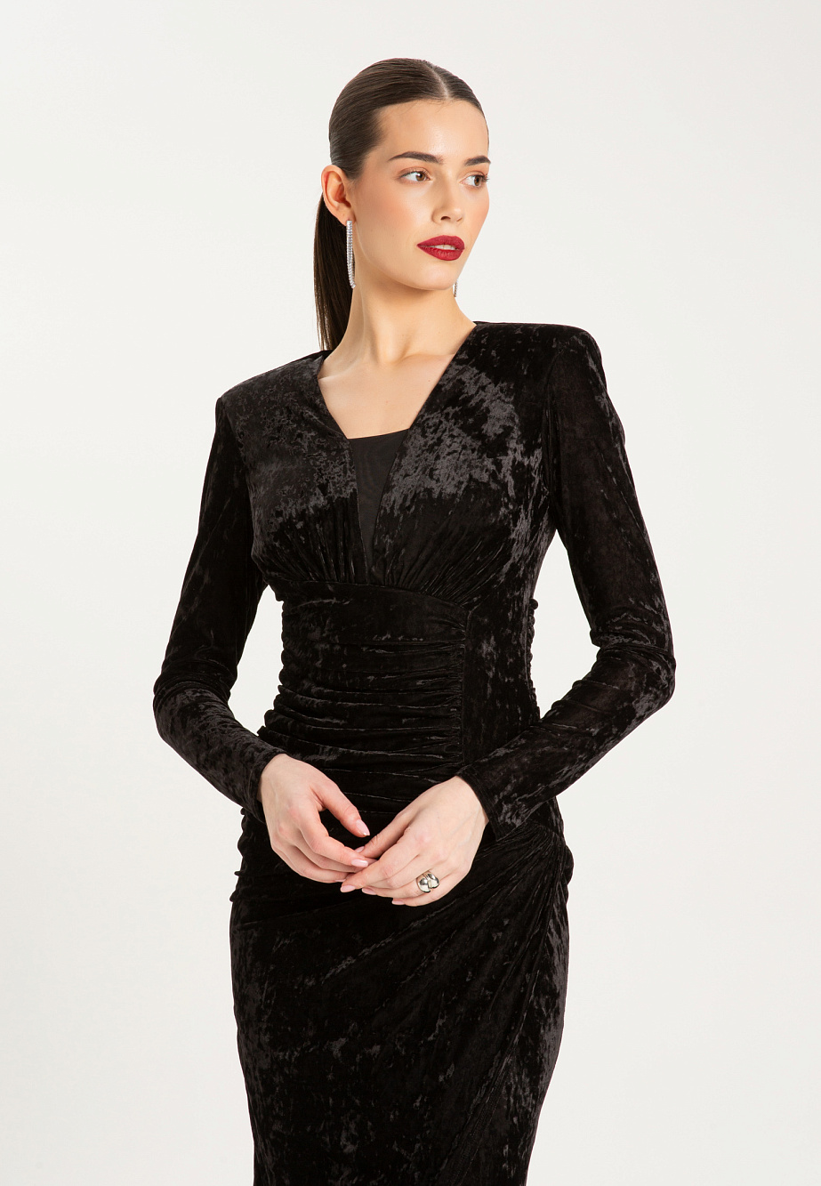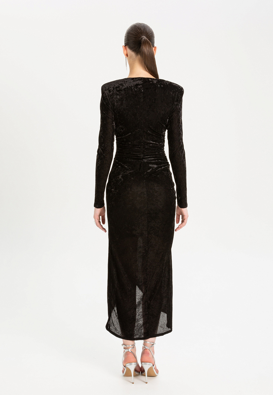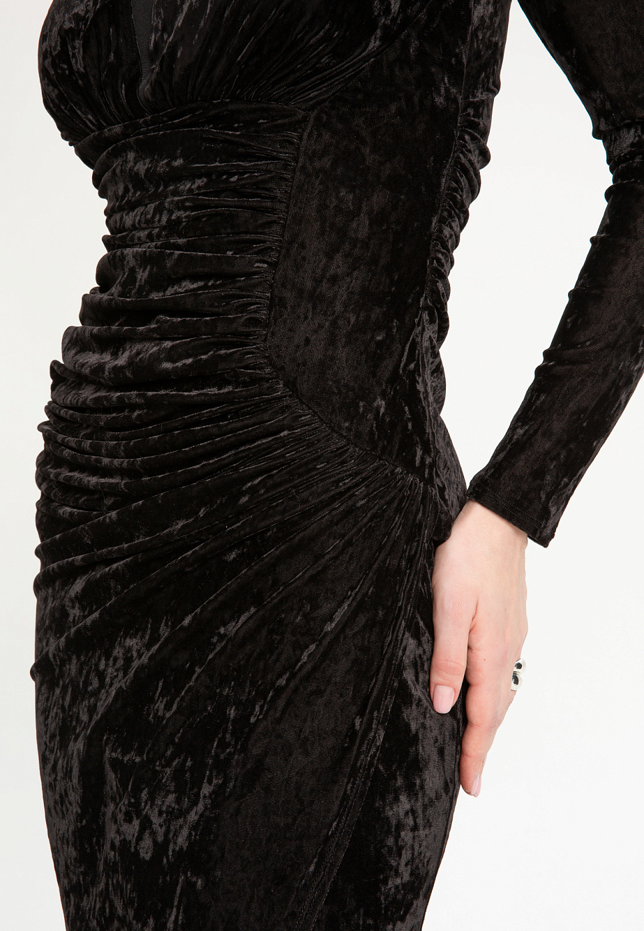 Элегантное платье из эластичного панбархата с мраморным эффектом, с асимметричными драпировками. Модель с высокими плечевыми накладками создает выразительный силуэт, а вставка из сетки на горловине добавляет образу легкости. Асимметричный низ и встроенные мягкие чашки подчеркивают женственность, а эластичная сетчатая подкладка обеспечивает идеальную посадку и удобство в носке.