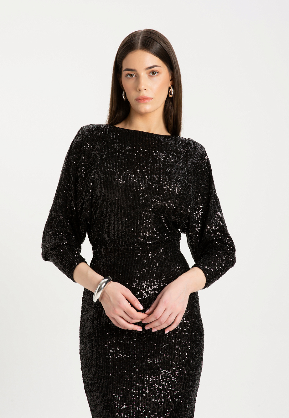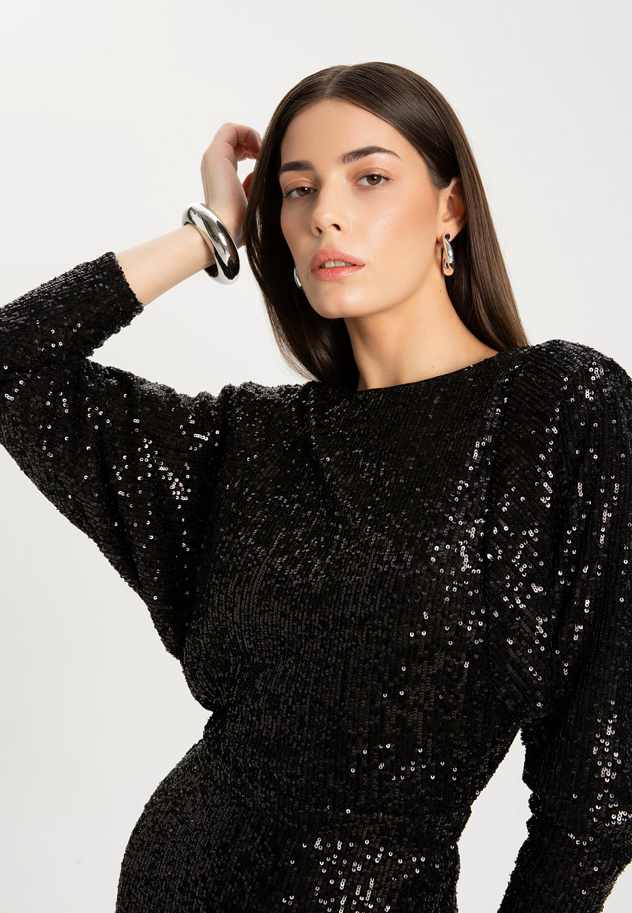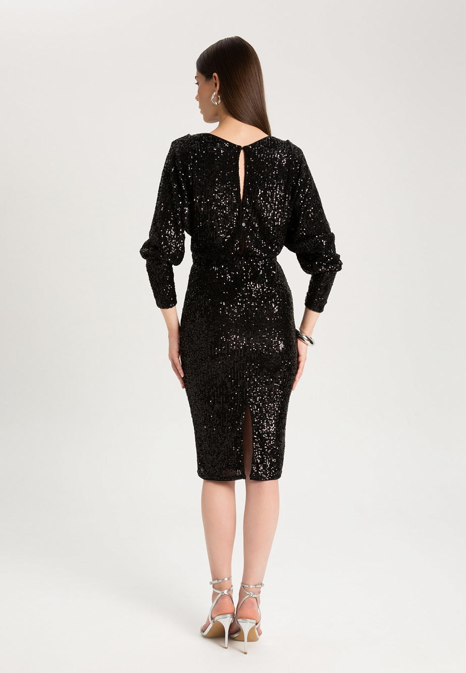 Элегантное коктейльное платье длиной чуть ниже колена из мягкой эластичной ткани с мерцающими пайетками. Модель с эффектным рукавом «летучая мышь» и плечевыми накладками создаёт выразительный силуэт с акцентом на линию плеч. Глубокий вырез «лодочка» и разрез на юбке сзади подчёркивают женственность, а за практичность и удобство отвечают резинка на талии, потайная молния и декоративная щель на спинке с металлическими пуговицами. Платье полностью на подкладке из эластичной сетки с защитой внутренних срезов.