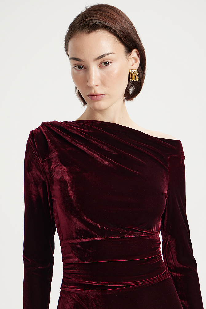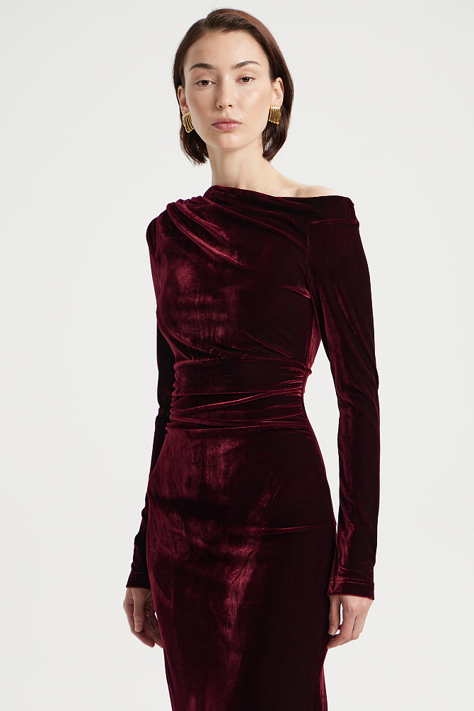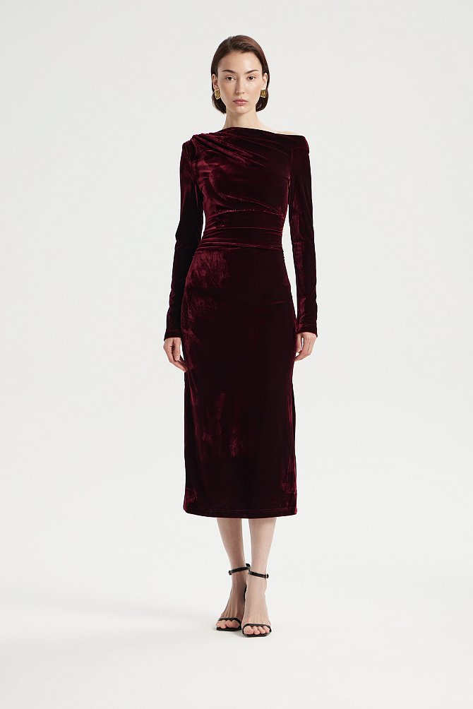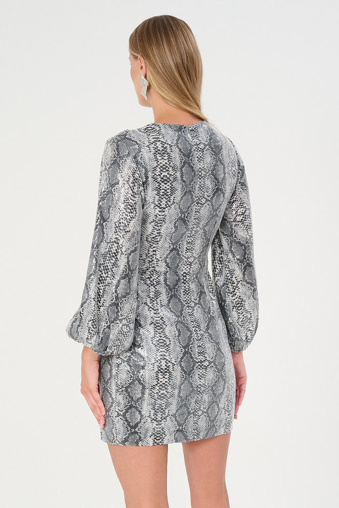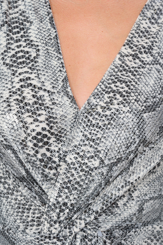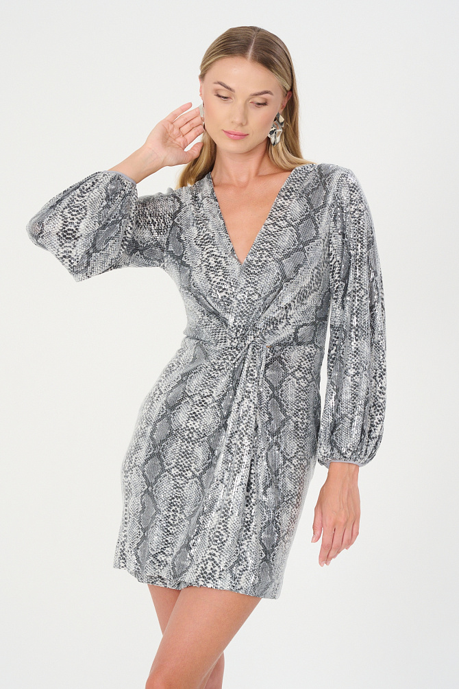 Элегантное коктейльное платье длиной чуть ниже колена из мягкой эластичной ткани с мерцающими пайетками. Модель с эффектным рукавом «летучая мышь» и плечевыми накладками создаёт выразительный силуэт с акцентом на линию плеч. Глубокий вырез «лодочка» и разрез на юбке сзади подчёркивают женственность, а за практичность и удобство отвечают резинка на талии, потайная молния и декоративная щель на спинке с металлическими пуговицами. Платье полностью на подкладке из эластичной сетки с защитой внутренних срезов.