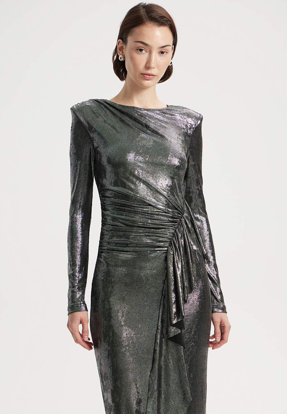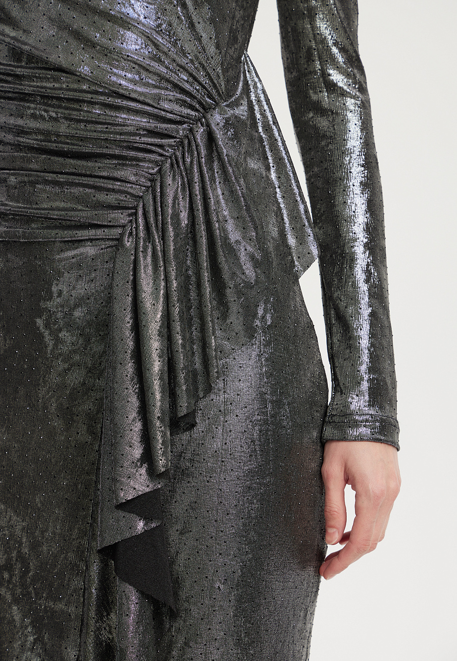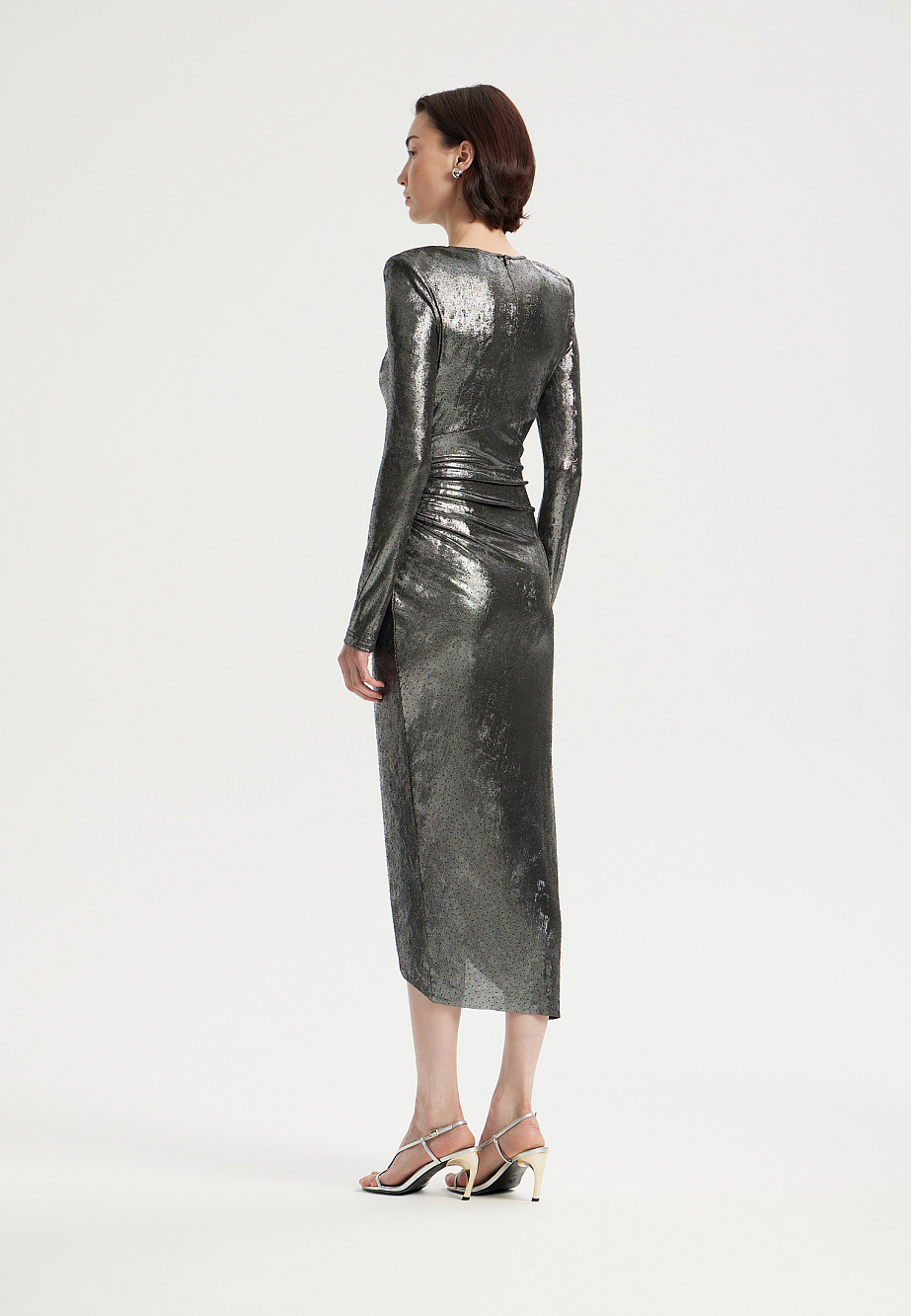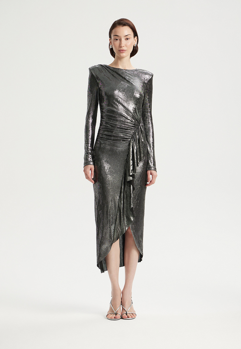 Коктейльное платье асимметричного кроя из мягкого эластичного трикотажа с серебристым отливом и россыпью страз. Выразительные плечевые накладки и драпировки создают динамичный объём, а подрез с воланами и густой сборкой подчеркивает талию. Эффектный разрез по ноге и асимметричный подол добавляют образу смелости. Модель застегивается на потайную молнию на спинке и дополнена сетчатой подкладкой.