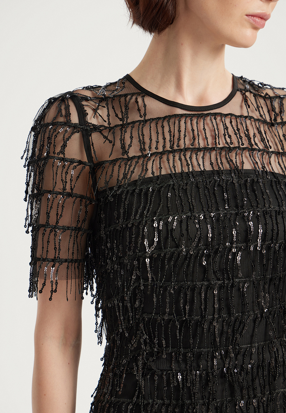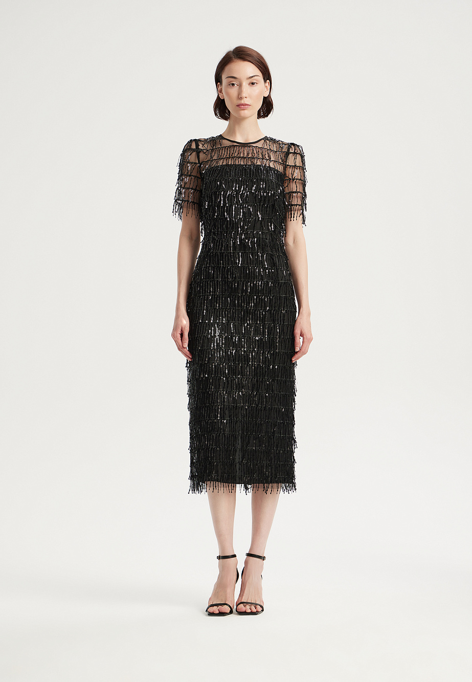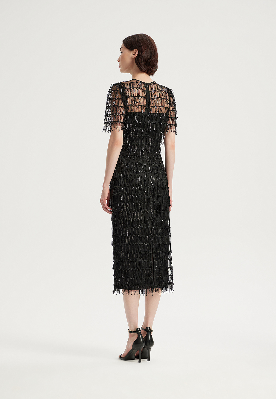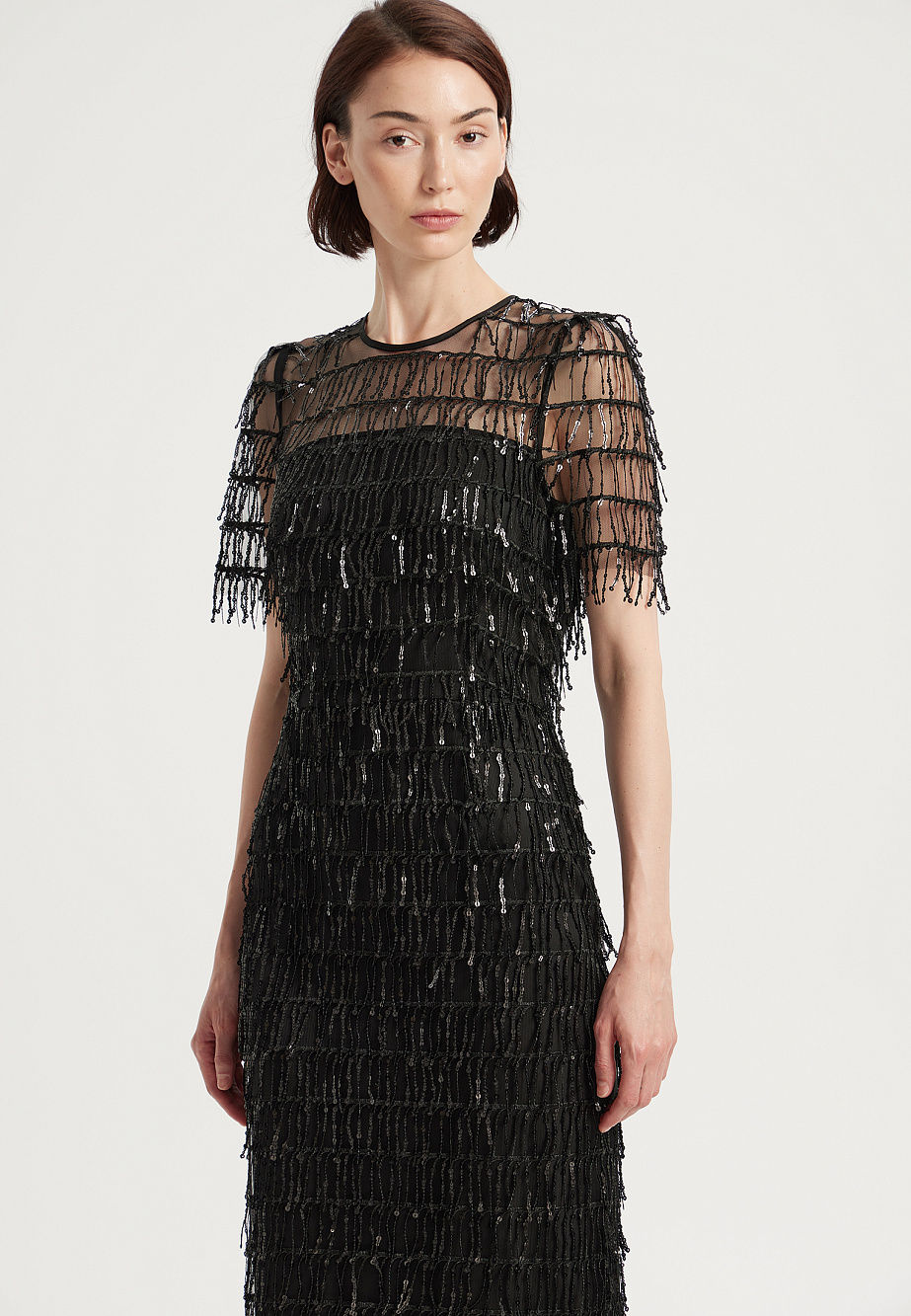 Коктейльное платье-футляр длиной чуть ниже колена, созданное из комбинации прозрачной сетки и мерцающей бахромы с пайетками. Модель с короткими рукавами на защипах и разрезом сзади подчеркивает элегантность силуэта. Потайная молния на спине и сатиновая подкладка гарантируют удобство в носке. Игра фактур в черном цвете создает эффектный и запоминающийся образ.