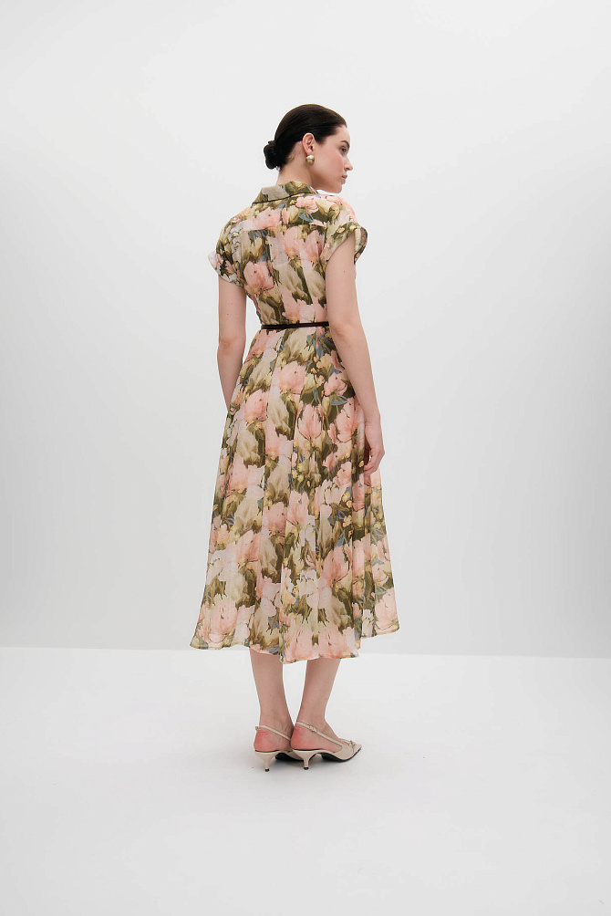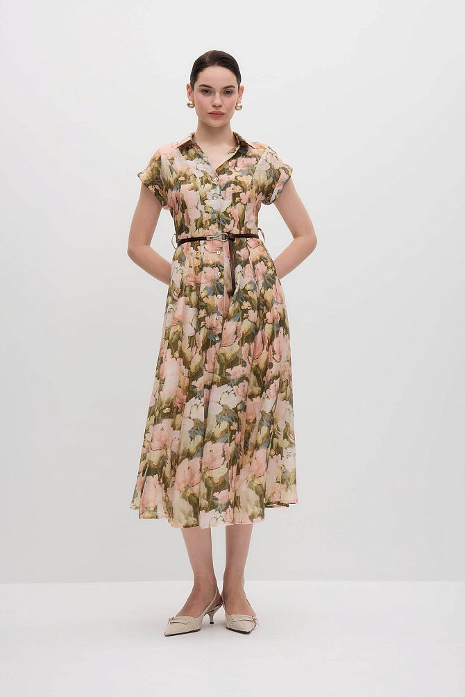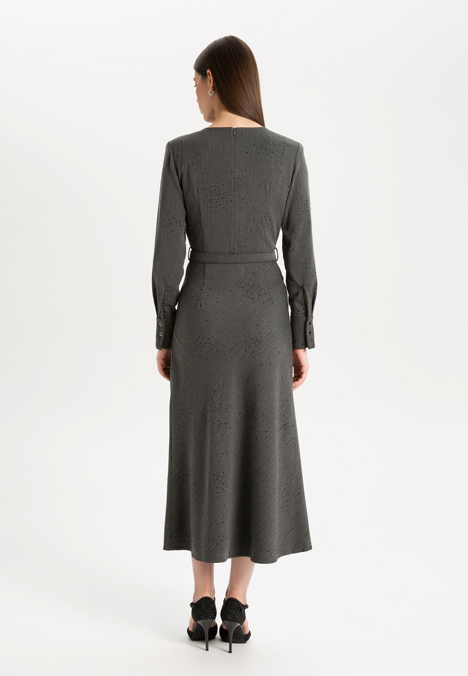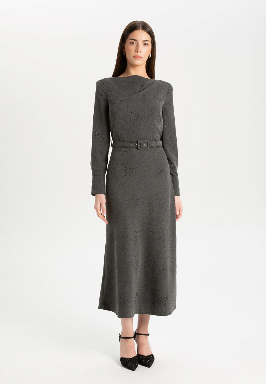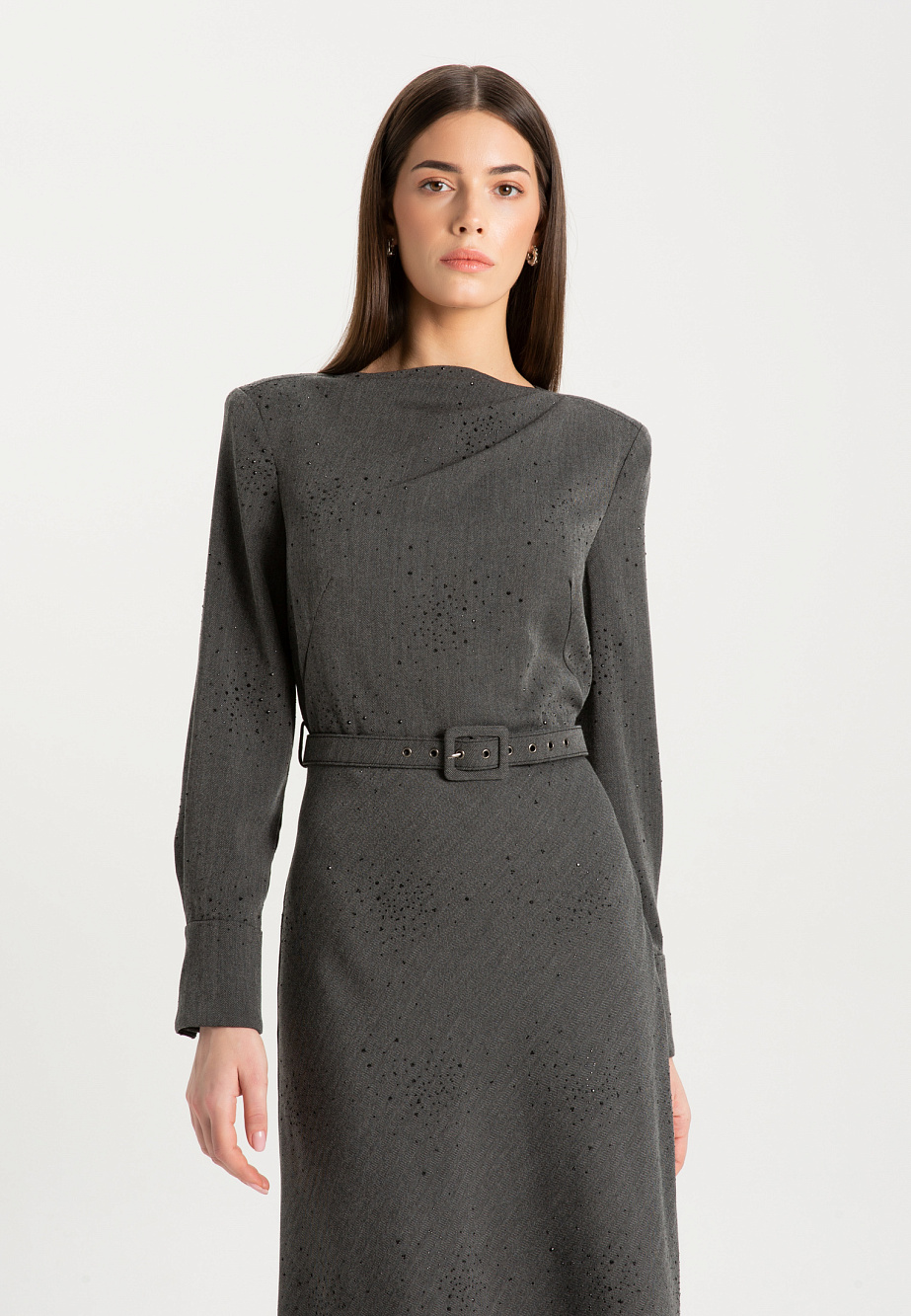 Элегантное повседневное платье из мягкой костюмной ткани с рисунком «ёлочка-полоска», украшенное россыпью страз. Модель с акцентом на плечи за счёт асимметричных складок и длинными рукавами на манжетах с пуговицами создаёт выразительный образ. Юбка, раскроенная по косой, мягко облегает фигуру, а обтяжной ремень подчёркивает талию. Модель с подкладкой и потайными молниями на спинке и в боковом шве.