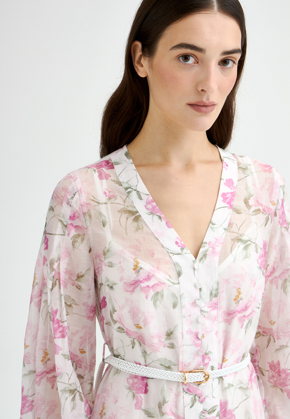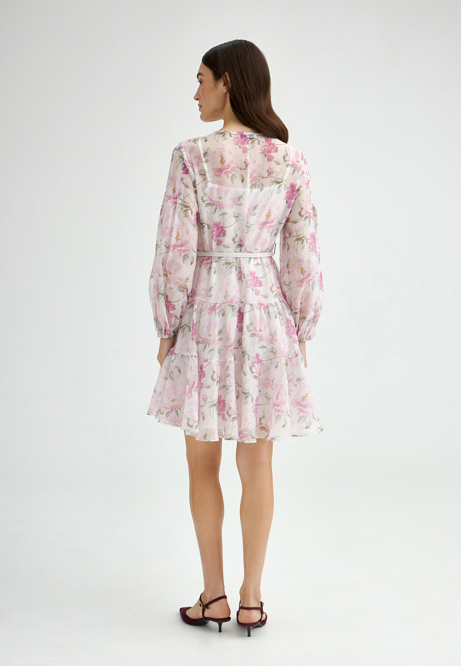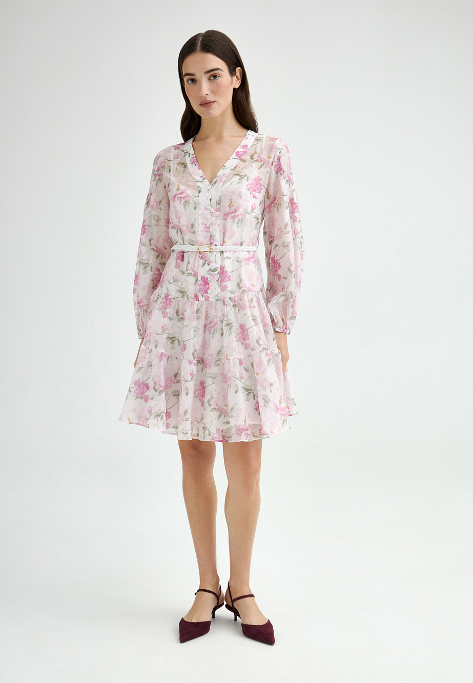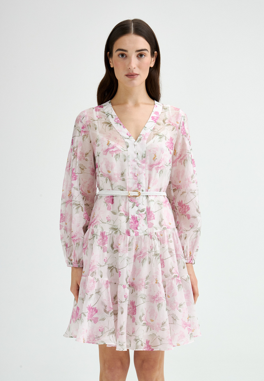 Летнее платье свободного силуэта выполнено из полупрозрачной ткани из тенселя с утонченным цветочным принтом. Объемные рукава с застроченными складками, многослойная юбка, ряд пуговиц и плетеный ремень - идеальный вариант для тех, для кого важны мода и удобноство.