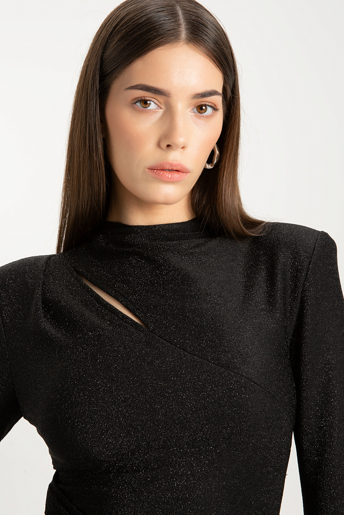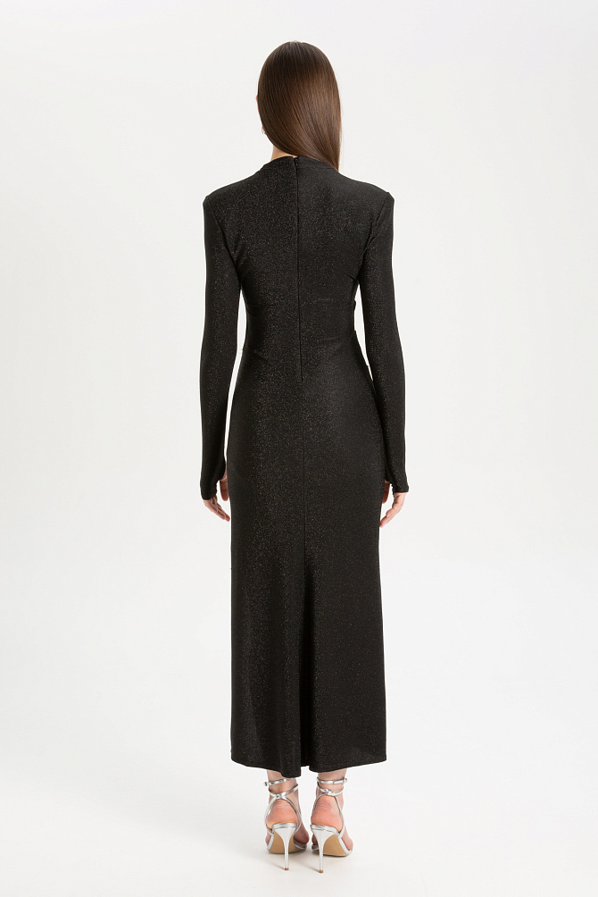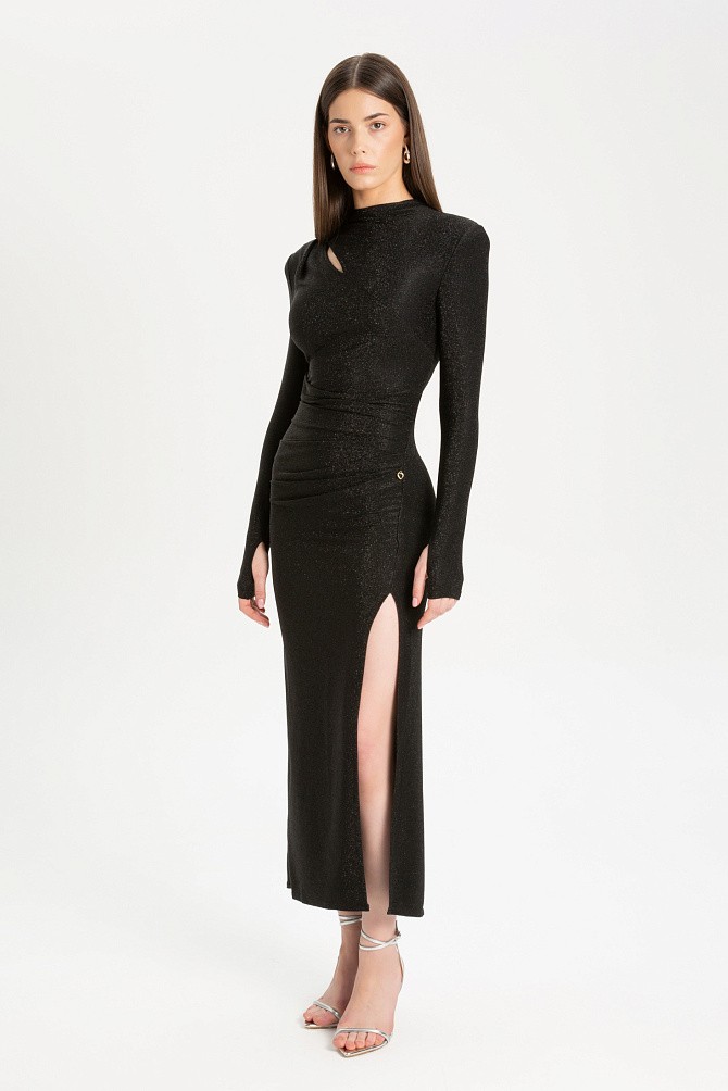 Подкладка в виде отдельного платья-комбинации из района, потайная молния сбоку и рукав на резинке по низу, планка с имитацией застежки и V-образный вырез горловины, плетеный ремень из шнура с золотой фурнитурой - тут все продумано до мелочей.