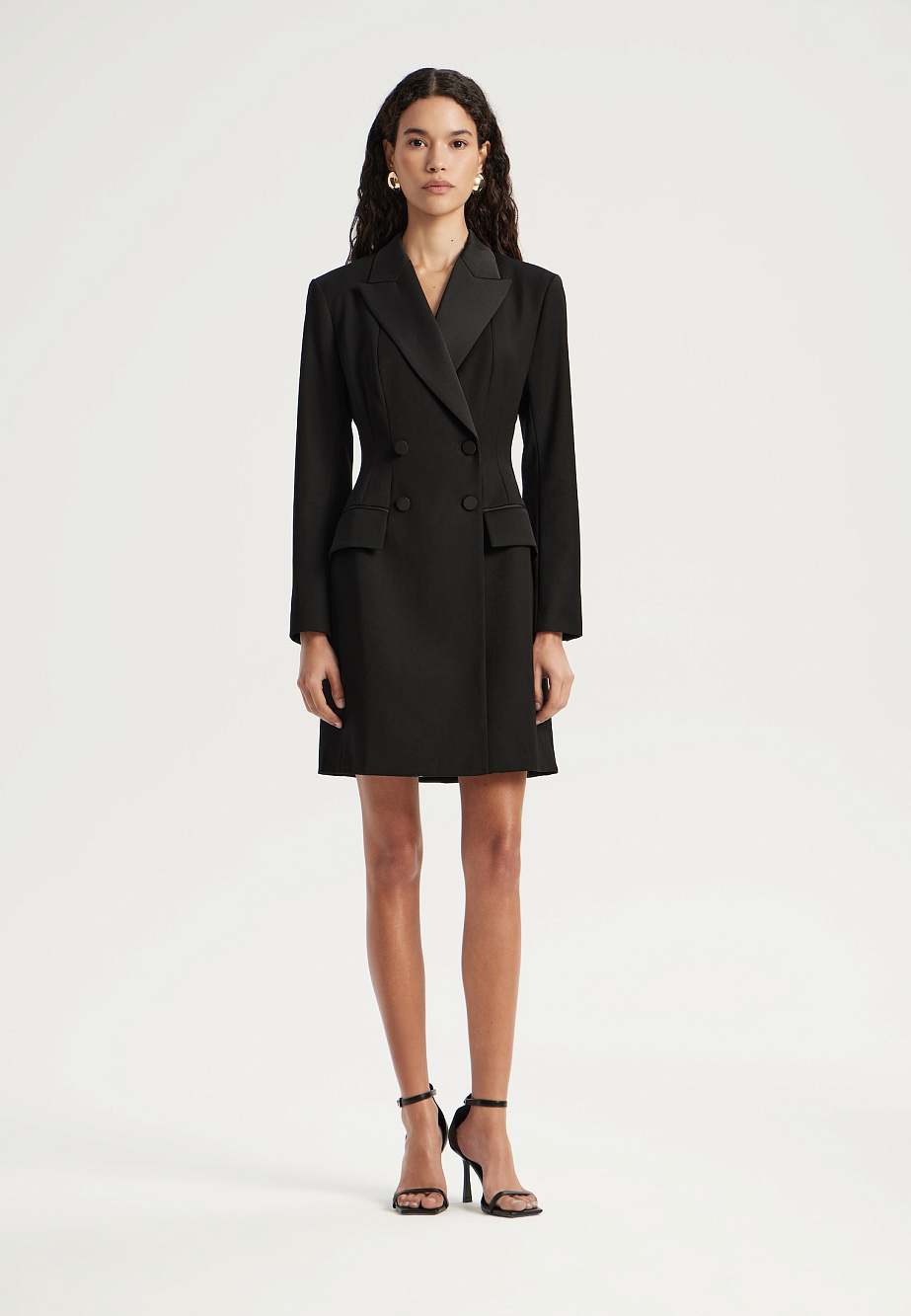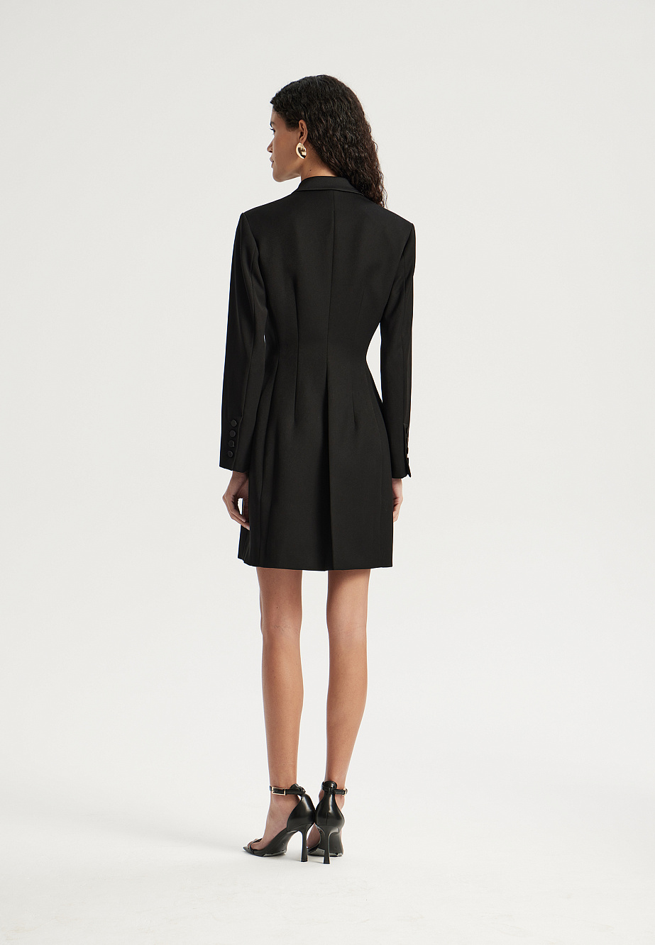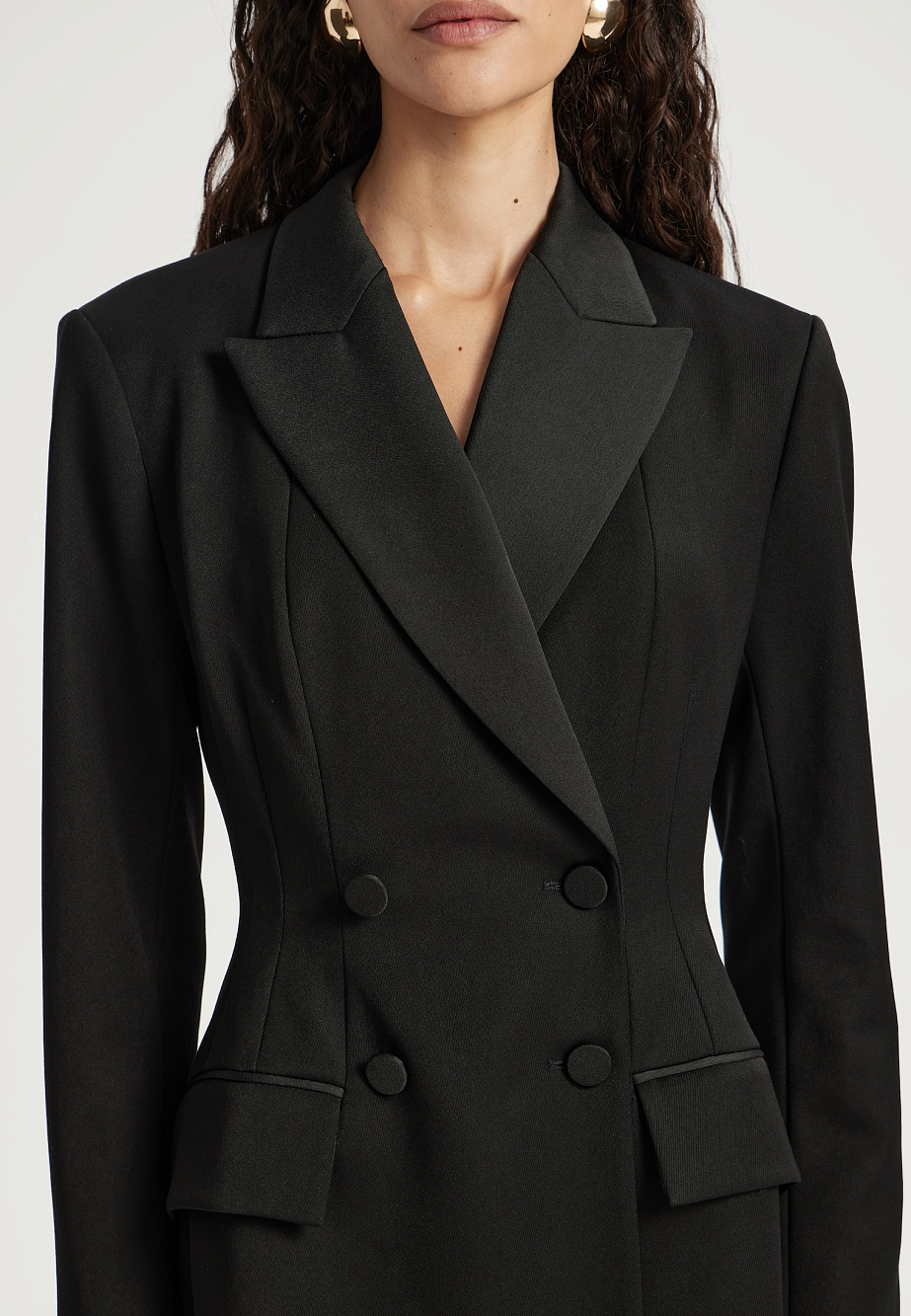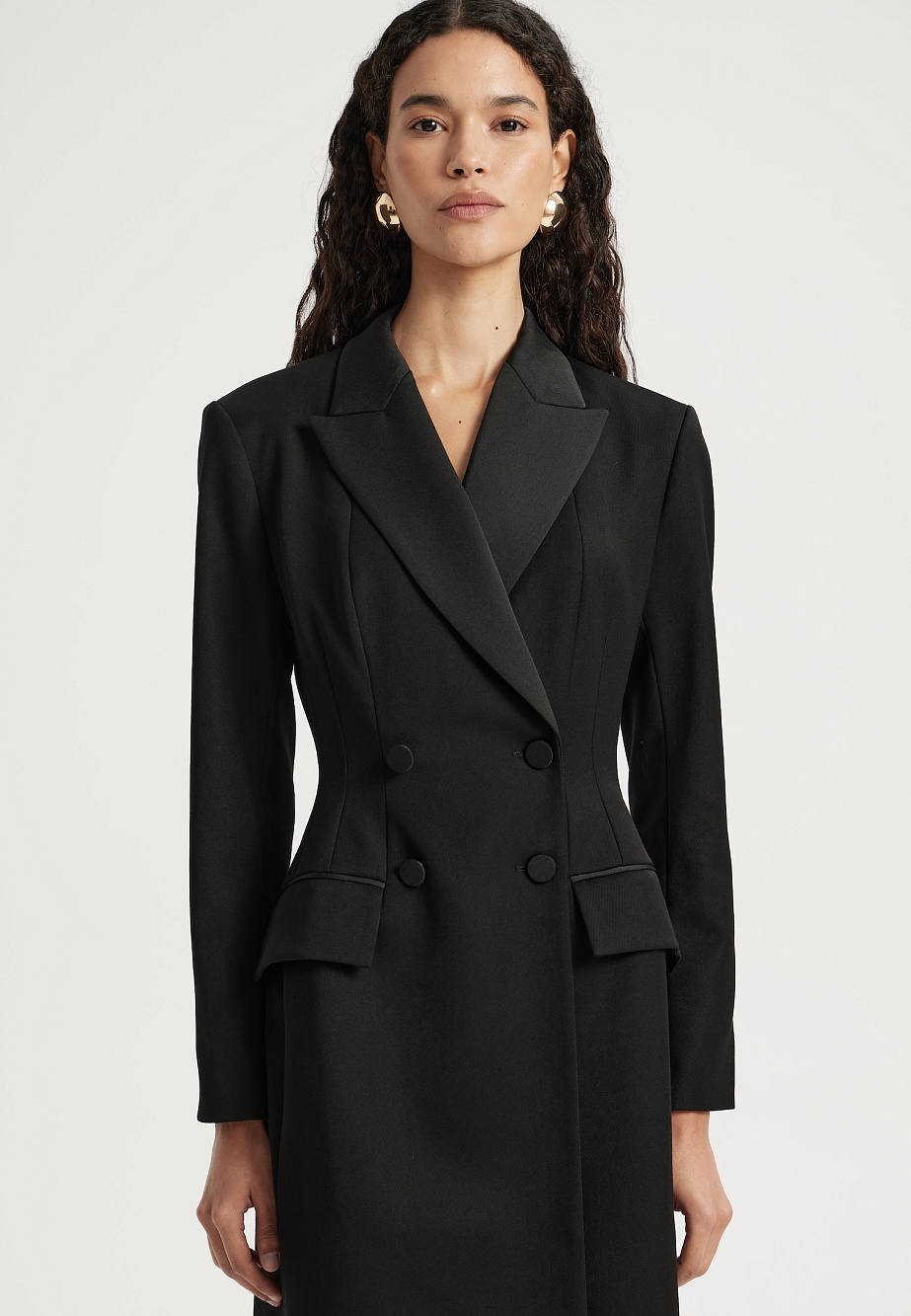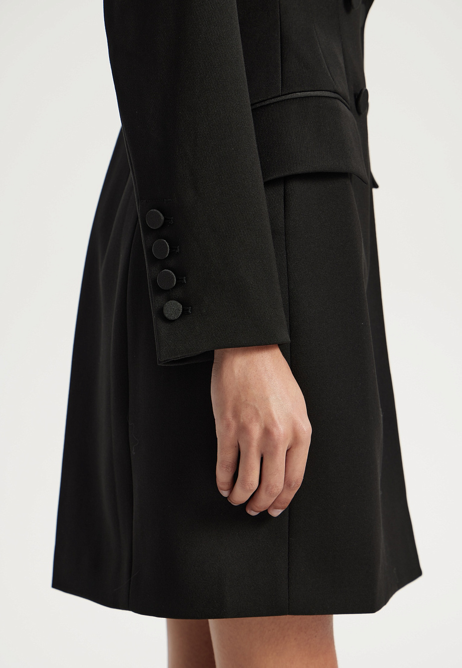 Платье-жакет в стиле смокинга с атласными лацканами и отделкой выполнено из формоустойчивой ткани, имеет приталенный силуэт с акцентными плечами и свободную посадку по бедрам. Двубортная застежка, прорезные карманы с атласными рамками и комфортная подкладка с вискозой подчеркивают элегантность модели. Длина чуть выше колена делает образ универсальным как для торжественных мероприятий, так и для вечерних выходов. Впрочем, платье-жакет подойдет и для делового дресс-кода.