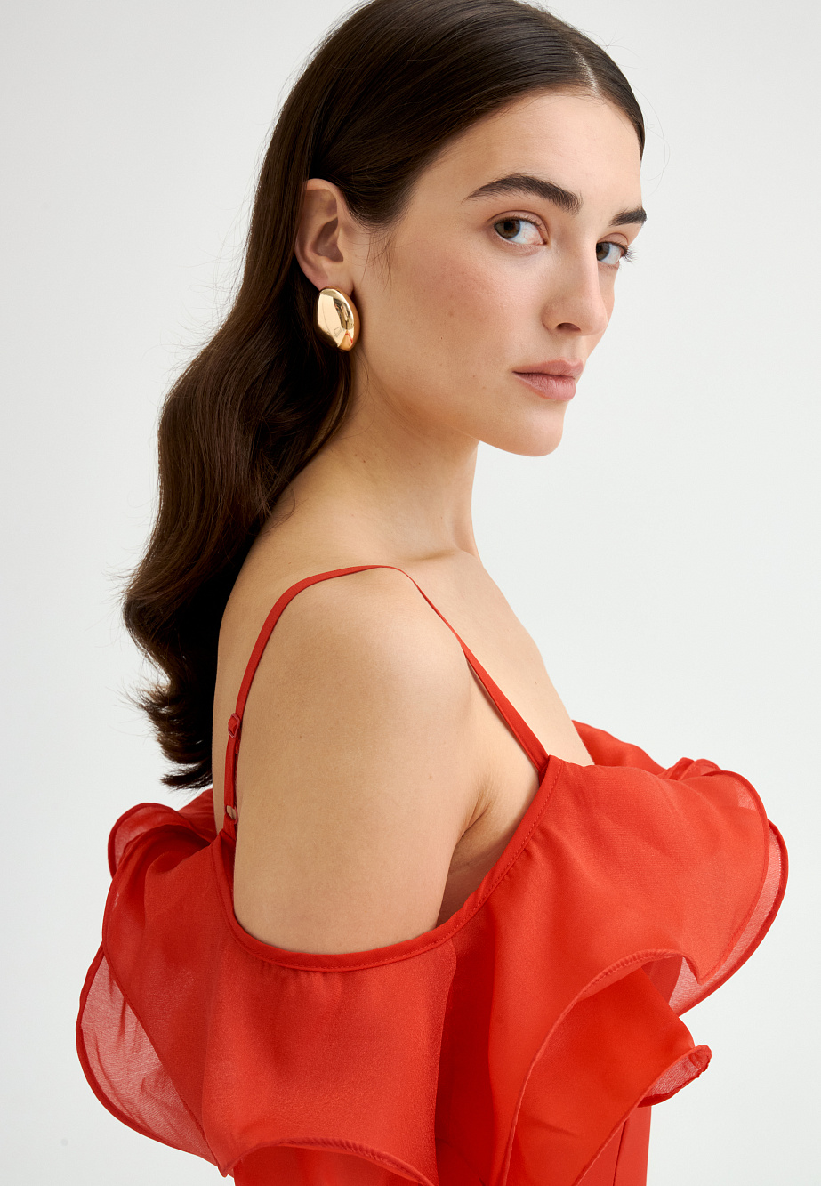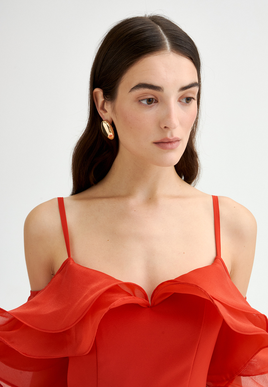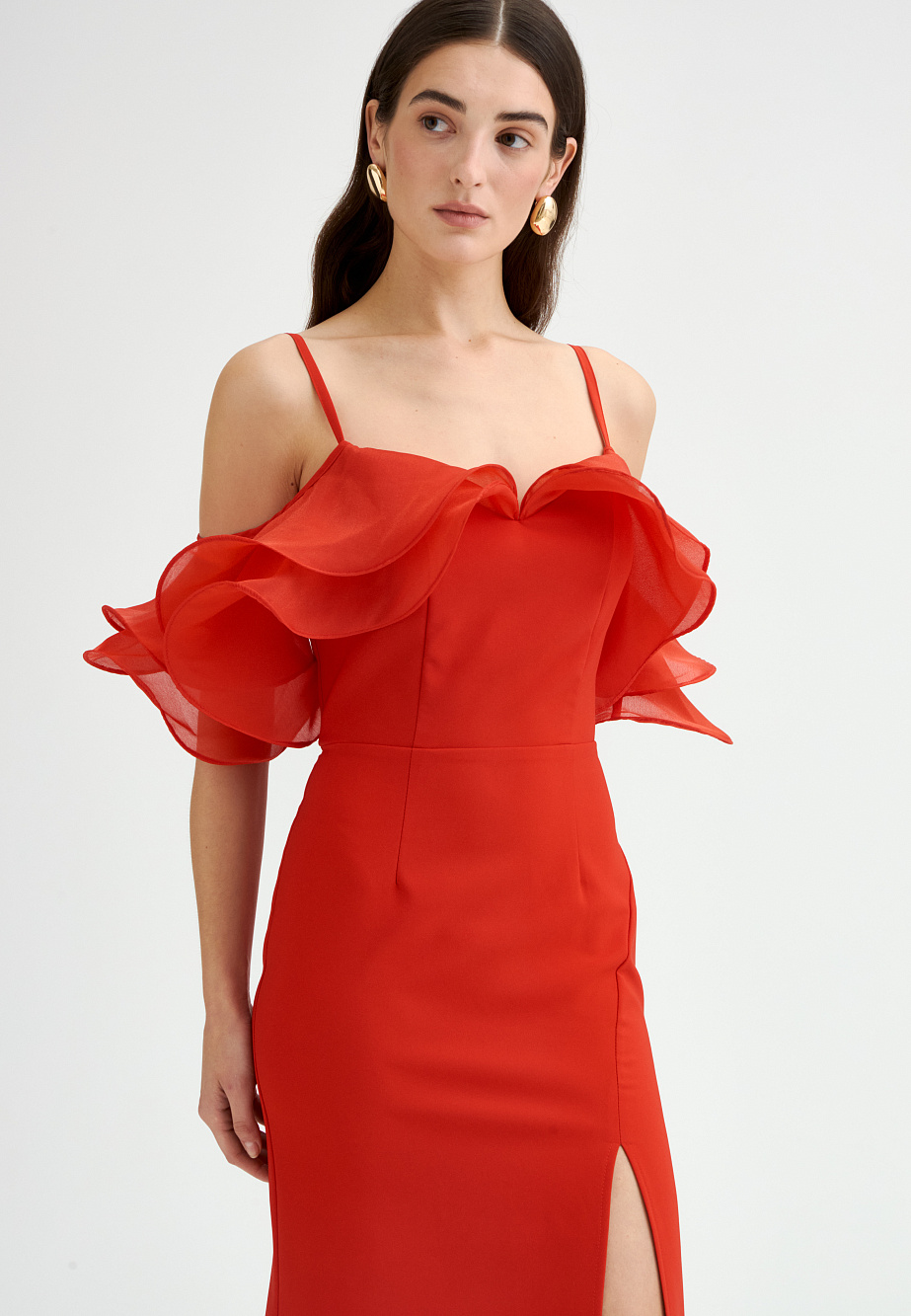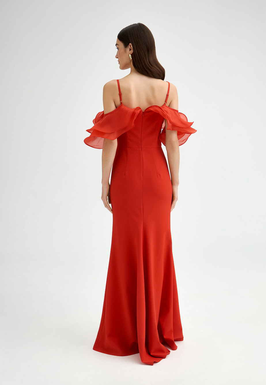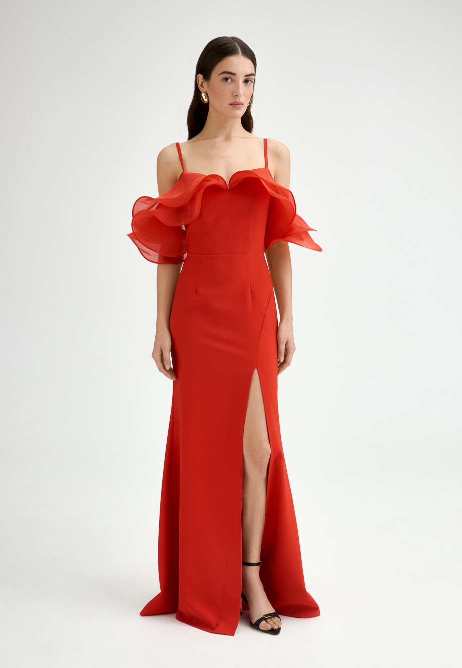 Платье на тонких бретелях с роскошными воланами из органзы и юбкой силуэта-годе с высоким разрезом по ноге выглядит очень элегантно и привлекает внимание. Силуэт в пол, воланы, нежно прикрывающие руки, создают незабываемый образ, идеально подходящий для самого торжественного события. Эластичная ткань и продуманная конструкция с мягкими чашечками на лифе придают ему изысканность и завершенность.