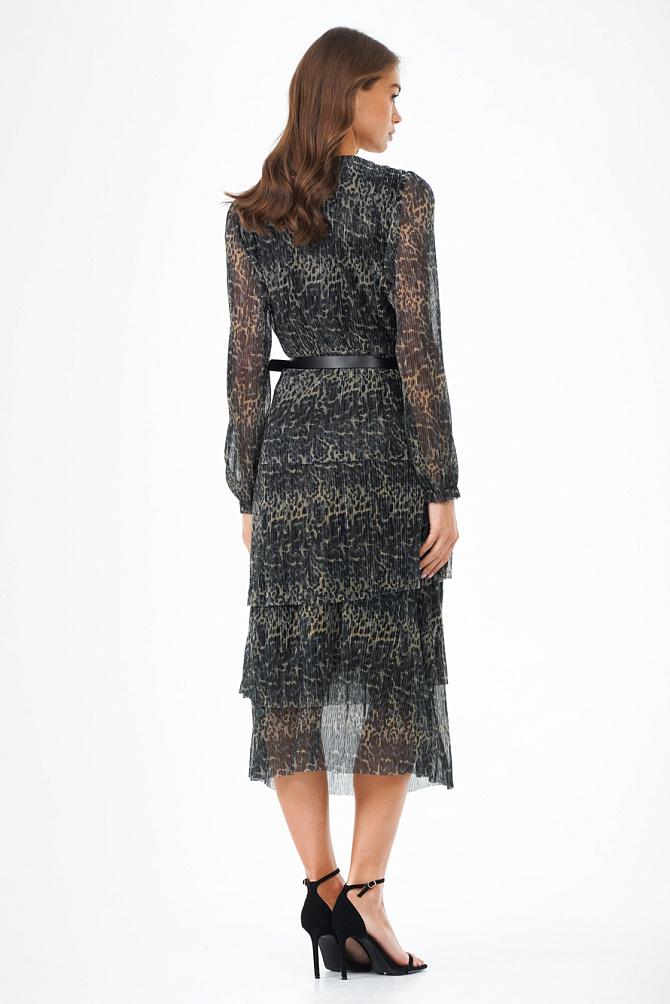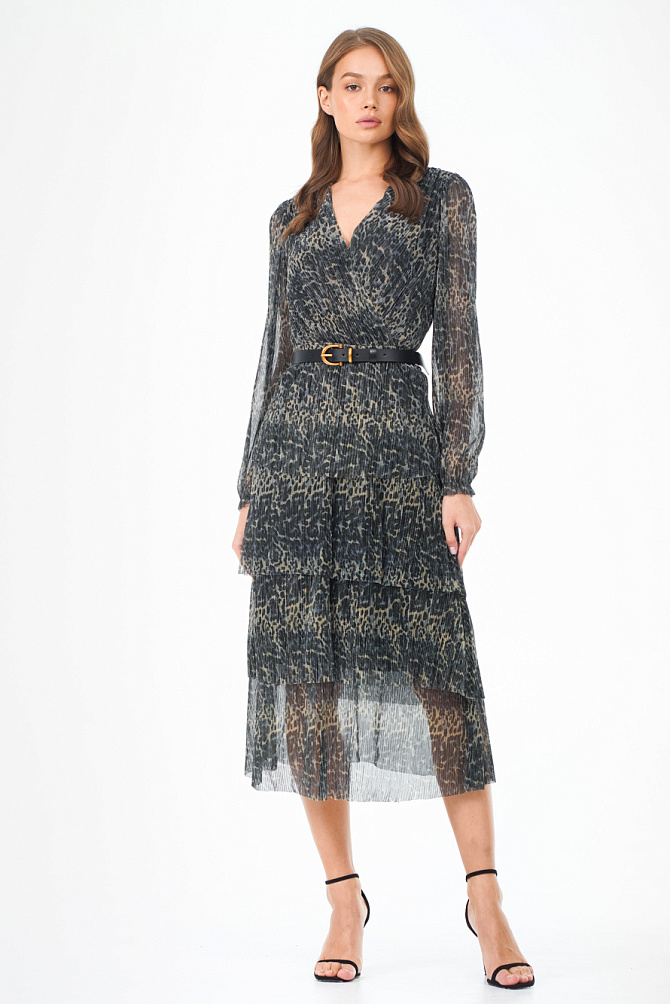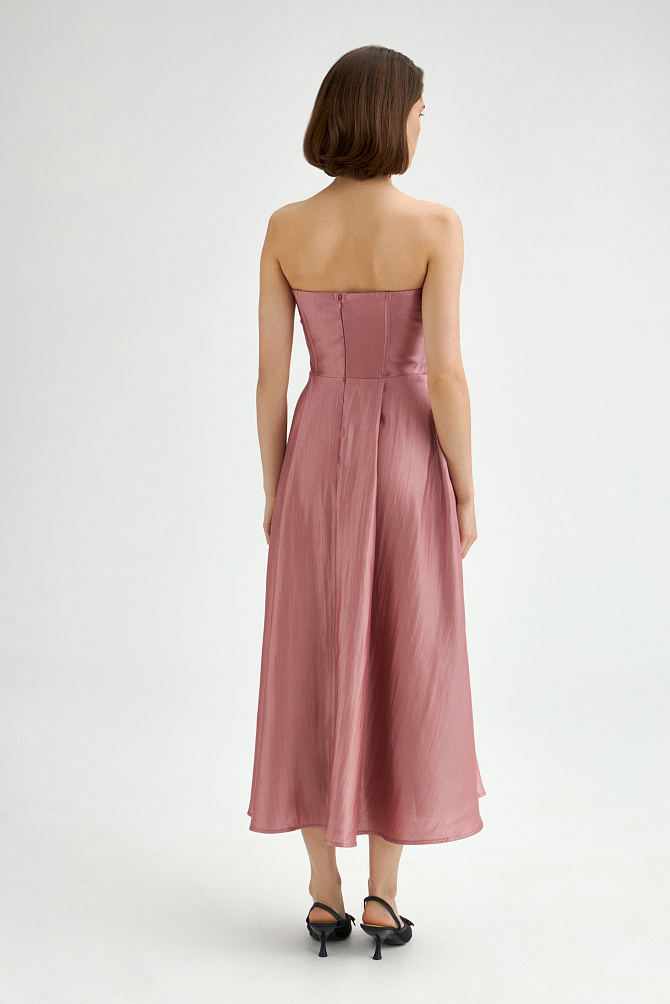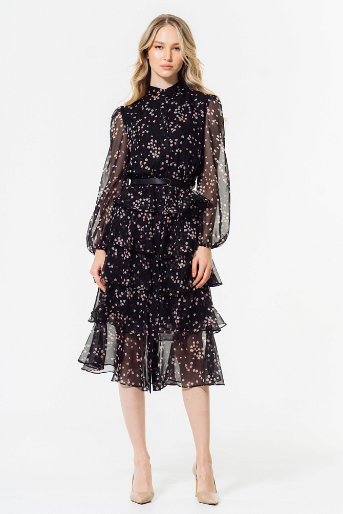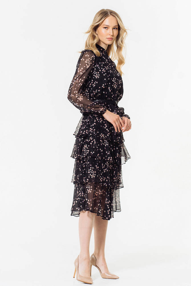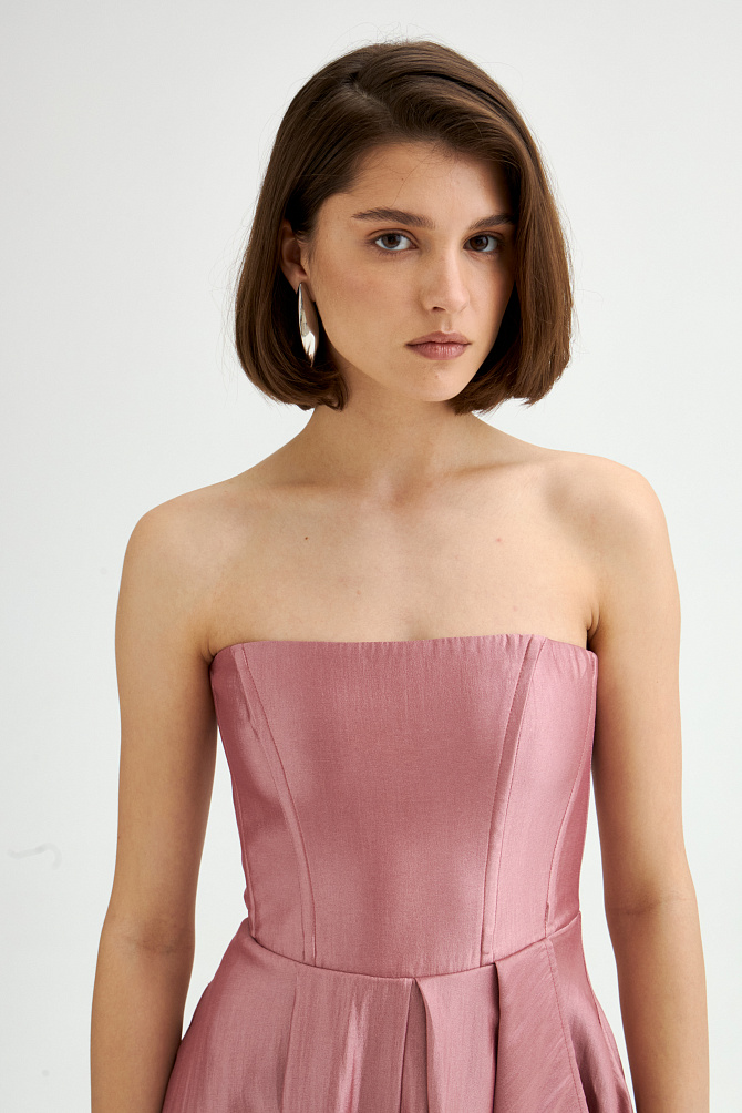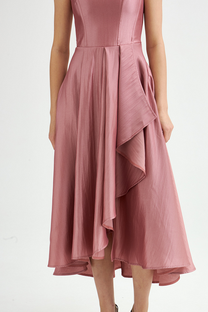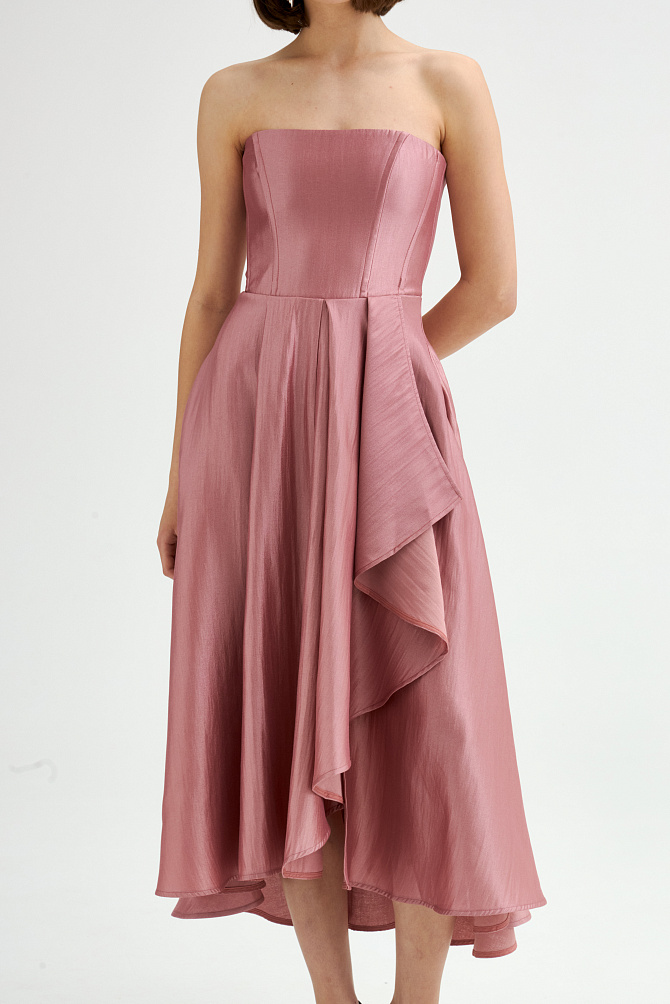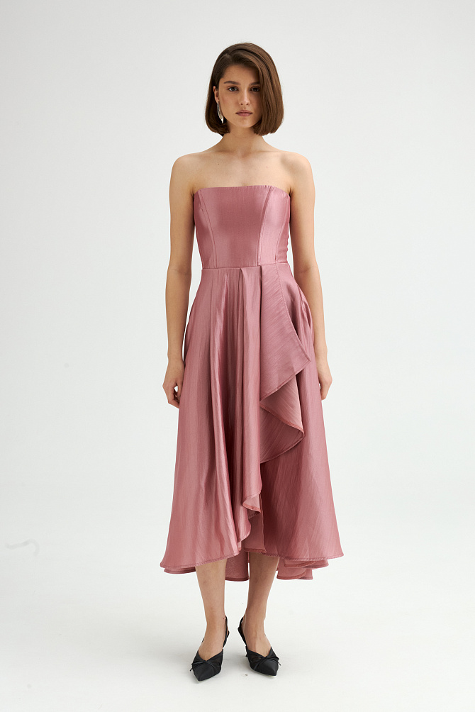 Платье на тонких бретелях с роскошными воланами из органзы и юбкой силуэта-годе с высоким разрезом по ноге выглядит очень элегантно и привлекает внимание. Силуэт в пол, воланы, нежно прикрывающие руки, создают незабываемый образ, идеально подходящий для самого торжественного события. Эластичная ткань и продуманная конструкция с мягкими чашечками на лифе придают ему изысканность и завершенность.