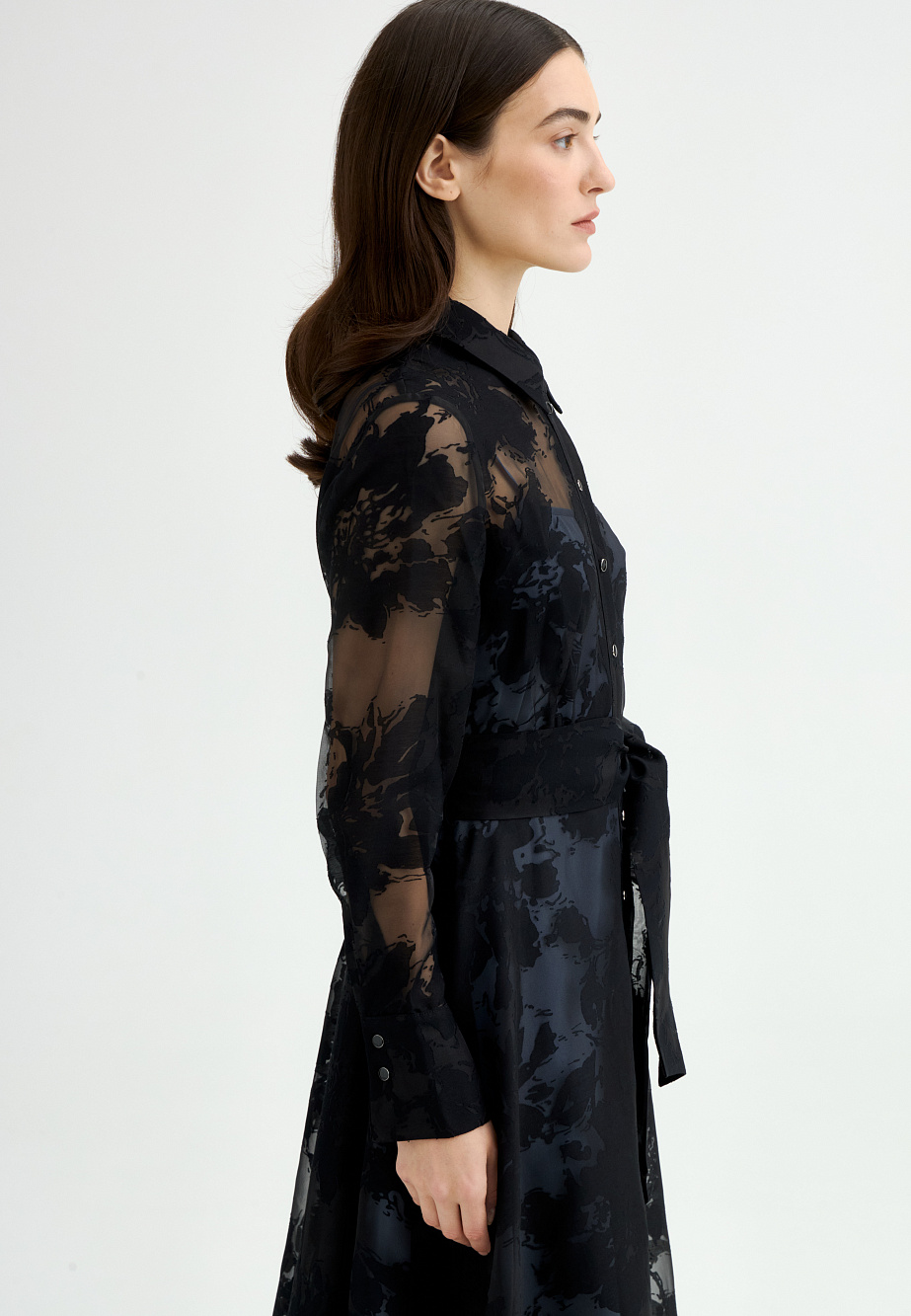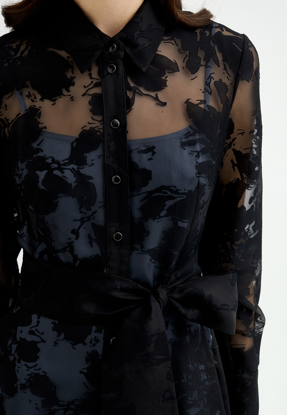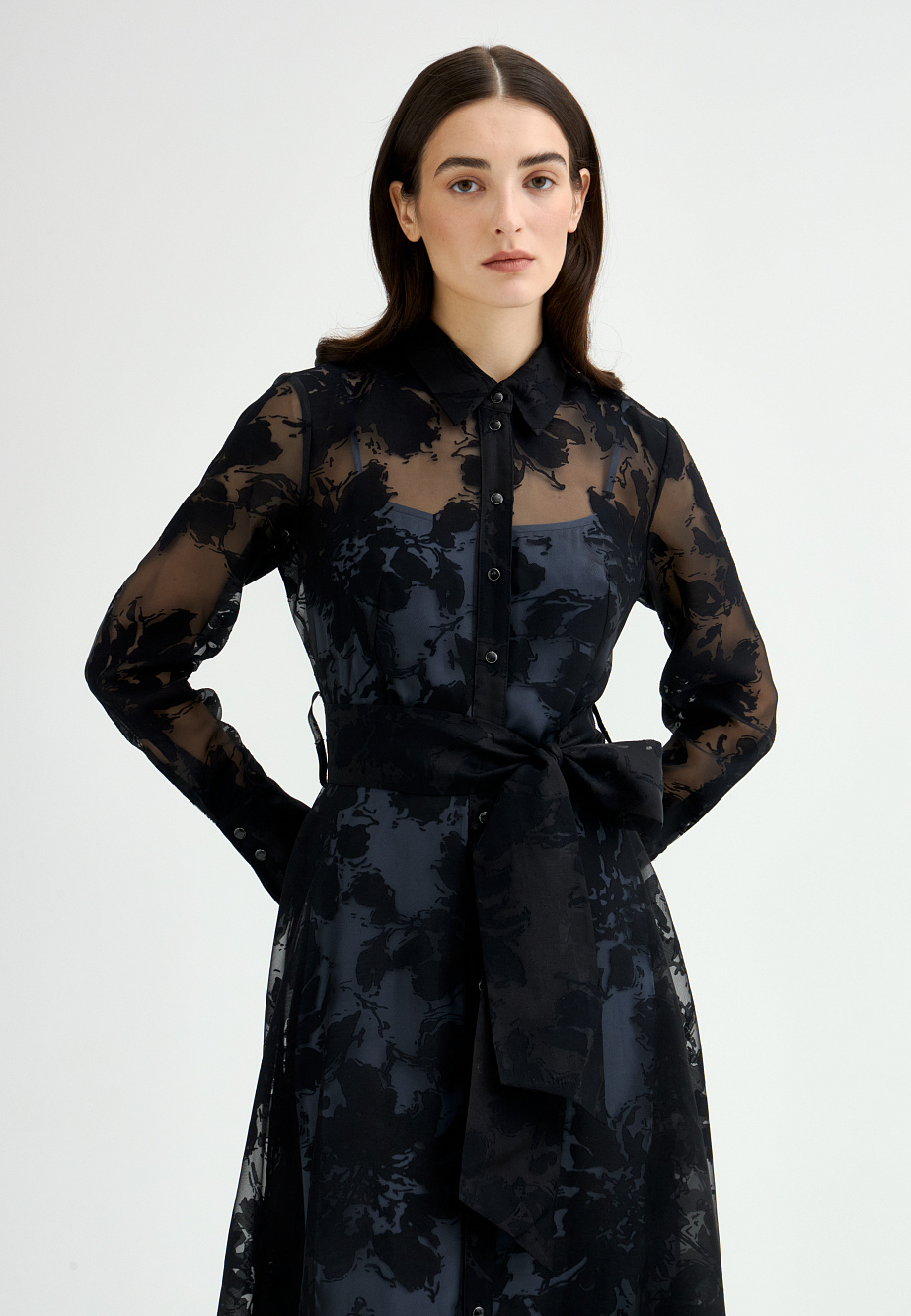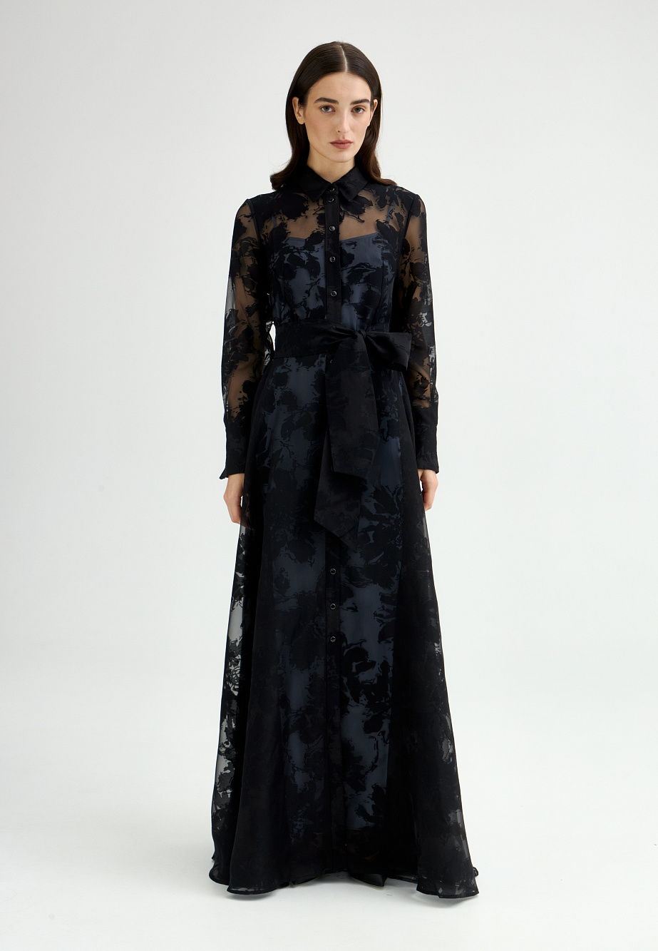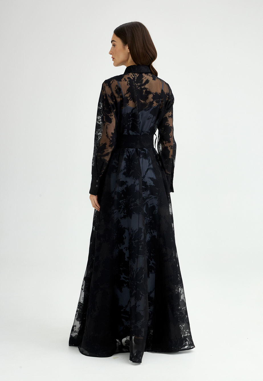 Эффектное и очень праздничное платье-рубашка из хлопковой органзы с эффектом деворе в актуальной длине макси. ( Devore — это техника обработки текстильного материала, благодаря которому на полотне образуется фактурный рисунок. Само слово происходит от от французского dévorer, что означает выжигать, выедать, вытравливать. Узоры и рисунки деворе образуются путём удаления, вытравливания химическим или другим способом части волокон, из которых состоит текстиль.) Модель состоит из основного платья из черной органзы и платья-комбинации из сатина на регулируемых бретелях цвета вечернего неба,что образует интересный микс цвета и фактур.Лаконичный верх платья в сочетании с роскошной объемной юбкой создают потрясающий эффект пропорций, а деликатный блеск органзы и выбитый принт смотрятся загадочно и очень притягательно.