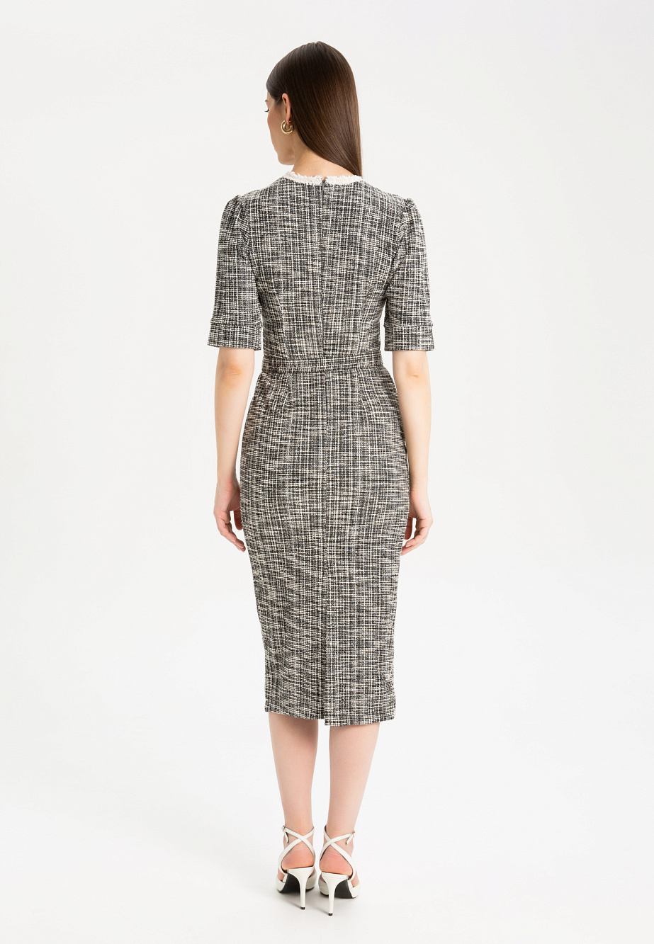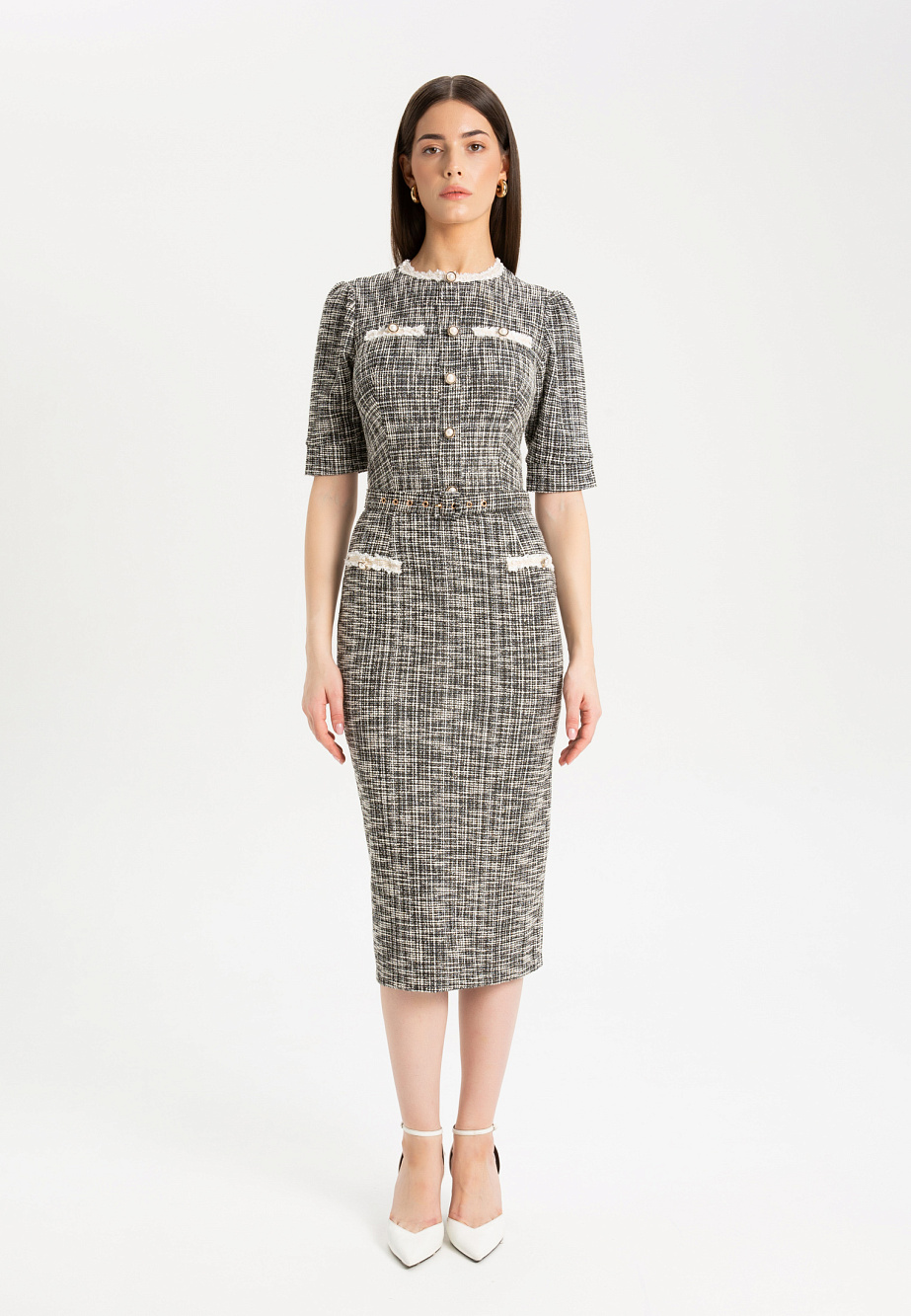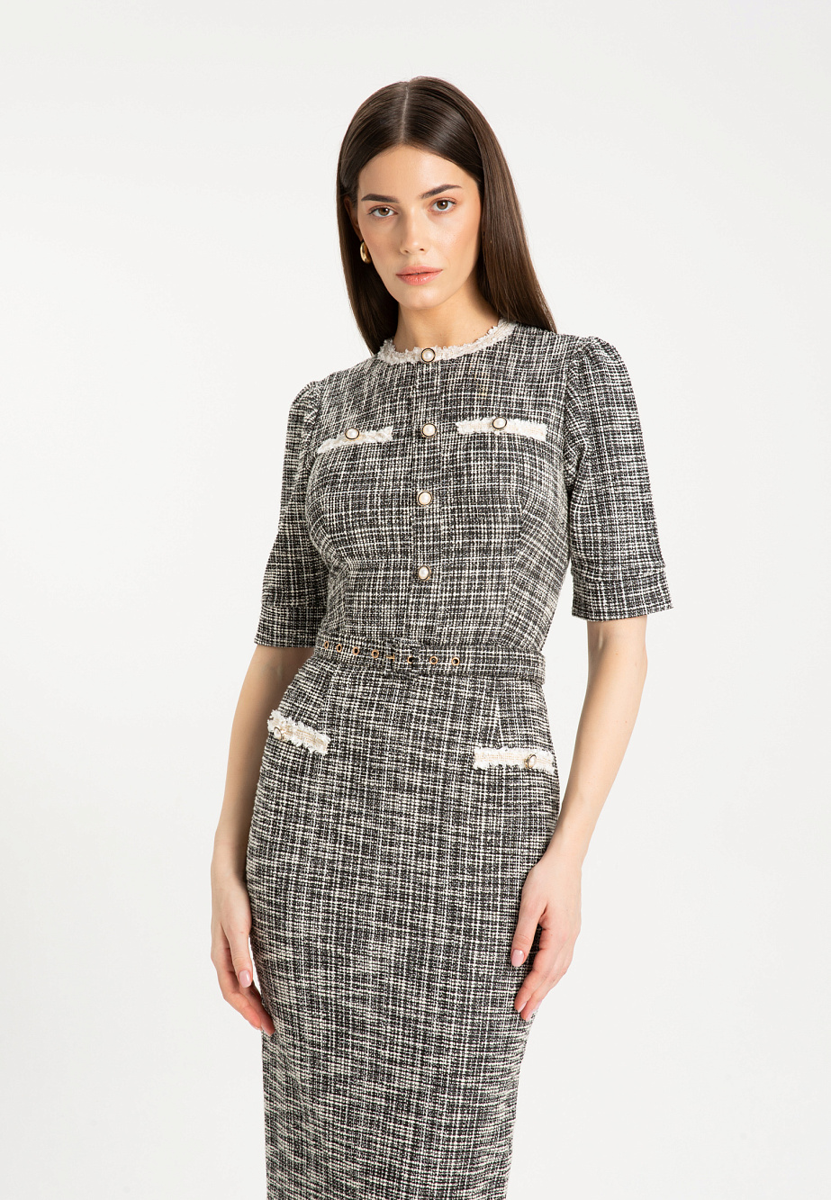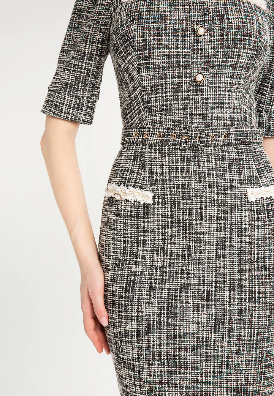 Платье в стиле Шанель из фактурного джерси под твид с хлопком идеально впишется в повседневный гардероб и поможет создать актуальный и респектабельный образ в духе Old money. Контрастная тесьма и жемчужные пуговицы добавляют аутентичности стилю, а идеальные пропорции и женственный силуэт делают образ современным и элегантным. Мягкий трикотажный подклад из модала дарит комфортные и приятные ощущения в течении всего дня.