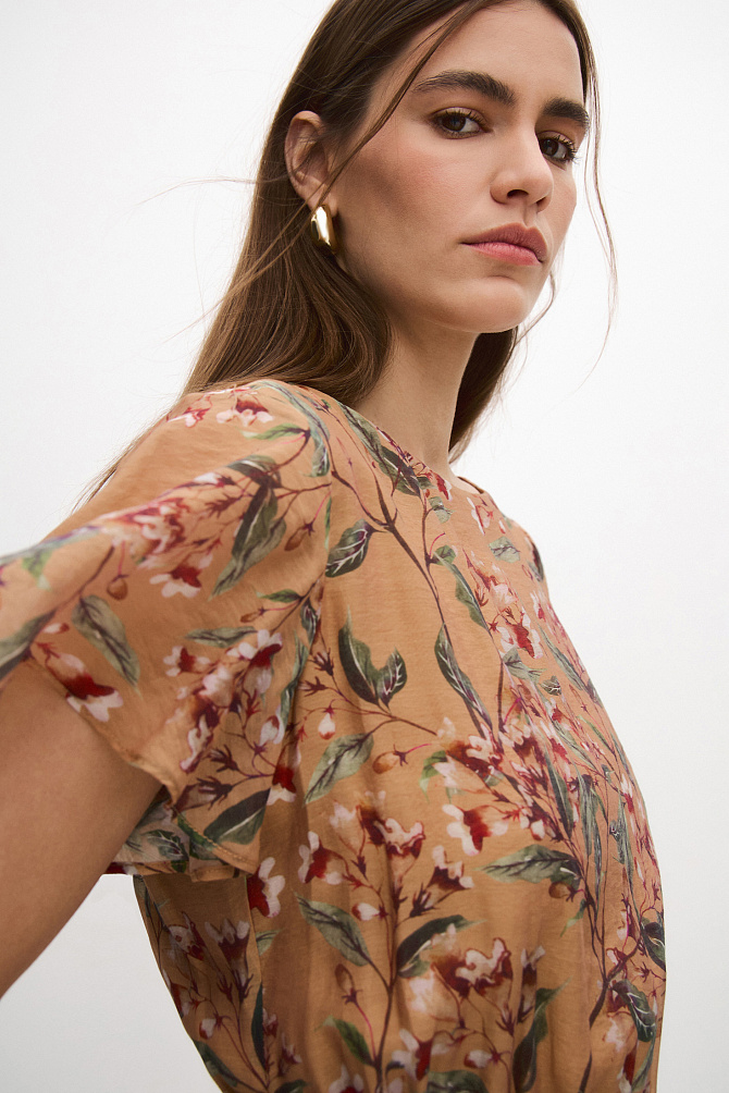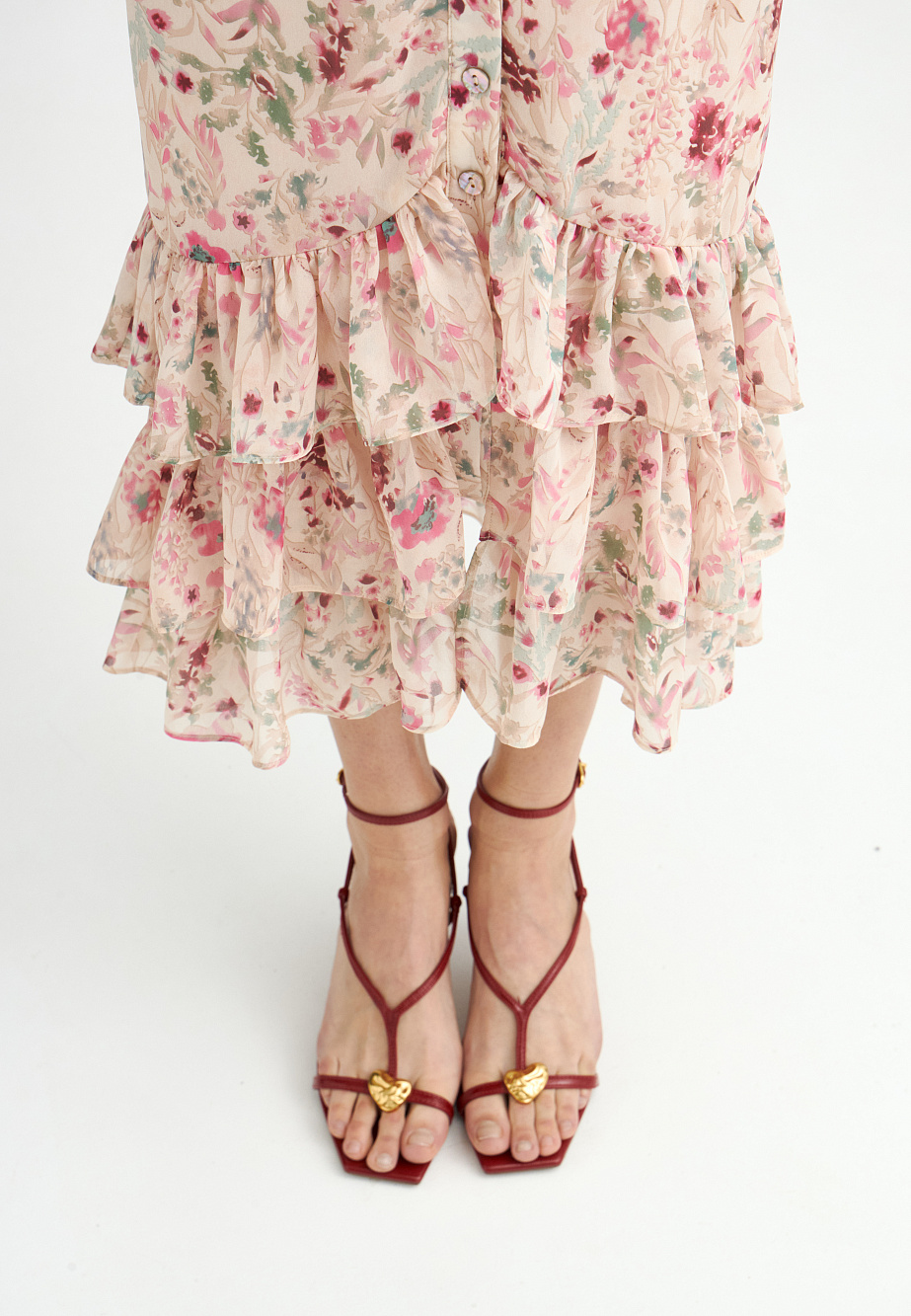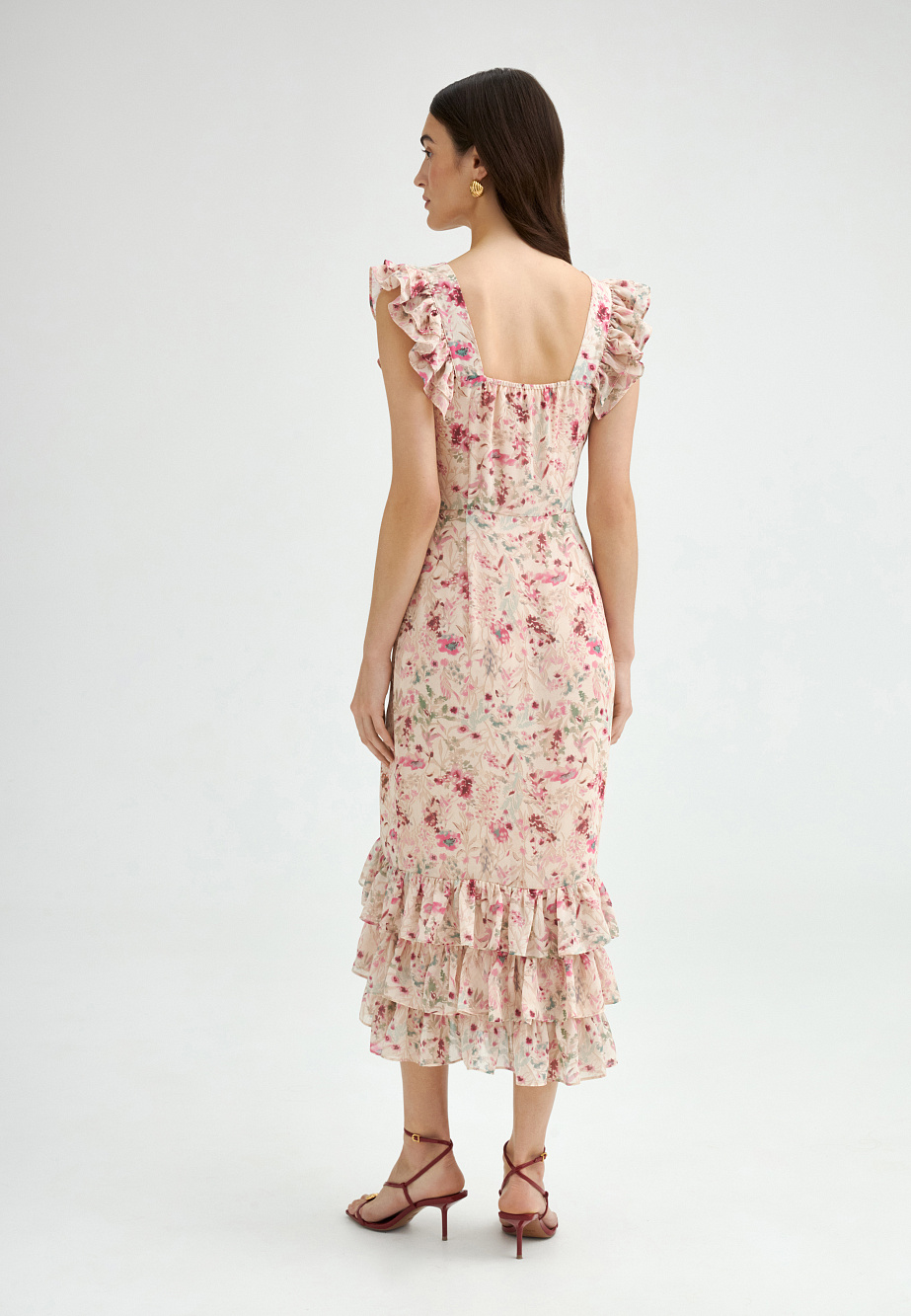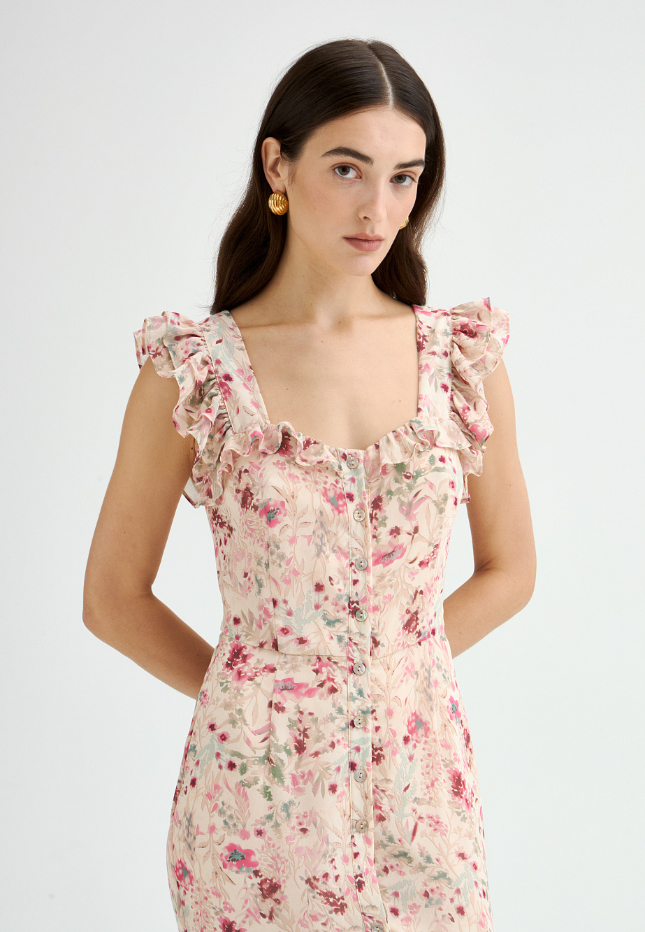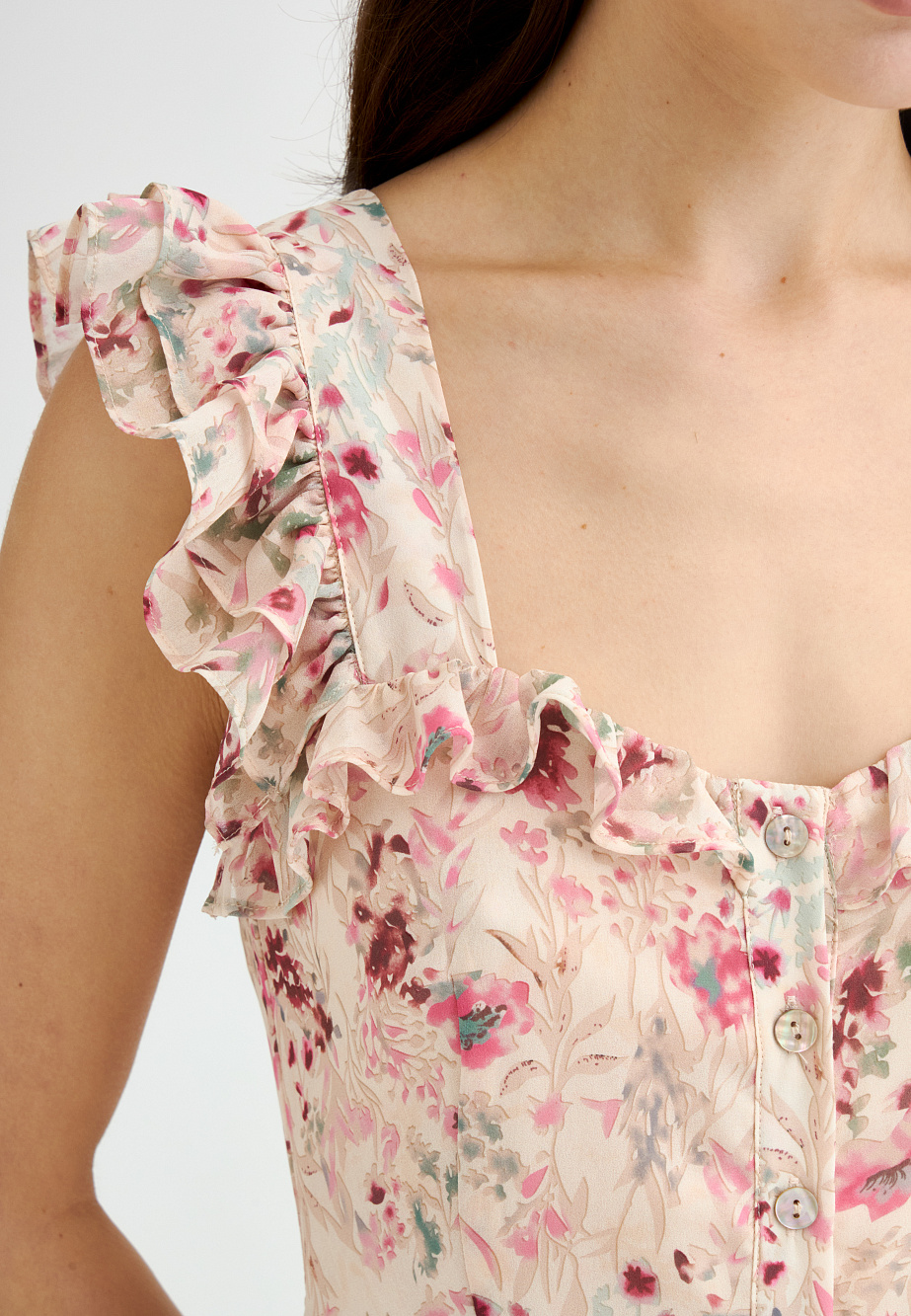 Летнее платье-сарафан из крепового шифона станет незаменимым в вашем гардеробе. Рюши на бретелях и лифе подчеркивают приталенный силуэт, а каскад по низу платья придает дополнительную динамику. Застежка на пуговицы из натурального перламутра облегчает надевание и позволяет регулировать разрез по низу для удобства шага. Подкладка из тонкого материала дарит ощущение легкости при носке.
