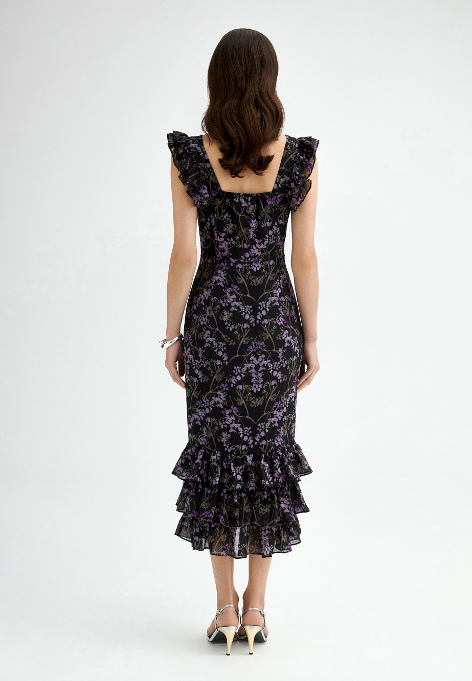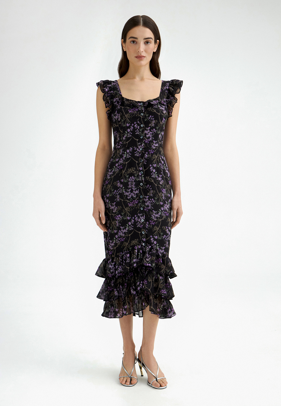 Летнее платье-сарафан из крепового шифона станет незаменимым в вашем гардеробе. Рюши на бретелях и лифе подчеркивают приталенный силуэт, а каскад по низу платья придает дополнительную динамику. Застежка на пуговицы из натурального перламутра облегчает надевание и позволяет регулировать разрез по низу для удобства шага. Подкладка из тонкого материала дарит ощущение легкости при носке.