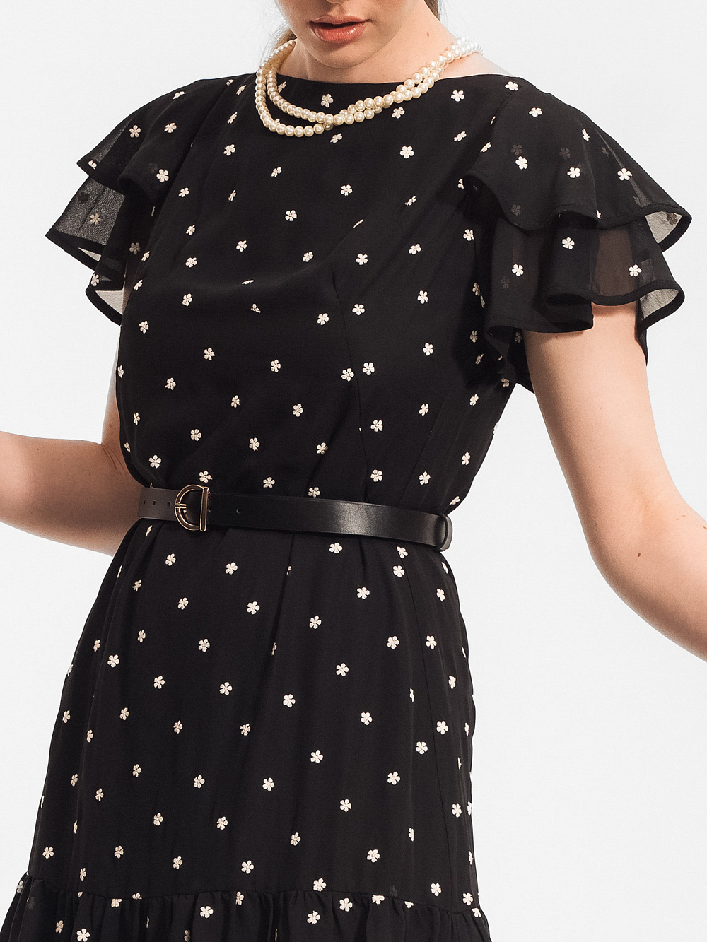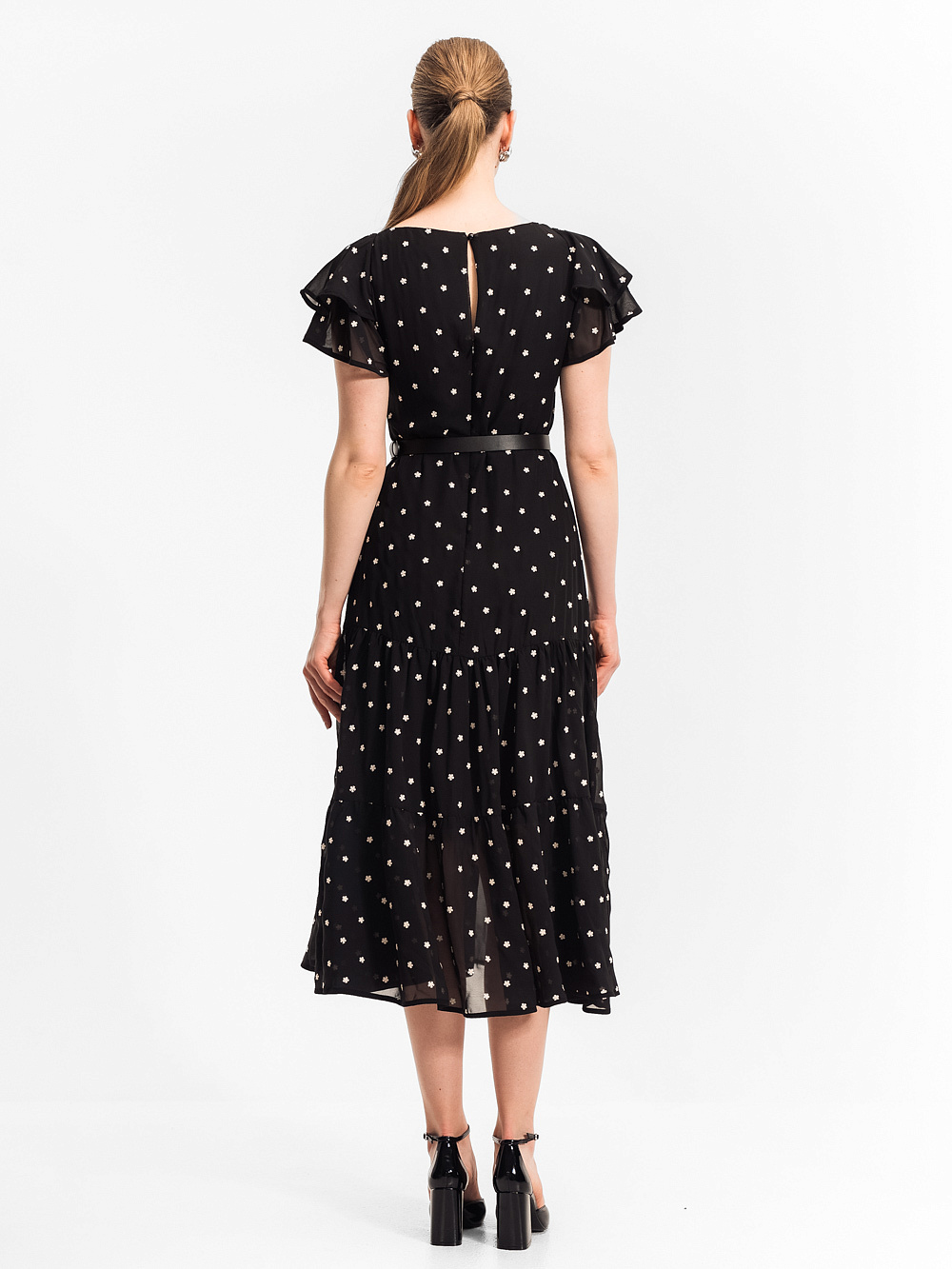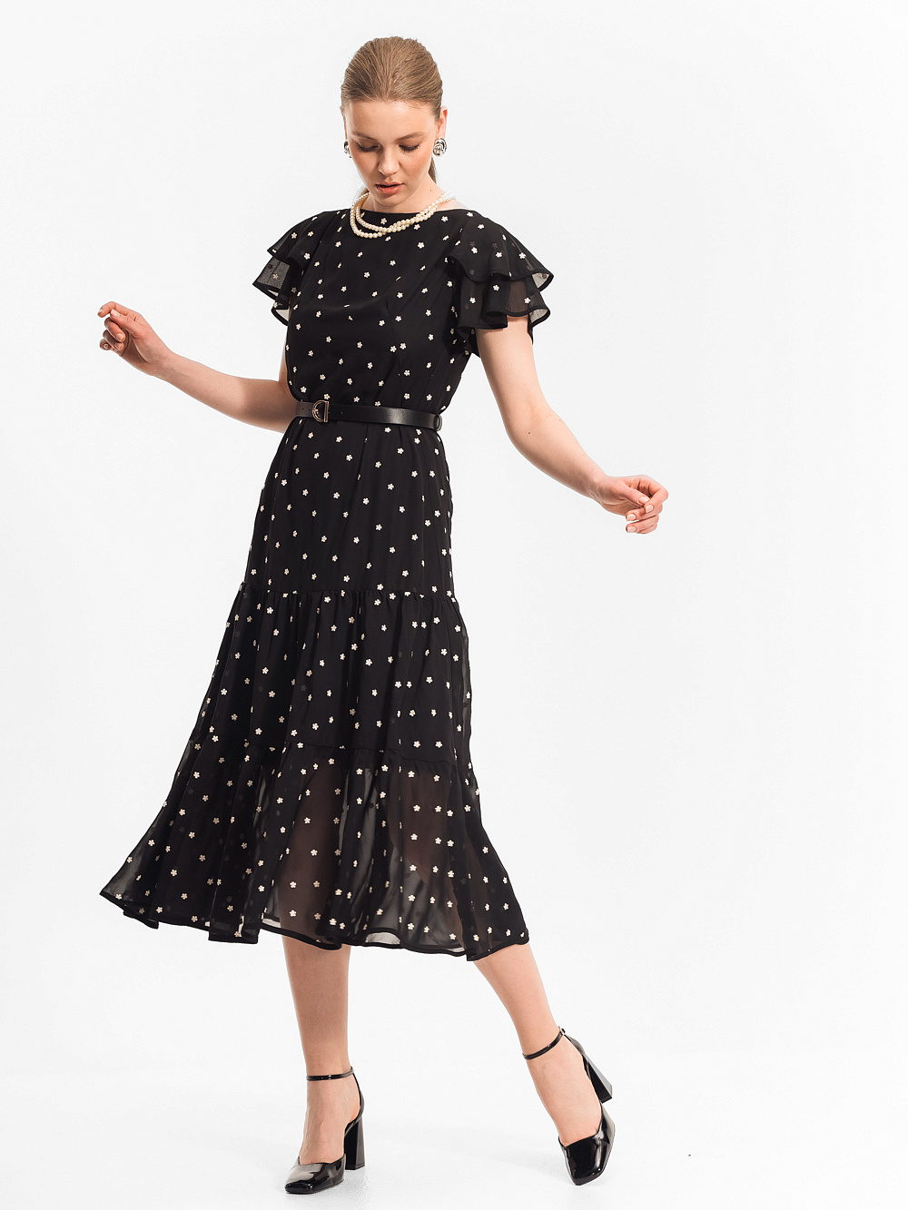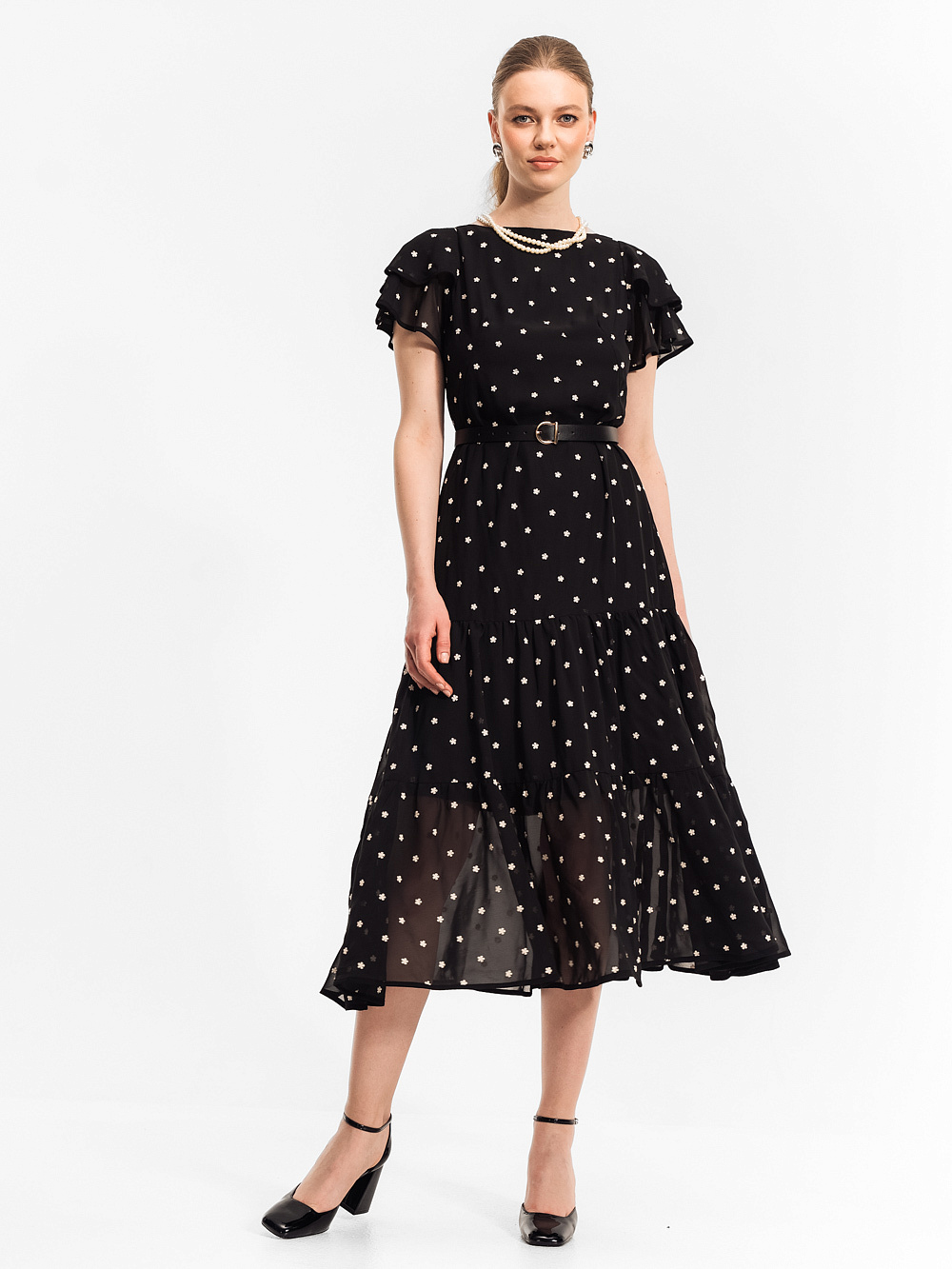 Шифоновое платье с вышивкой, свободного силуэта, с кожаным ремнем для повседневной жизни и для особенного случая. Двойные рукава-крылышки и роскошная ярусная юбка придают романтический флер и женственный образ. Платье с отдельным подкладом-комбинацией из поливискозы. Современные пропорции по длине и объемам, фактурная ткань и ремень из натуральной кожи создают целостный и гармоничный образ.