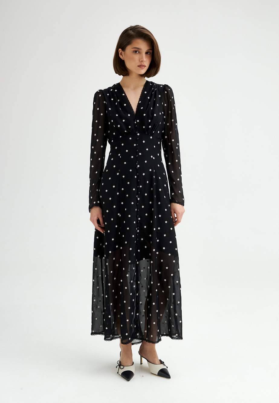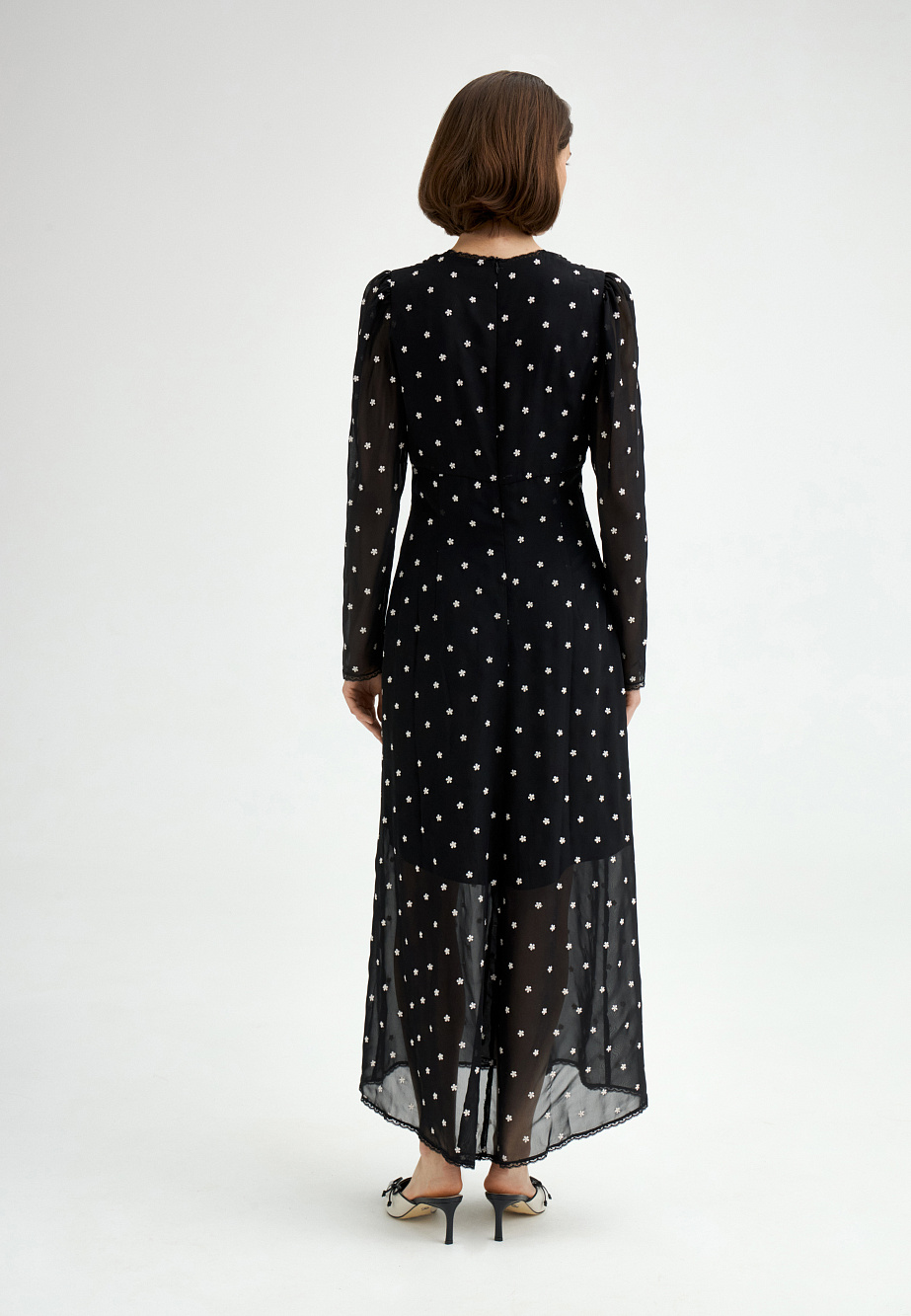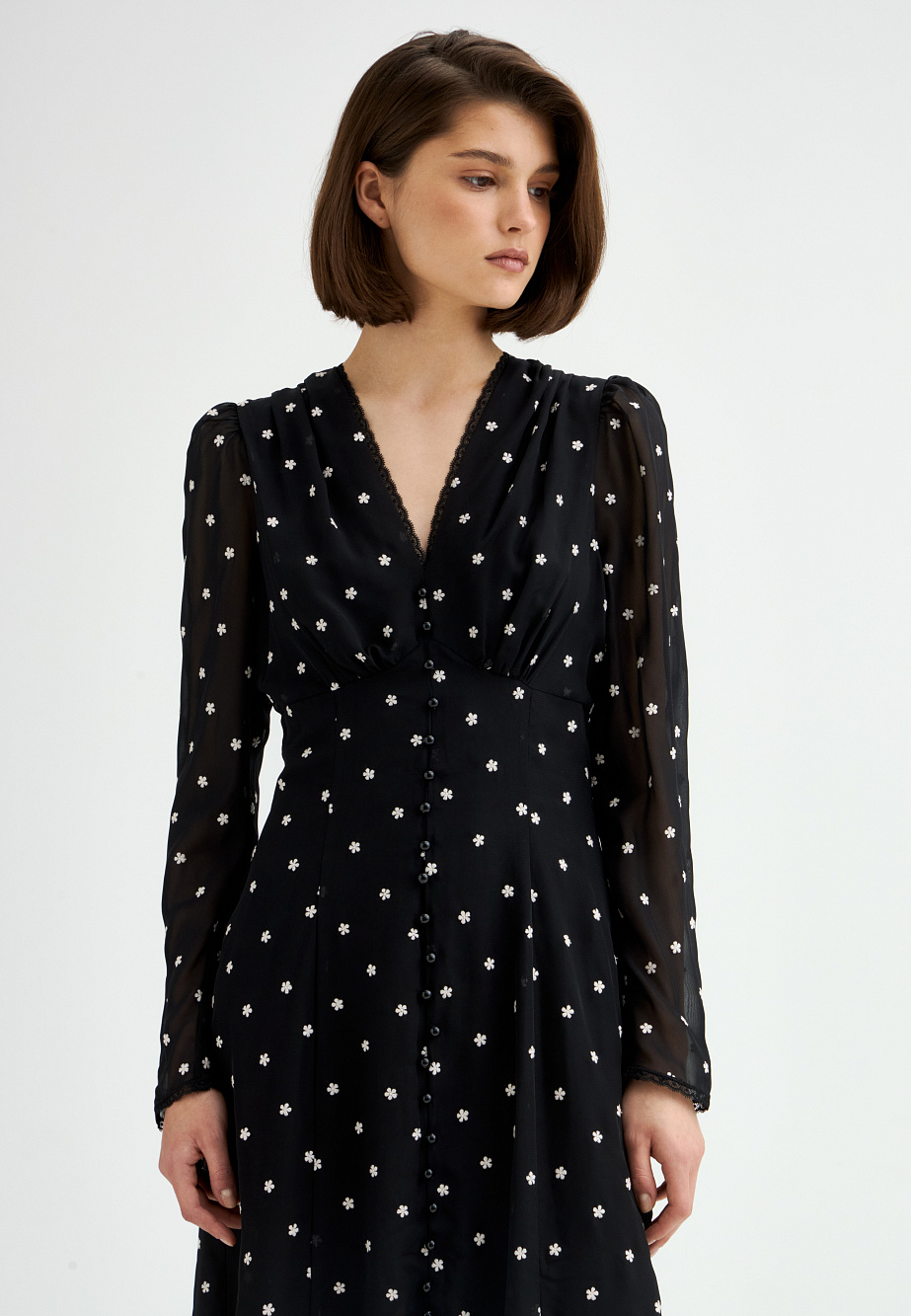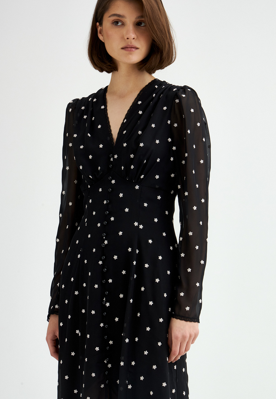 Шифоновое платье с вышивкой и отделкой тонким кружевом выполнено в ретро-стиле. Модные рукава с буфами, подрез со сборкой под грудью и V-образный вырез создают женственный классический образ, который будет актуален вне зависимости от трендов. Полуприлегающий силуэт и выразительная фактура ткани с деликатными объемами делают это платье универсальным выбором на каждый день.
