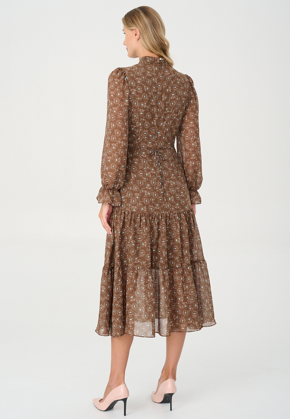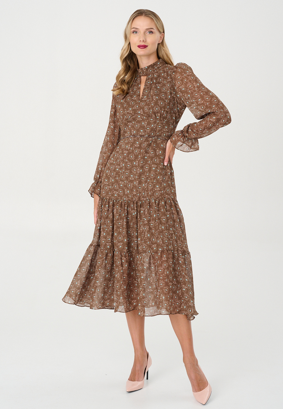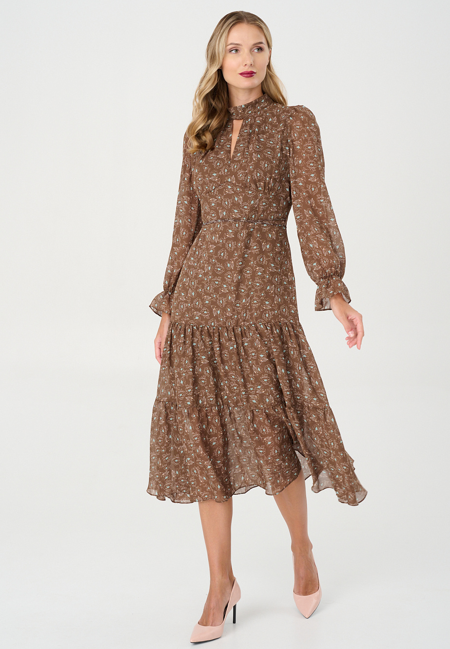 Шифоновое платье в актуальном стиле вестерн прекрасно впишется в осенний гардероб и поможет создать новые интересные образы в сочетании с актуальными сапогами- казаками, сумкой из замши и аксессуарами в стиле бохо-шик. В этом платье множество деталей,которые хочется рассматривать -воротник-стойка,вырез на груди, подрез под грудью с драпировкой,роскошный рукав с воланами по низу, юбка ярусами,тонкий пояс для фиксации на талии. Красивое цветовое сочетание шоколадного с цветом тифани, обилие воланов и драпировок, характерные для стиля вестерн выберет для себя романтичная натура,которая предпочитает необычные и нестандартные образы. Изящный силуэт, комфортная посадка и вискозный подклад подарят ощущение легкости и невесомости в течении всего дня.