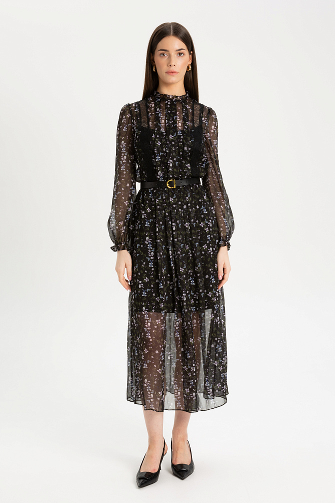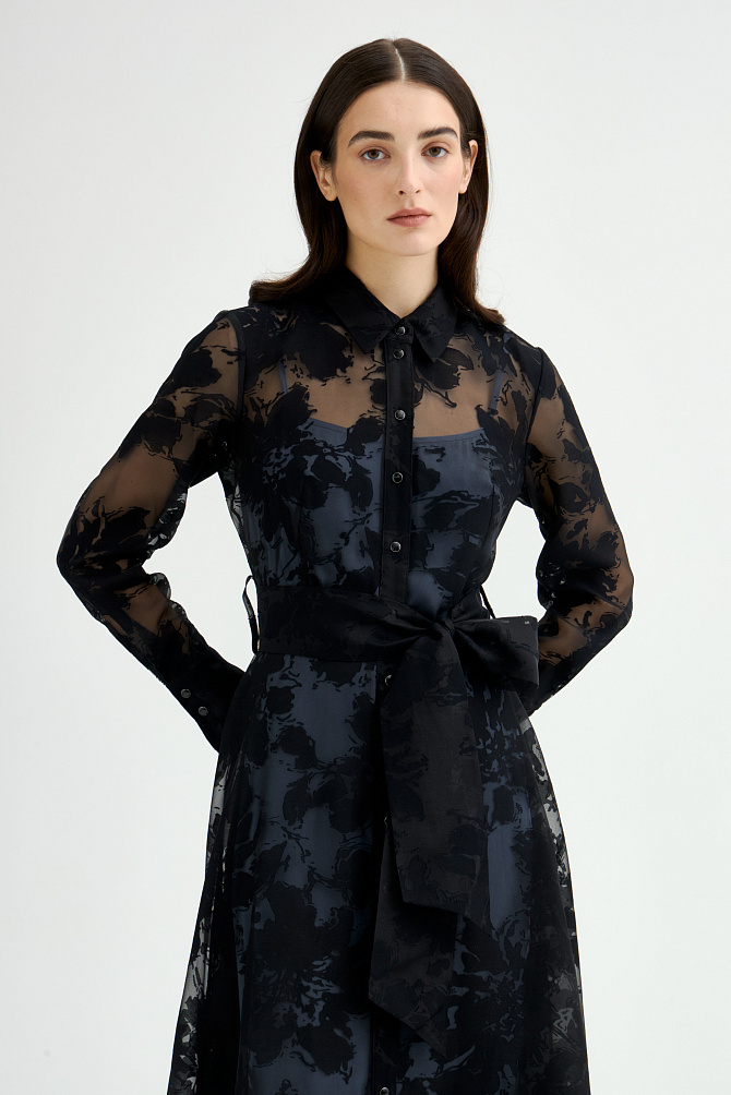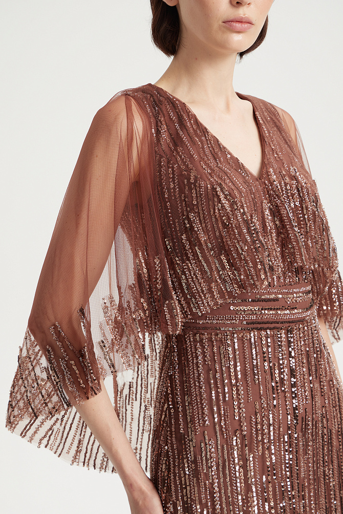 Шикарное платье с глубоким вырезом декольте и прозрачными вставками сбоку по лифу смотрится сексуально и привлекательно.Форма лифа как 2 лепестка,нежно обнимающие фигуру.Расклешенная юбка в пол позволяет удобно двигаться и танцевать. Все платье переливается блеском глиттера из звезд. На талии вышивка стразами ручной работы.