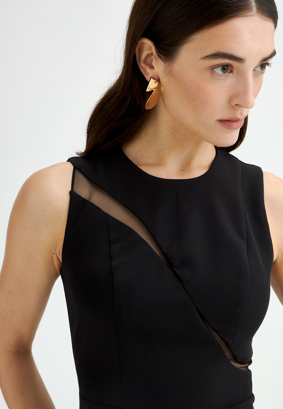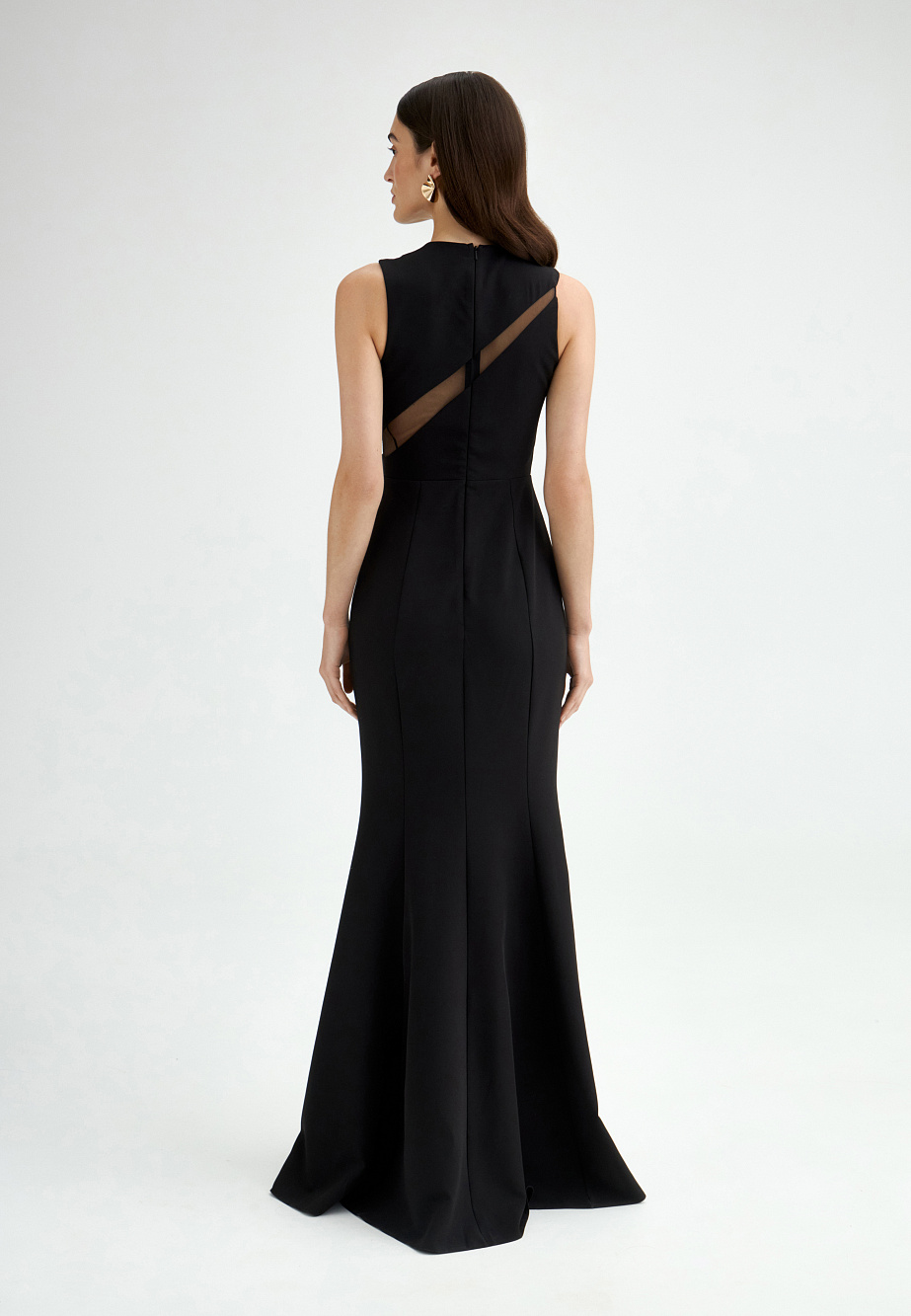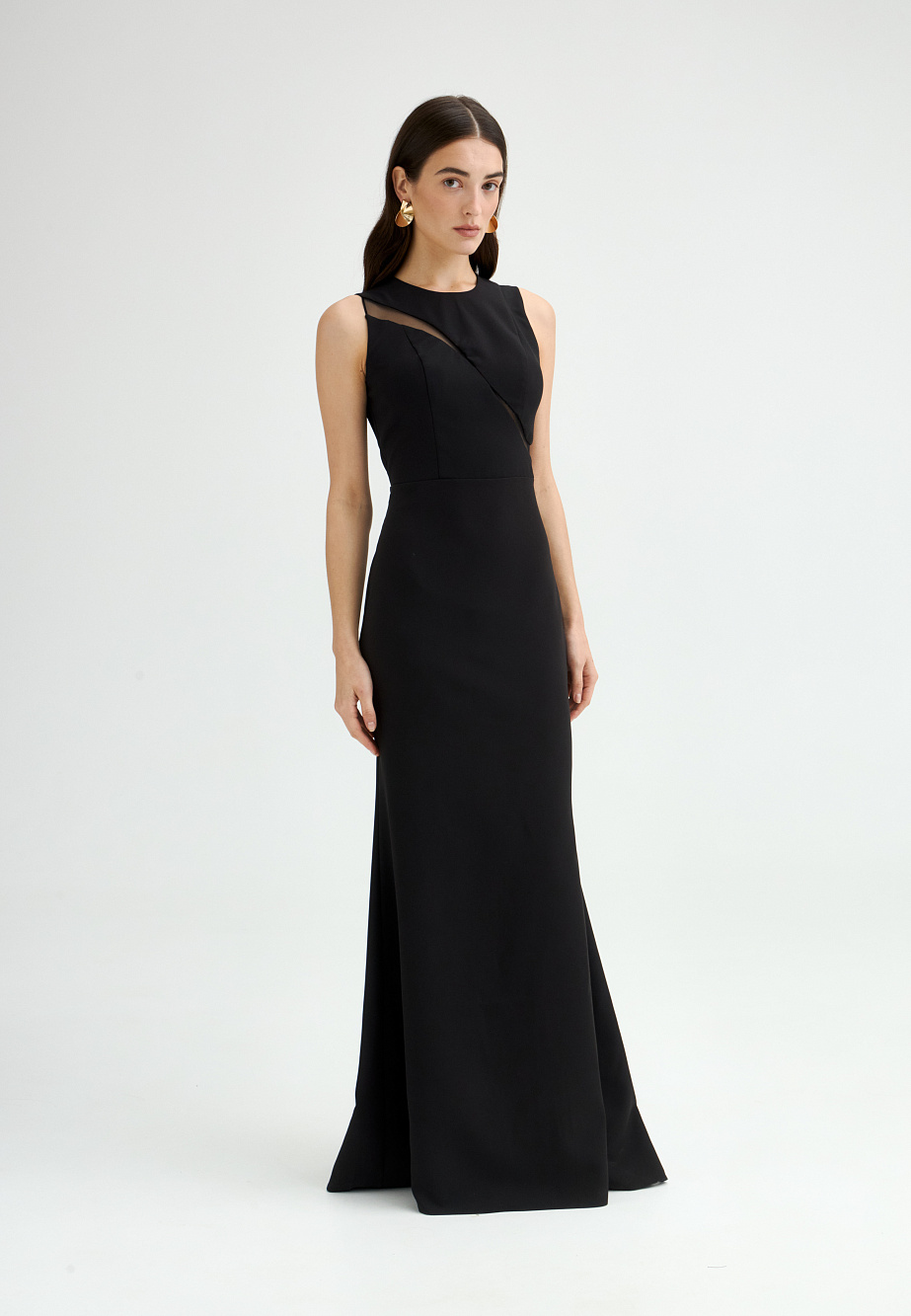 Лаконичное платье с асимметричным кроем и выразительными деталями создано для тех, кто ценит индивидуальность и женственность. Плотная эластичная ткань подчеркивает силуэт, а вставки из полупрозрачной сетки создают интригующий визуальный акцент. Мягкие чашечки и эластичная подкладка на лифе обеспечивают идеальную посадку, а удлинённый силуэт юбки-годе с легким шлейфом и чуть завышенной талией визуально стройнит фигуру, придавая ей особую грацию. Идеальный вариант для особого случая. Модель вне времени, которая надолго задержится в вашем гардеробе.