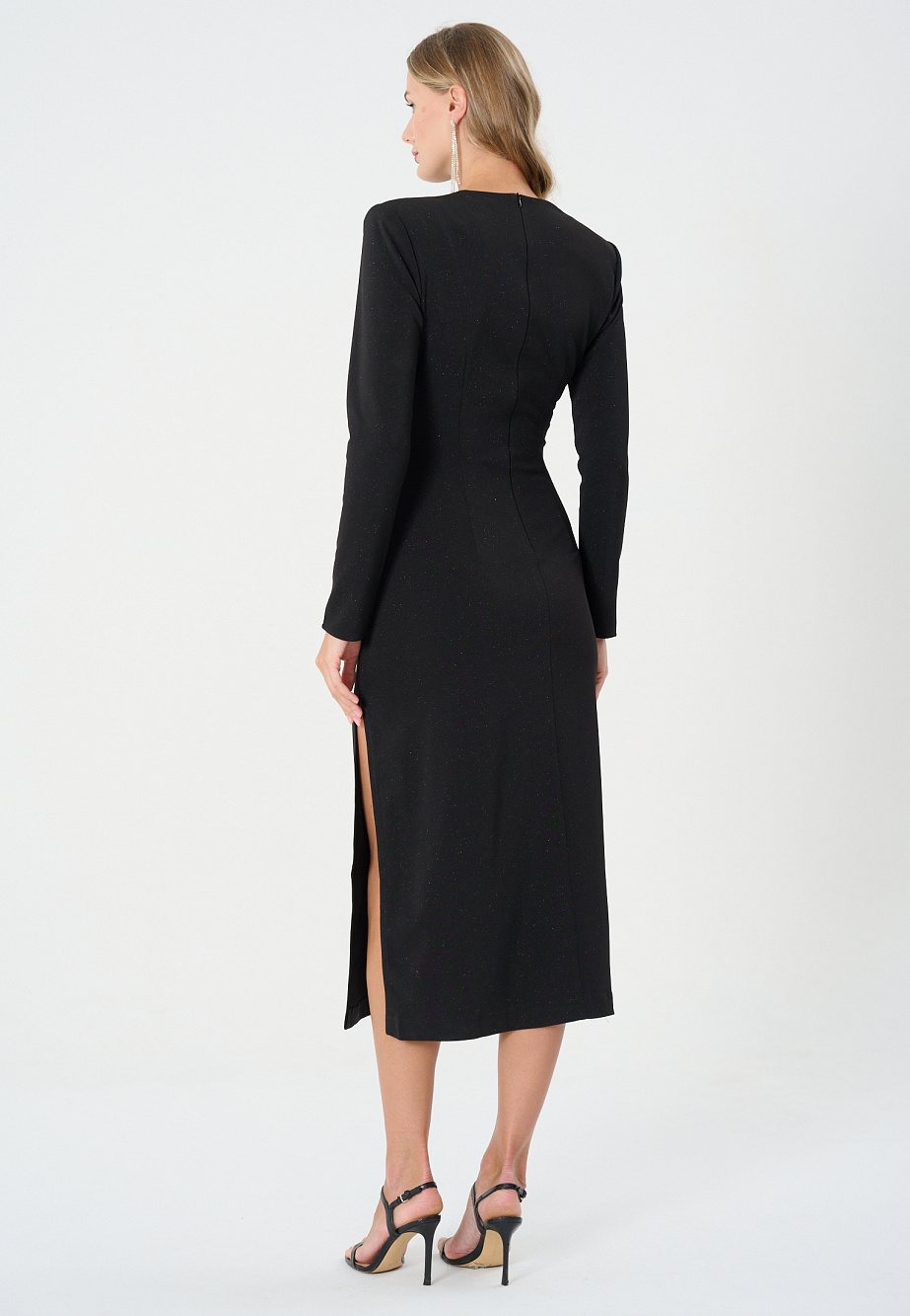 Трикотажное платье с деликатным блеском люрексовой нити и небольшим ассиметричным вырезом ,которое можно надеть как в будни,так и на значимые события. Платье отличается прекрасной посадкой и комфортом.Ассиметричная драпировка на талии и заведенный боковой шов с разрезом по низу украшают это платье и делают его нетривиальным. В духе современности платье с небольшими подплечниками, что делает его акцентным.