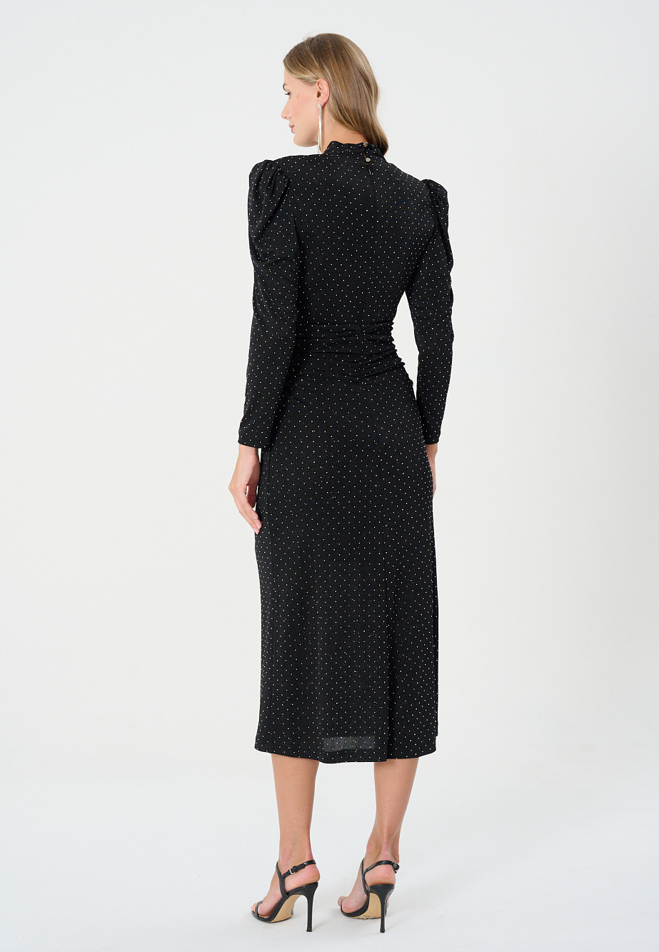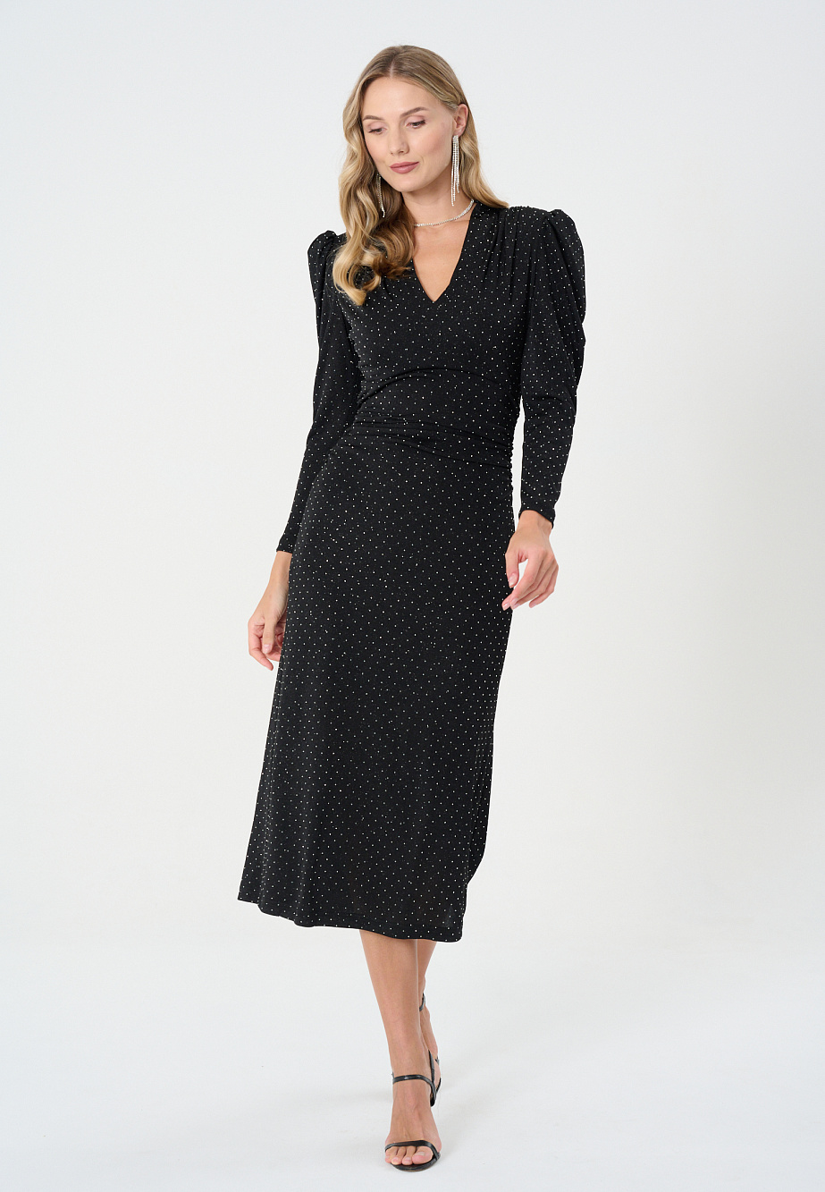 Трикотажное платье с россыпью страз привлечет внимание своим эффектным кроем и роскошным блеском. Если хочется сиять, то в этом платье! Мягкая эластичная ткань позволяет сделать щедрые сборку по плечам, на талии и буфы на рукавах и стилизовать платье под 80-е годы,с акцентом на плечи и драгоценную фактуру. Цельнокроенная стойка переходит в V-образный вырез, драпировка на талии утянет вас до идеальных форм,а мягкая форма юбки позволит уверенно себя чувствовать, наслаждаясь праздничной атмосферой. А дизайнеры уже позаботились о вашем комфорте и модном образе.