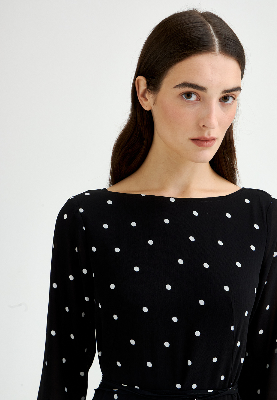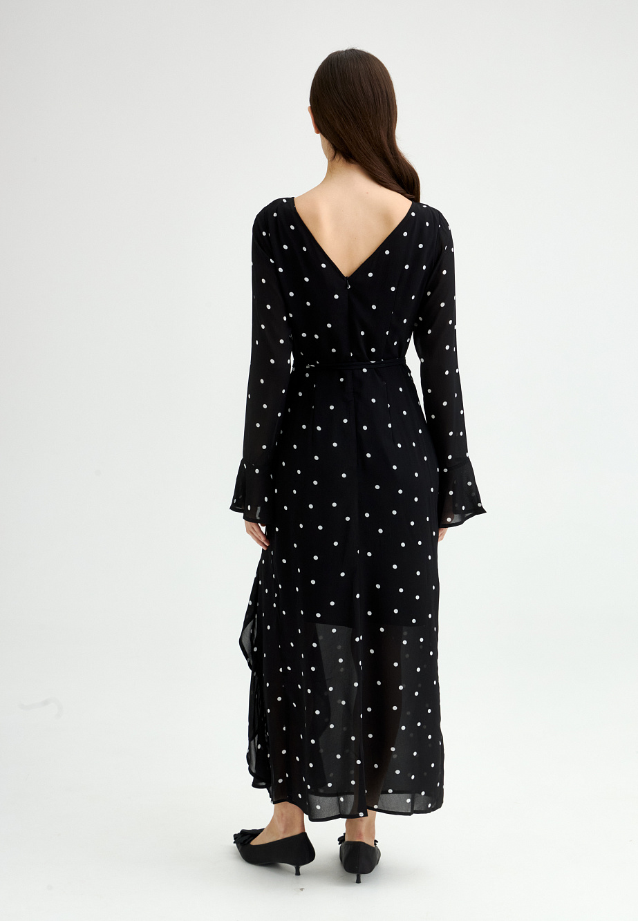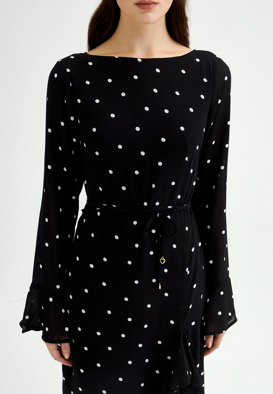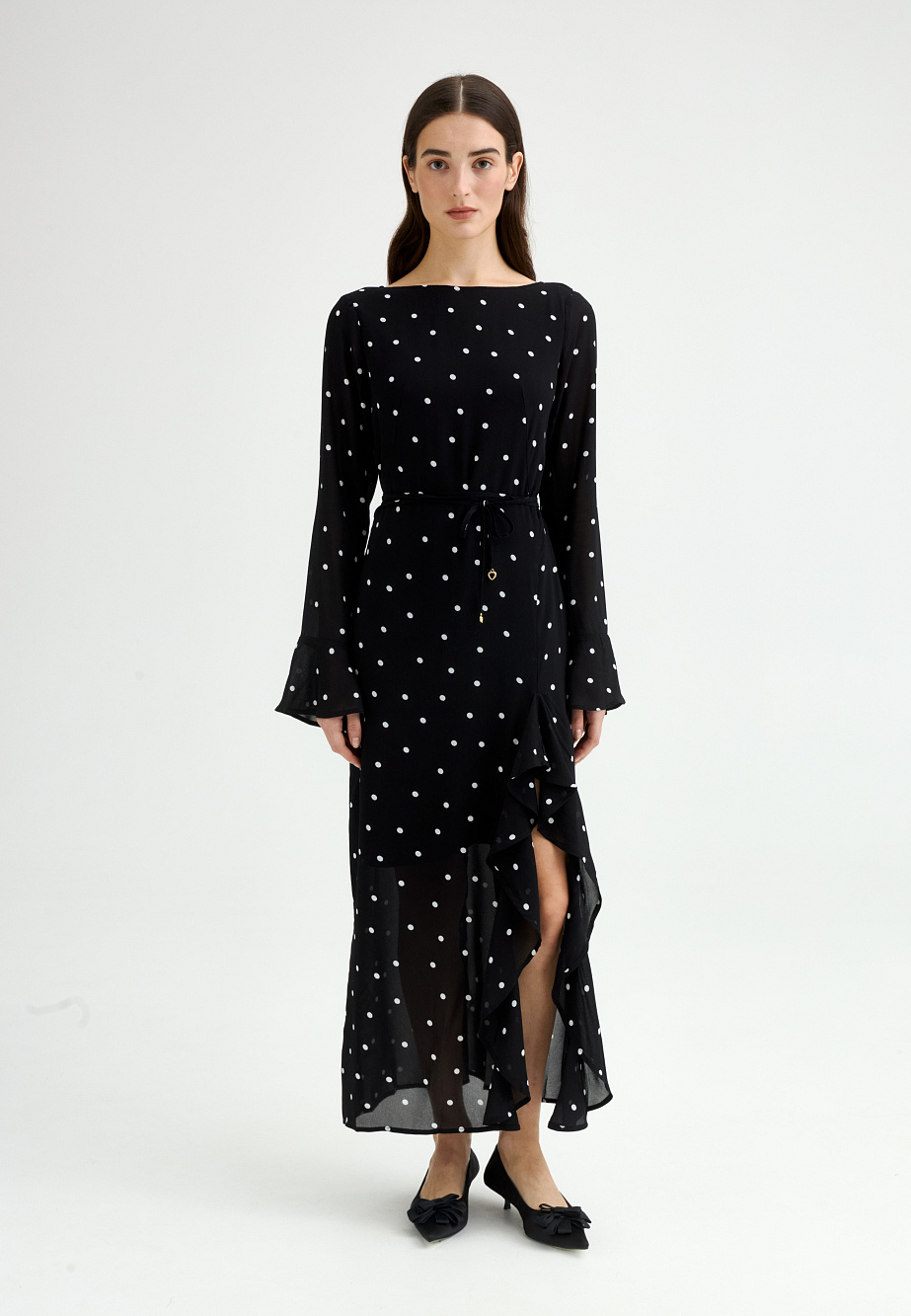 Современное и универсальное платье на все случаи жизни сочетает в себе модный принт в горох, креповую ткань высочайшего качества из 100%района, актуальные женственные пропорции и комфортную посадку. Вырез-лодочкой,переходящий в V-образный вырез на спине,удлиненные рукава, эффектный разрез по ноге, кокетливо подчеркнутый воланами, помогают подчеркнуть безупречность лаконичной формы, соединяя вечный и традиционный принт в горох, актуальные пропорции и модную длину мидакси.