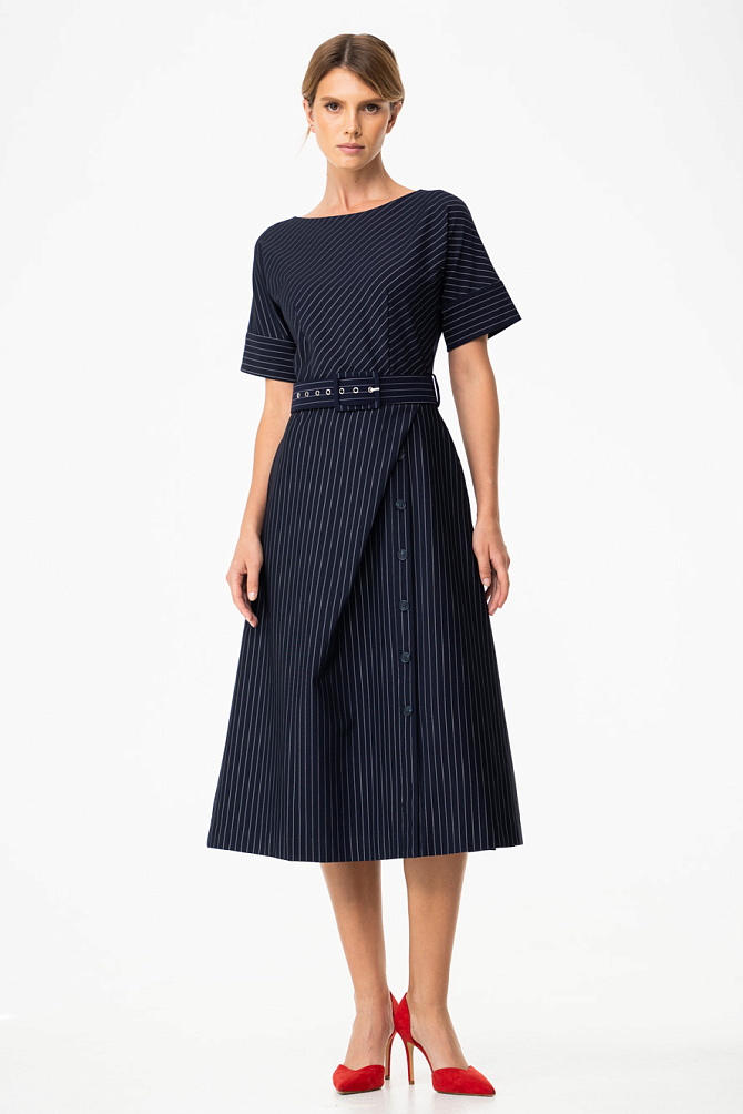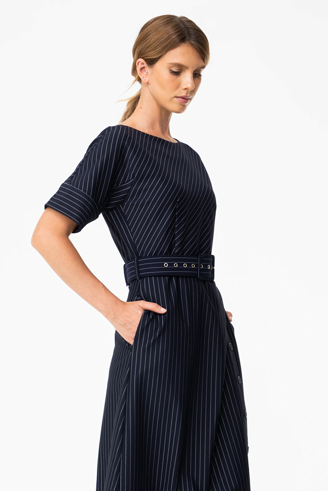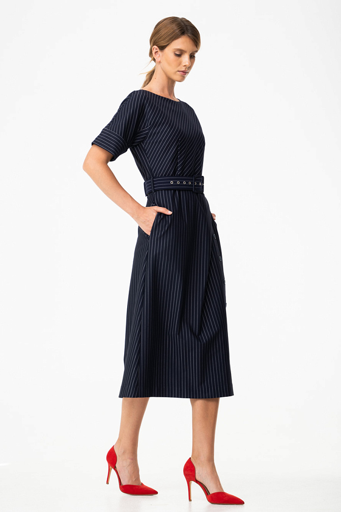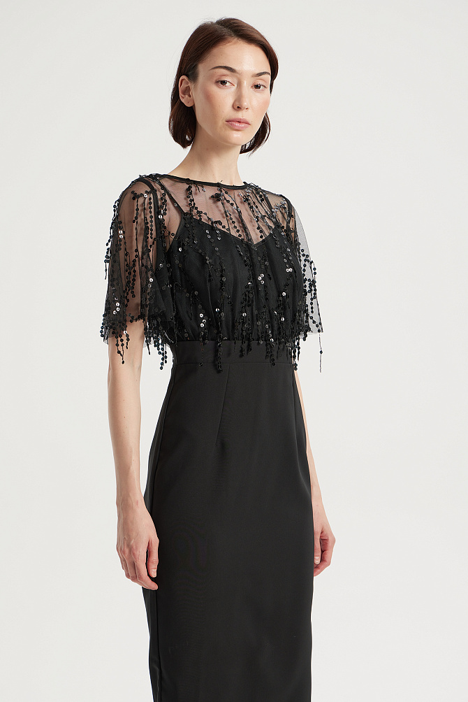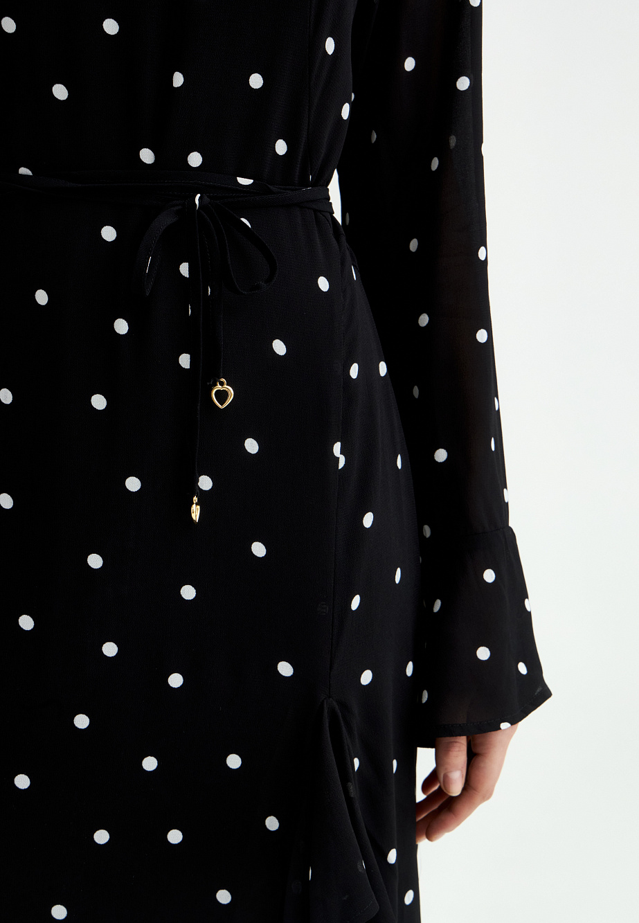 Современное и универсальное платье на все случаи жизни сочетает в себе модный принт в горох, креповую ткань высочайшего качества из 100%района, актуальные женственные пропорции и комфортную посадку. Вырез-лодочкой,переходящий в V-образный вырез на спине,удлиненные рукава, эффектный разрез по ноге, кокетливо подчеркнутый воланами, помогают подчеркнуть безупречность лаконичной формы, соединяя вечный и традиционный принт в горох, актуальные пропорции и модную длину мидакси.
