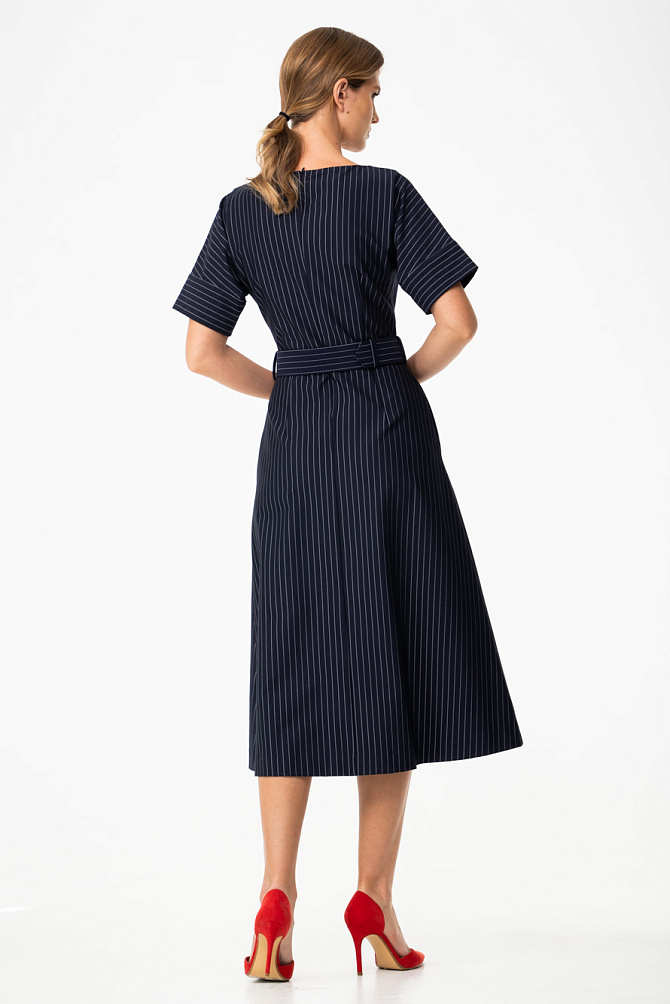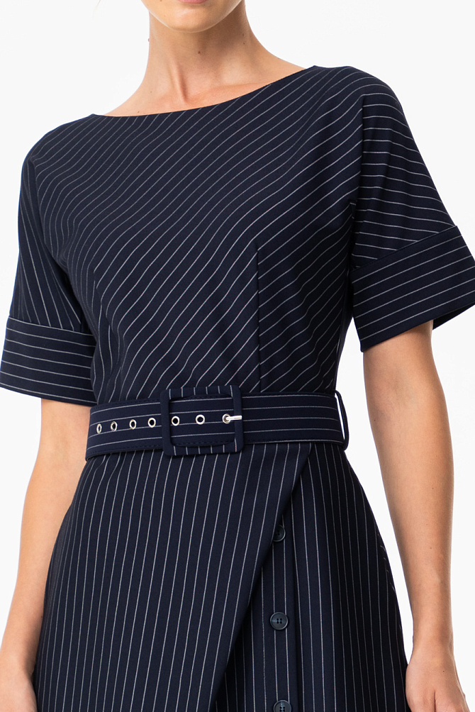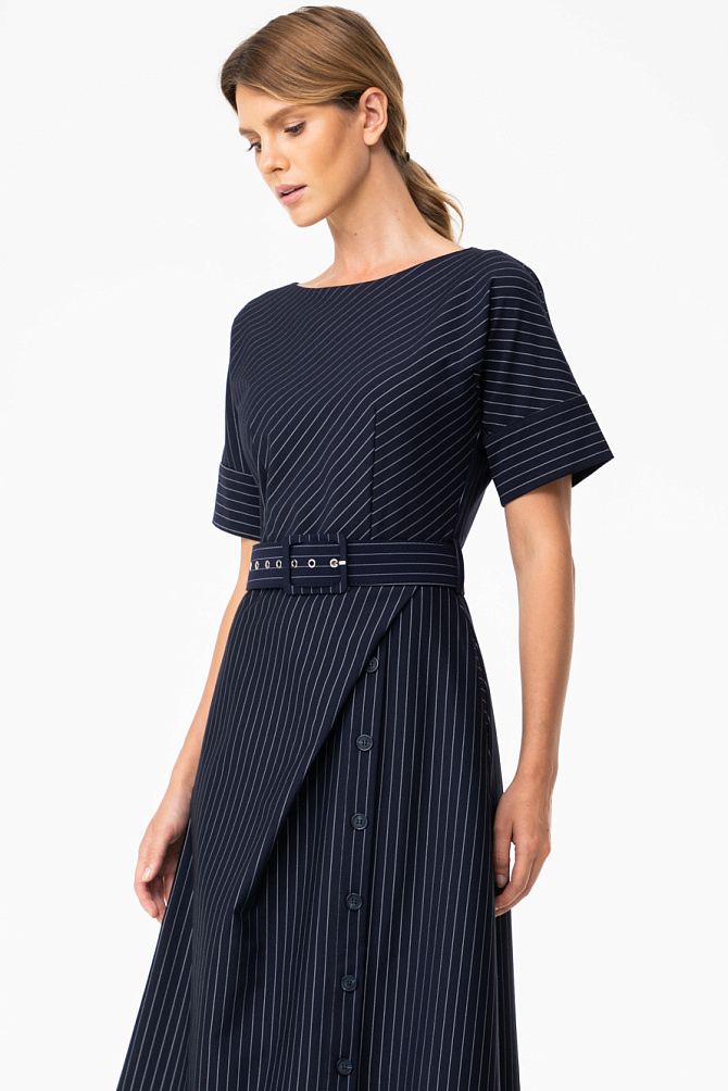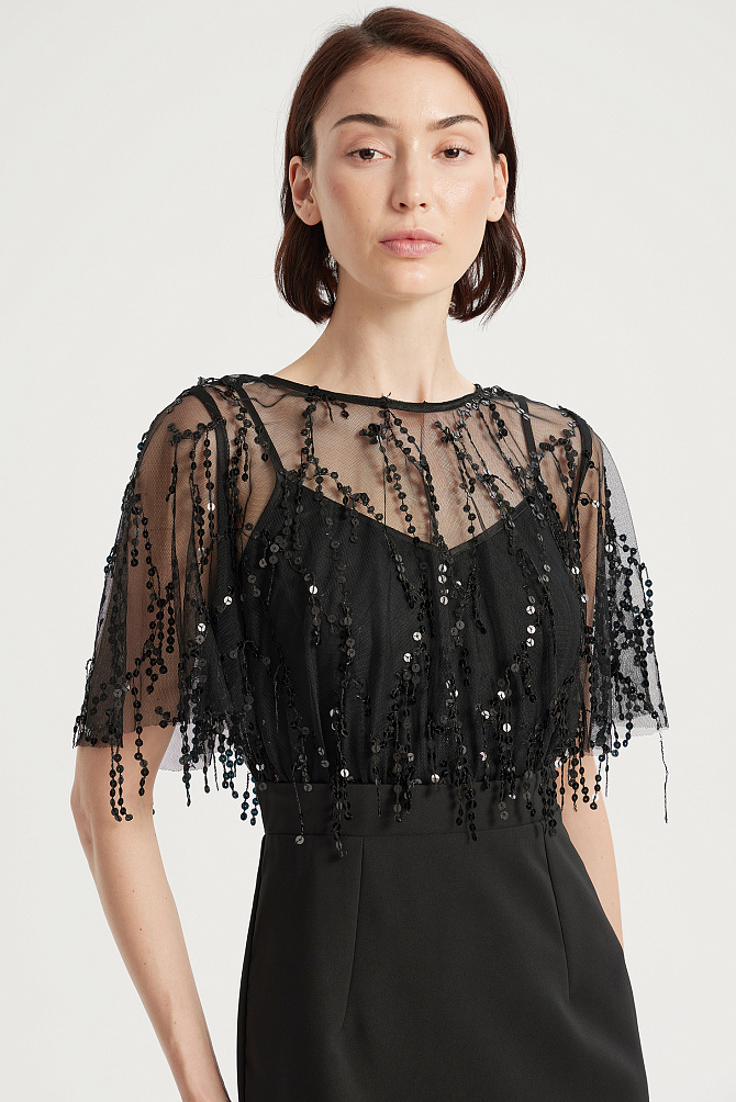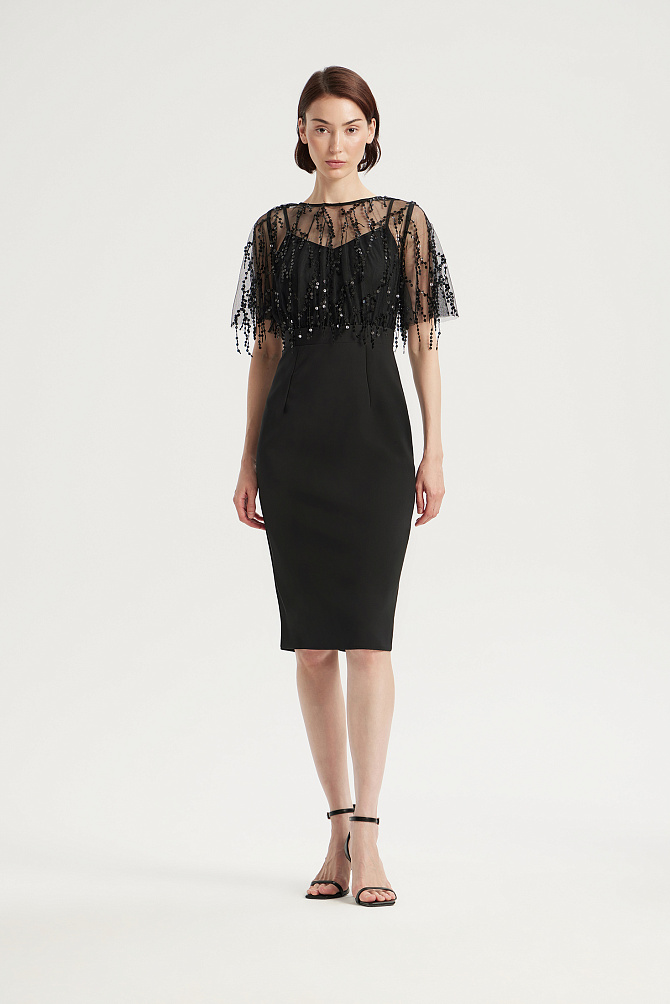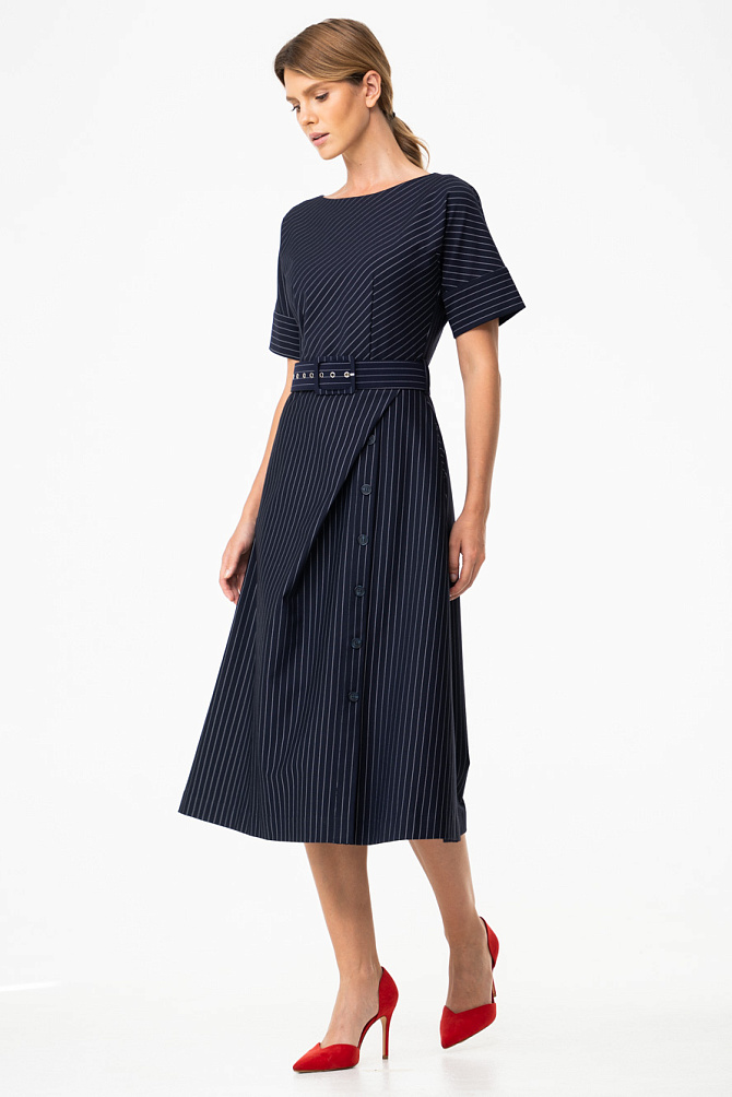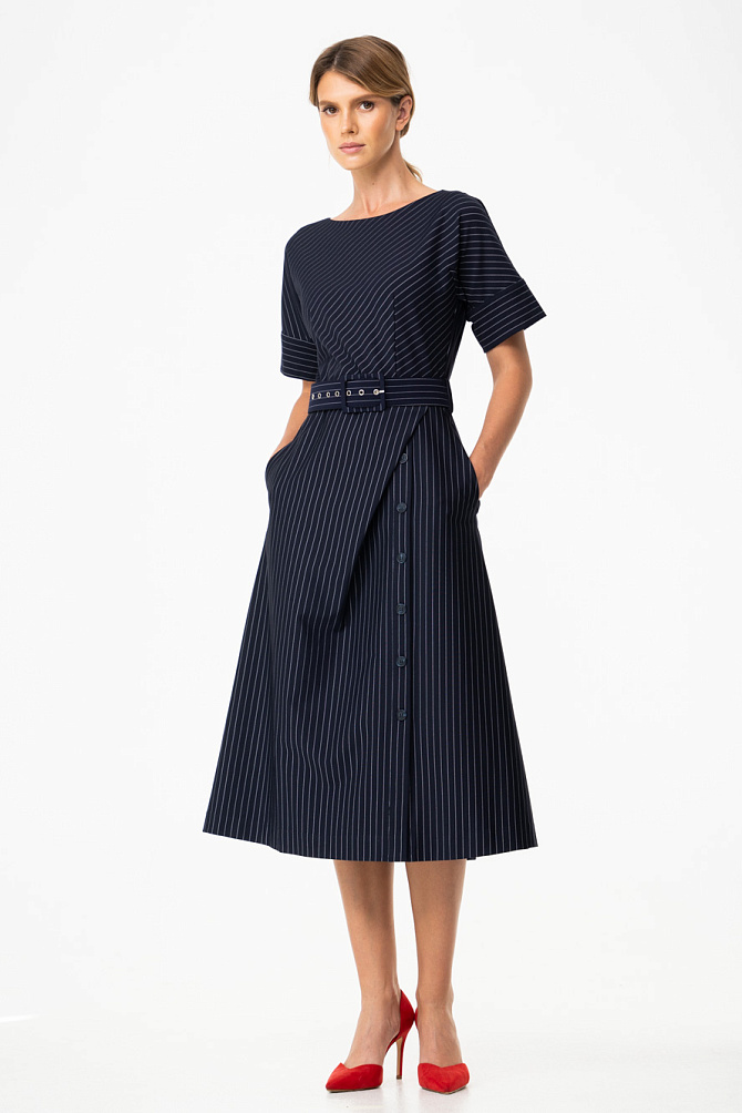 Современное и универсальное платье на все случаи жизни сочетает в себе модный принт в горох, креповую ткань высочайшего качества из 100%района, актуальные женственные пропорции и комфортную посадку. Вырез-лодочкой,переходящий в V-образный вырез на спине,удлиненные рукава, эффектный разрез по ноге, кокетливо подчеркнутый воланами, помогают подчеркнуть безупречность лаконичной формы, соединяя вечный и традиционный принт в горох, актуальные пропорции и модную длину мидакси.