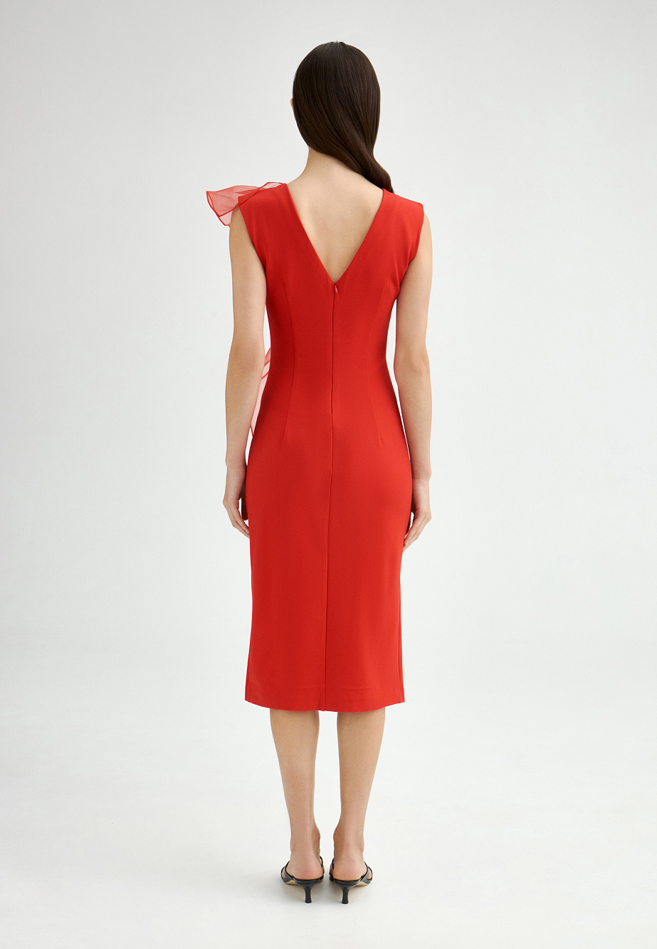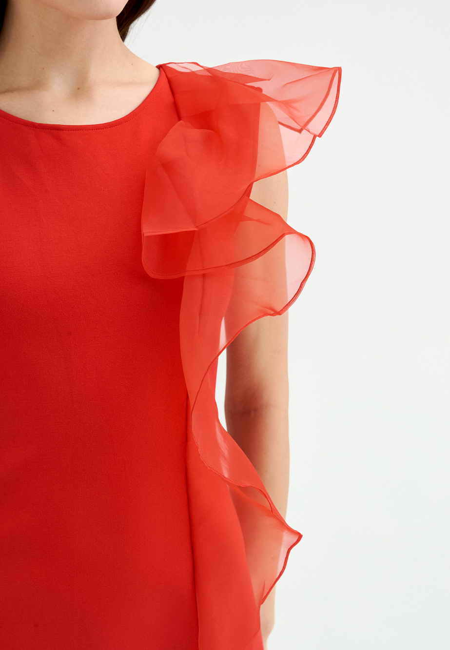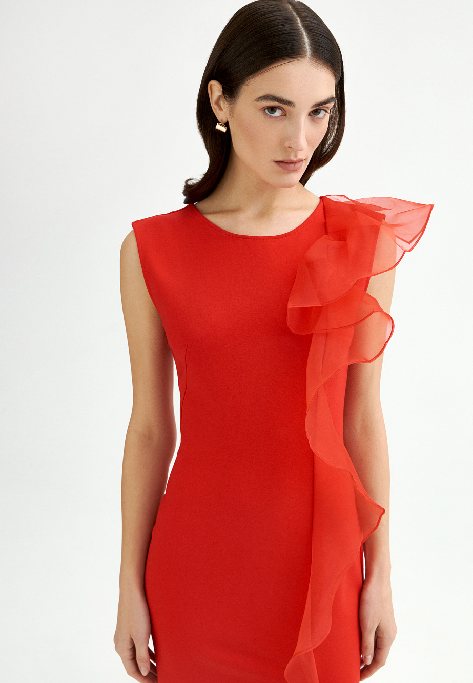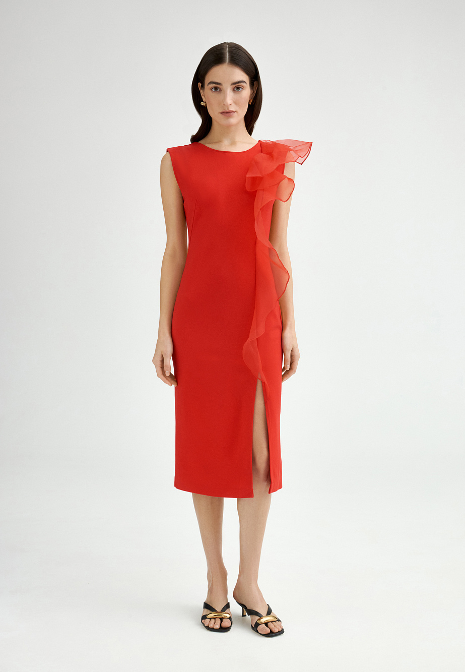 Лаконичное платье из вискозного плотного трикотажа с эффектом утяжки представлено в 2ух цветах-красном для ярких особ и базовом черном . Эффектной деталью служит волан из органзы,вшитый в рельеф от плеча до разреза, который украшает эту модель и делает ее выразительной и небанальной. Скругленная фома вытачки подчеркивает линии женских изгибов и позволяет добиться мягкой посадки. Вырез-лодочкой переходит в V-образный вырез по спинке и продолжает тему лаконичной элегантности.