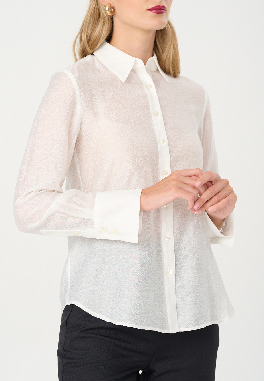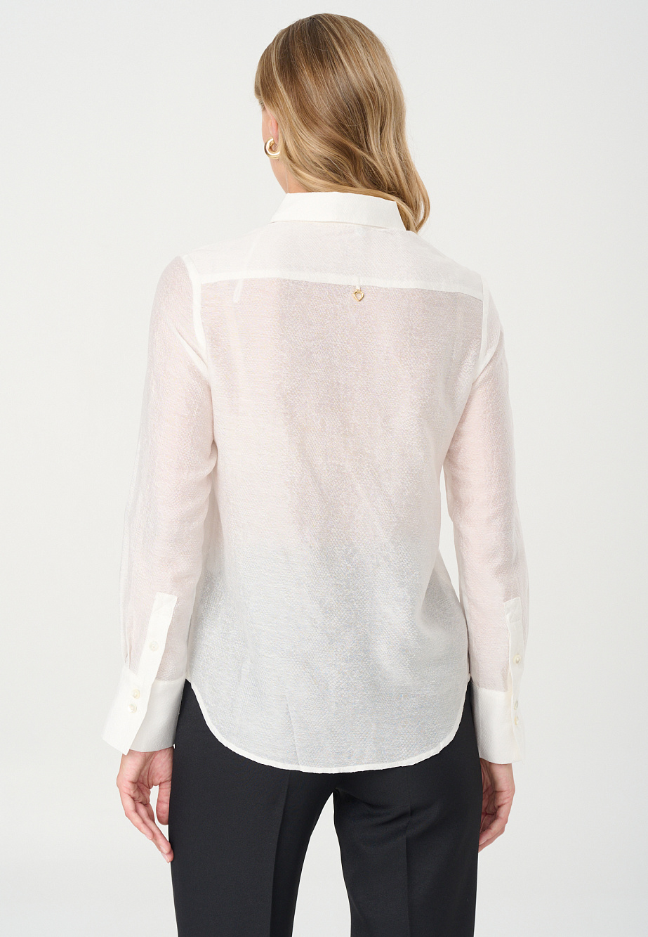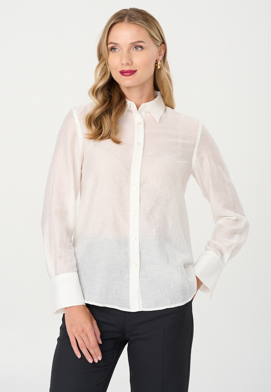 Рубашка из приятной смесовой ткани с благородной жаккардовой фактурой под рептилию. Ее умеренный объем и пропорции помогают создать стильный образ в духе нашего времени под жакеты и верхнюю одежду. Продуманные детали - лаконичный воротник и широкие манжеты, которые при желании можно отвернуть, пуговицы с перламутром,аксессуар в виде сердечка и слегка прозрачная ткань с деликатным отливом делают рубашку не тривиальной и очень женственной.