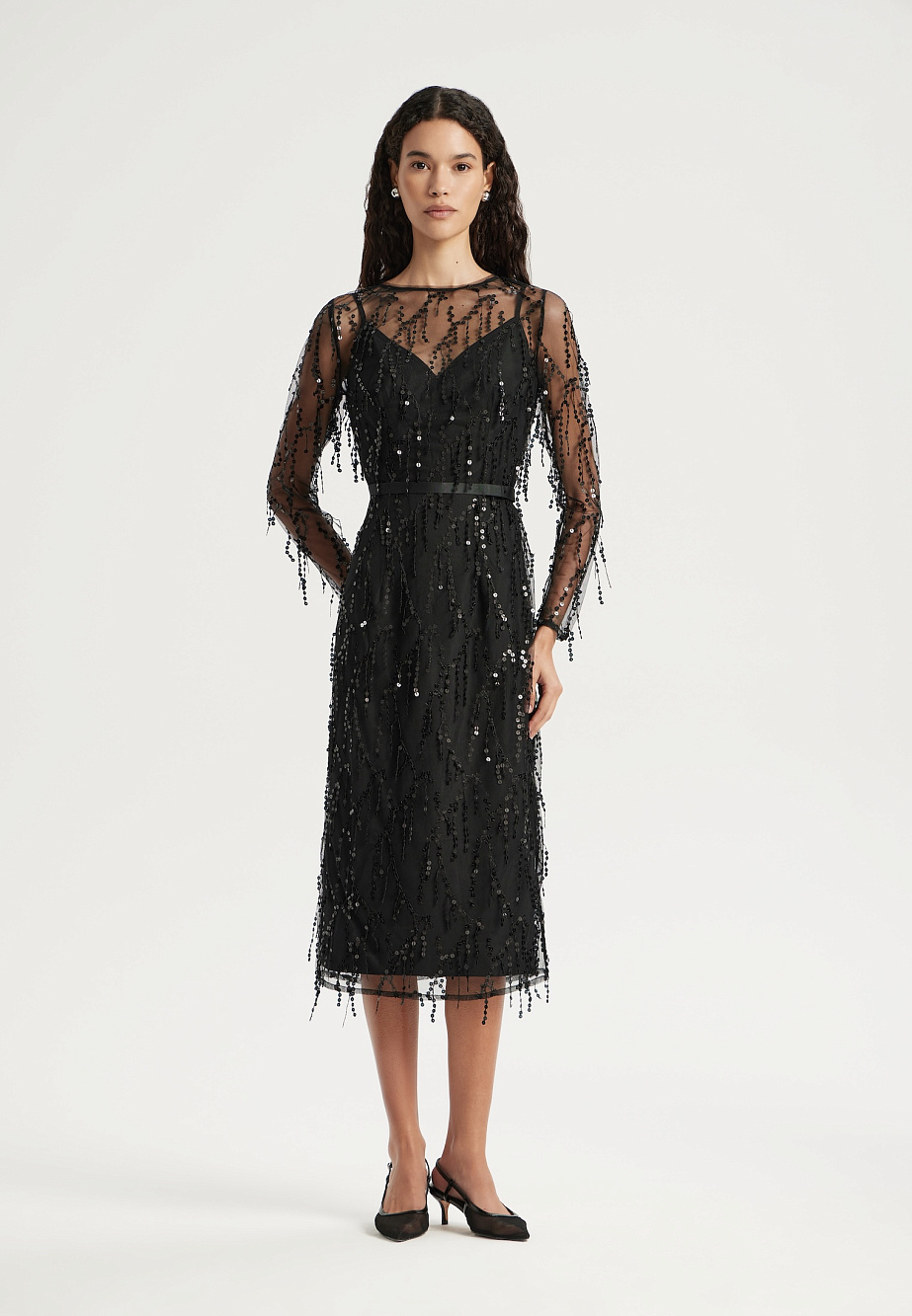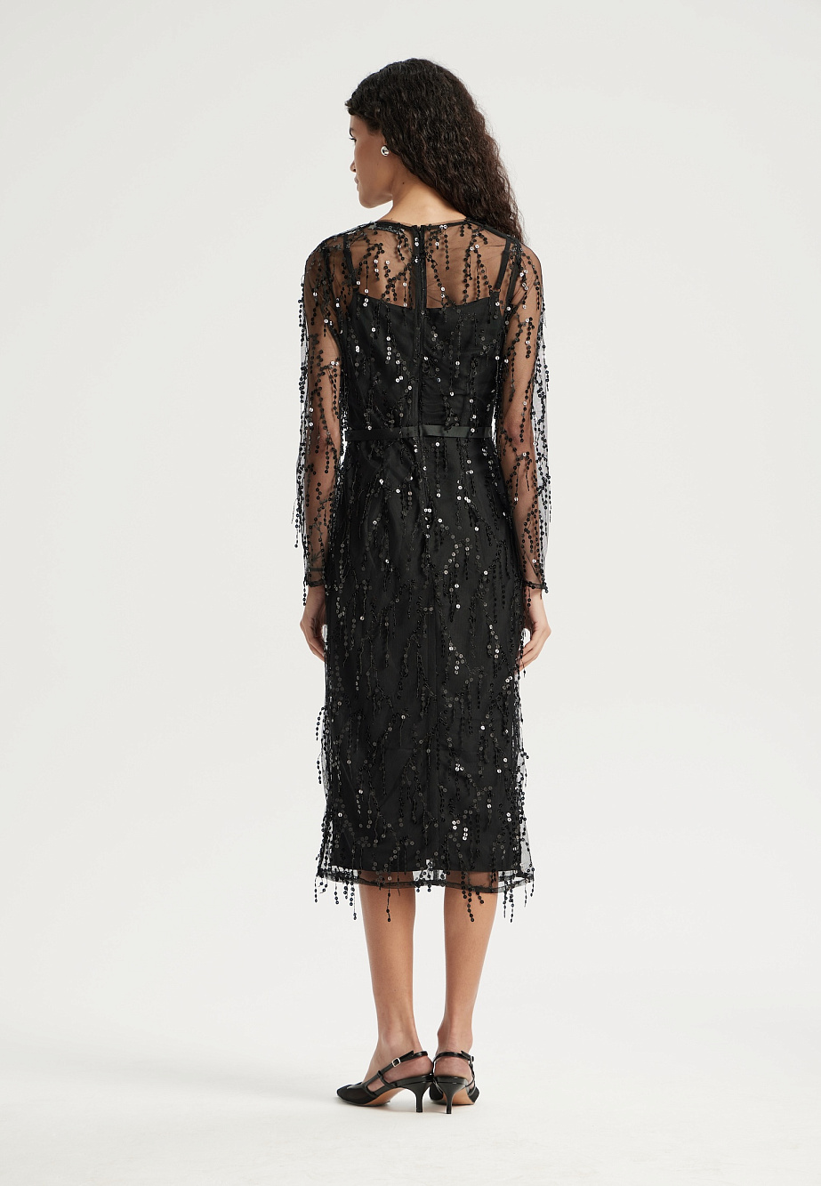 Лаконичное платье-футляр приталенного силуэта смотрится очень эффектно за счет ткани из прозрачной сетки с подвесками из пайеток. Платье двойное,состоит из подклада и основного платья. За счет бельевого кроя нижнего платья и длины мини,хорошо просматривается эффект основного платья и создает визуальный эффект двойной длины.