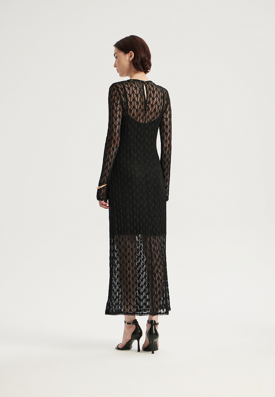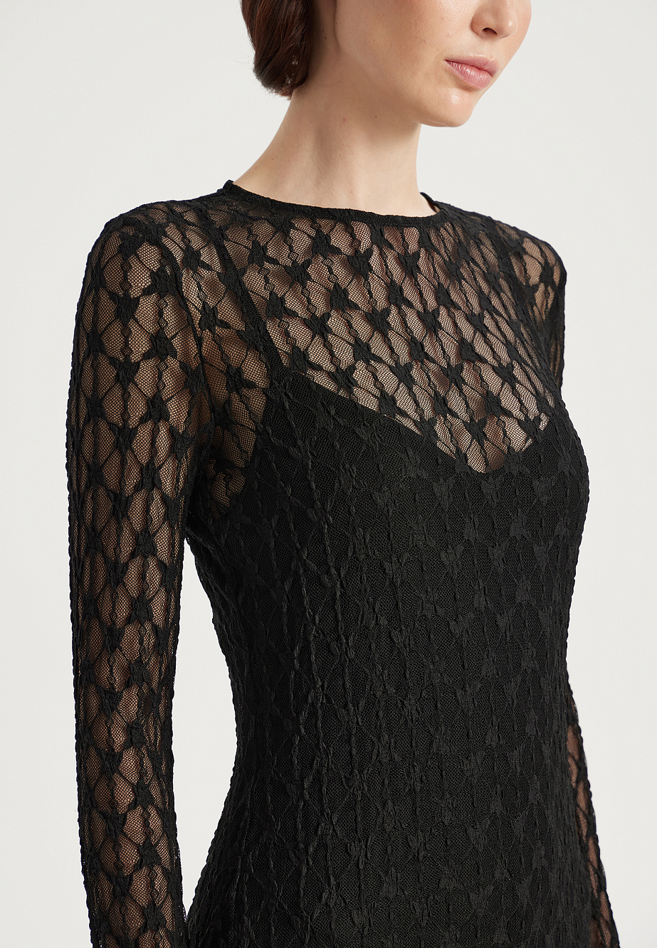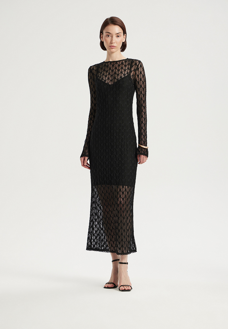 Эффектное платье длиной макси, состоящее из прозрачного,эластичного и фактурного гипюра с геометрическим переплетением и подклада-комбинации из тонкого модала с регулируемыми бретелями. В этой модели сразу несколько трендов:прозрачность и многослойность, а также актуальная длина макси,которая триумфально вернулась и дарит новое ощущение пропорций . Закрытое прозрачное верхнее платье мягко повторяет женский силуэт и создает ощущение загадочности и полет фантазии. По низу рукавов и низу платья отделка эластичным кружевом, придающим законченность и люксовость образу.