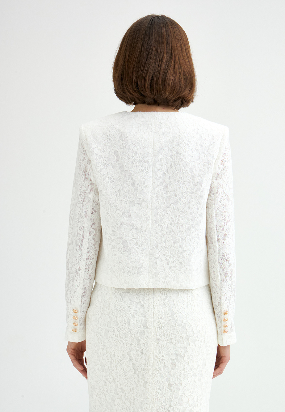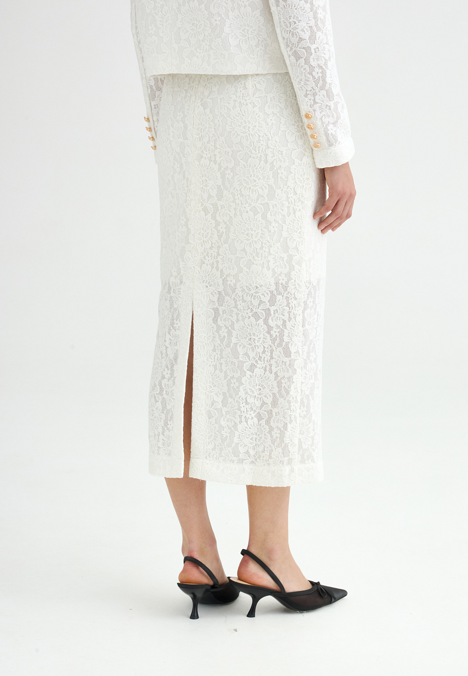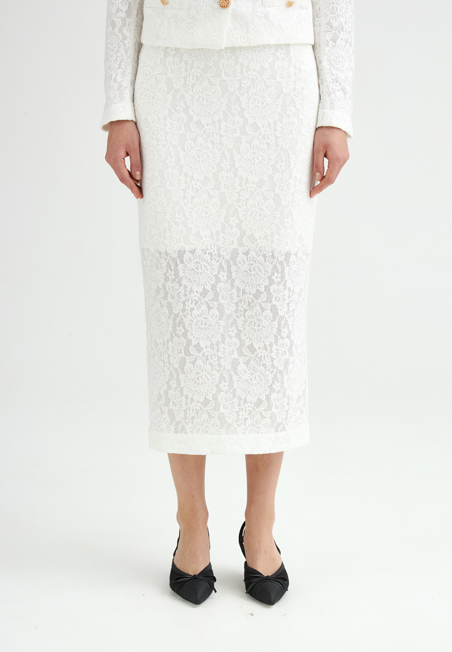 Юбка прямого силуэта с разрезом, выполненная из кружева с добавлением хлопка, сочетает элегантность и легкость. Плотный трикотажный подклад не позволяет ткани просвечивать, а его укороченная длина подчеркивает текстуру материала. Застежка на потайную молнию по среднему шву спинки обеспечивает идеальную посадку. Юбка дополняется укороченным жакетом.