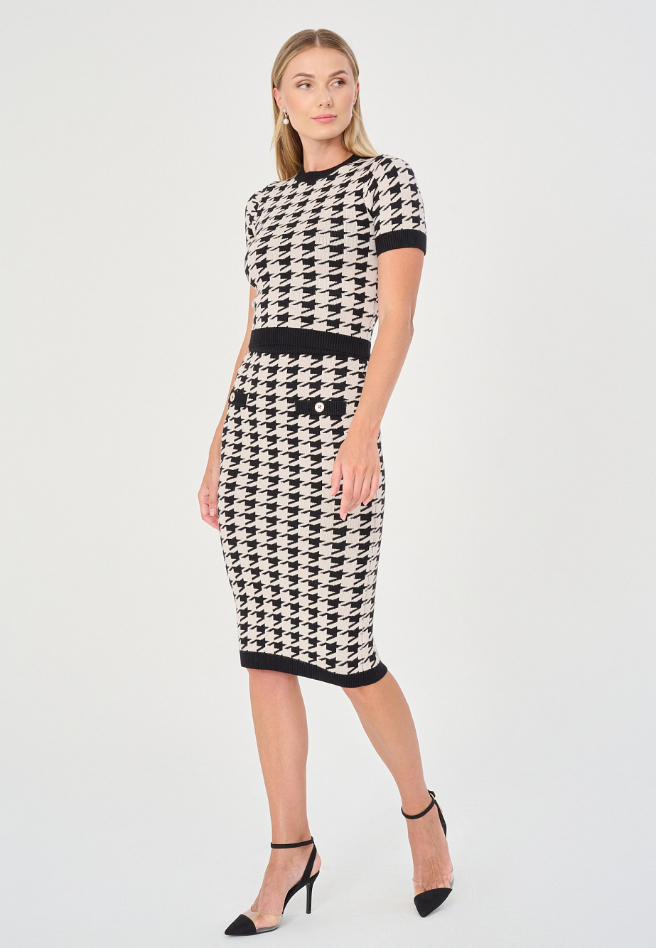 Трикотажная юбка в рамках классического образа из пряжи с жаккардовым переплетением и принтом пье-де-пуль, создает женственный и стильный силуэт с нотками изысканного стиля Жаклин Кеннеди. Плотный двойной трикотаж, графичный рисунок и зауженный силуэт отлично подчеркивают женственные пропорции и дарят ощущение элегантности и неповторимое чувство стиля.