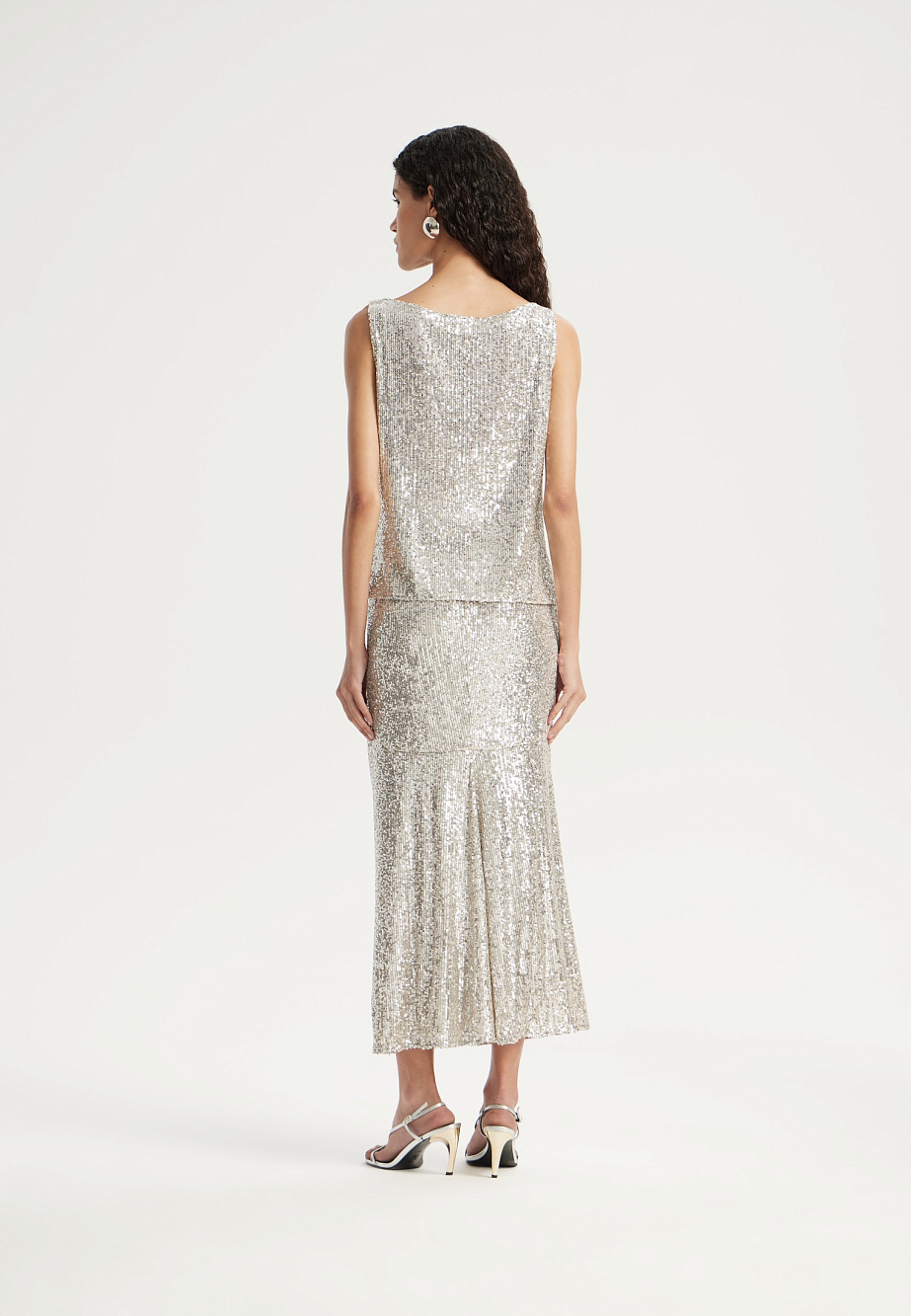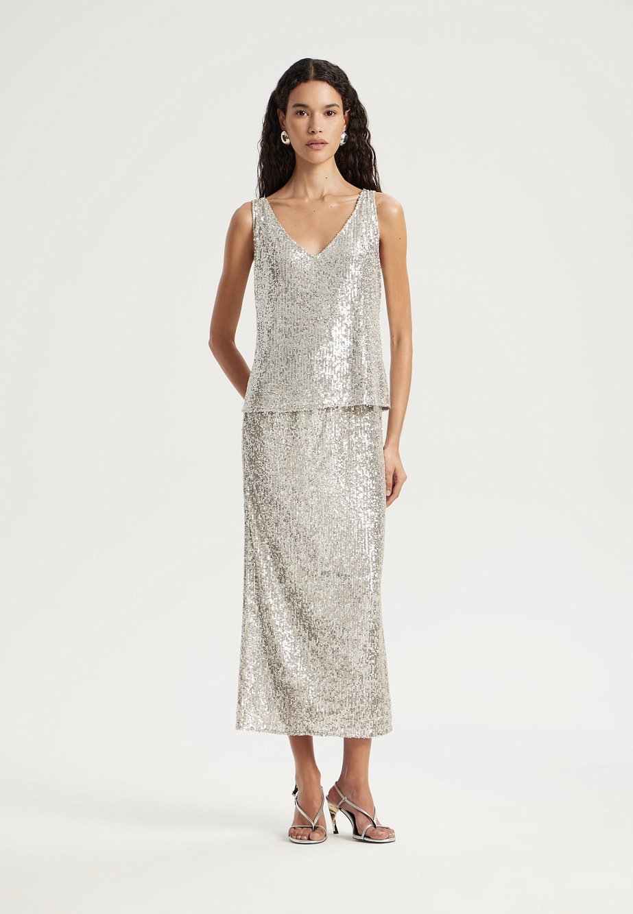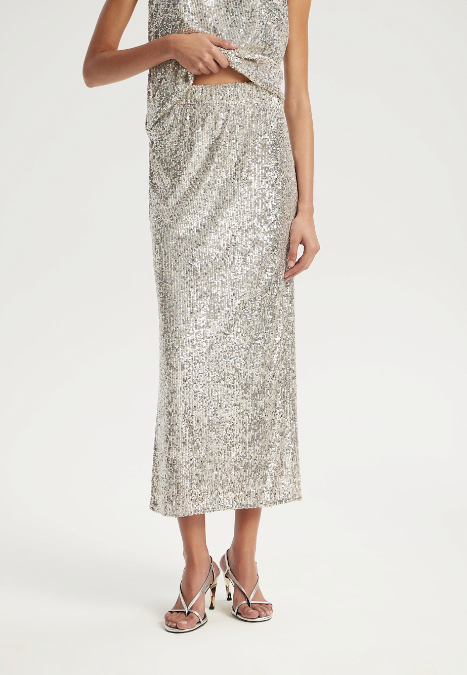 Элегантная юбка с пайетками на резинке поможет создать выразительный и модный образ. Модель с сетчатой подкладкой и обработанными срезами обеспечивает удобство в носке, а идеальная длина делает её универсальной. Идеально сочетается с топом из той же ткани или выступает самостоятельным стильным акцентом.