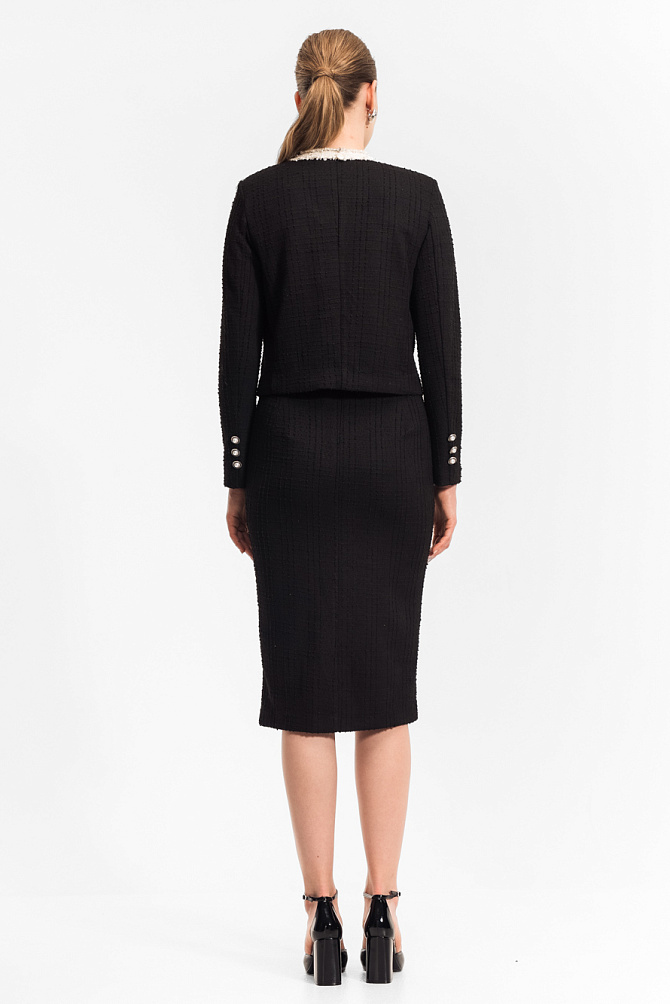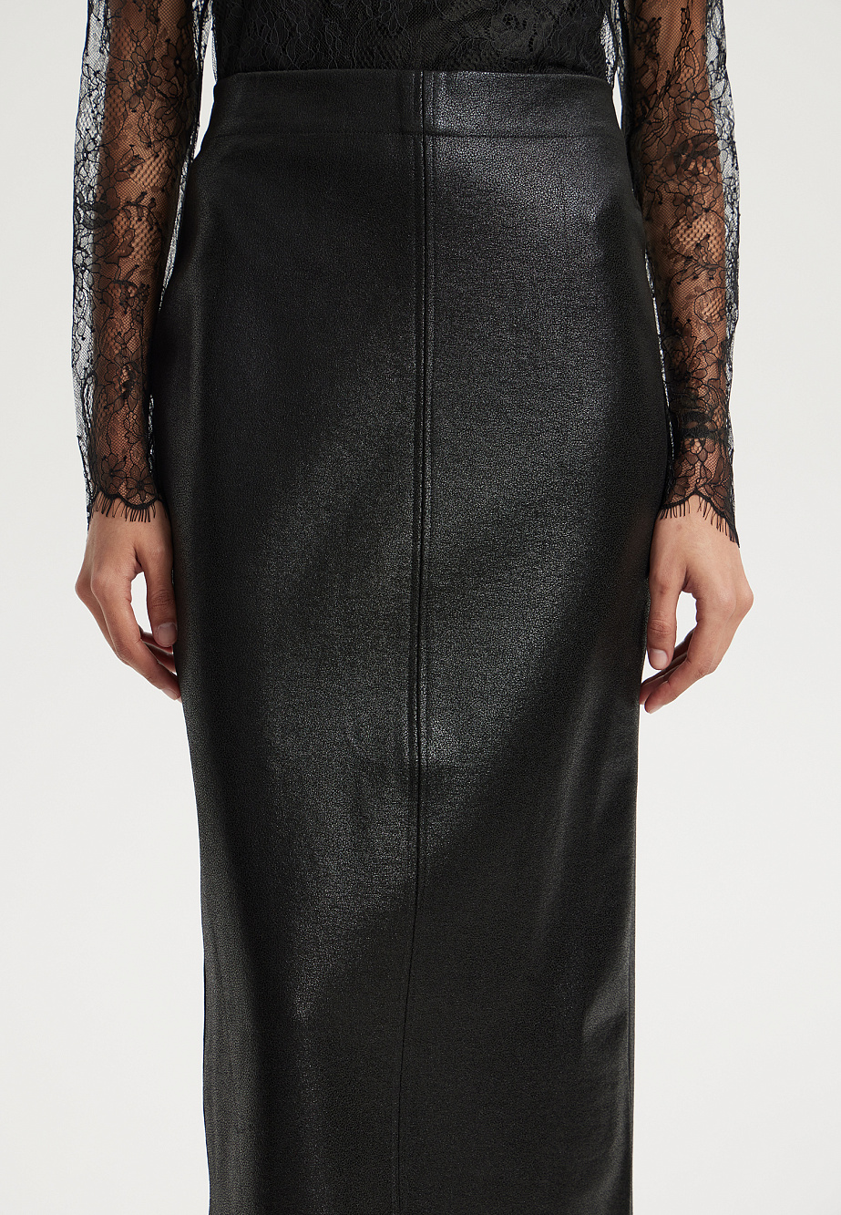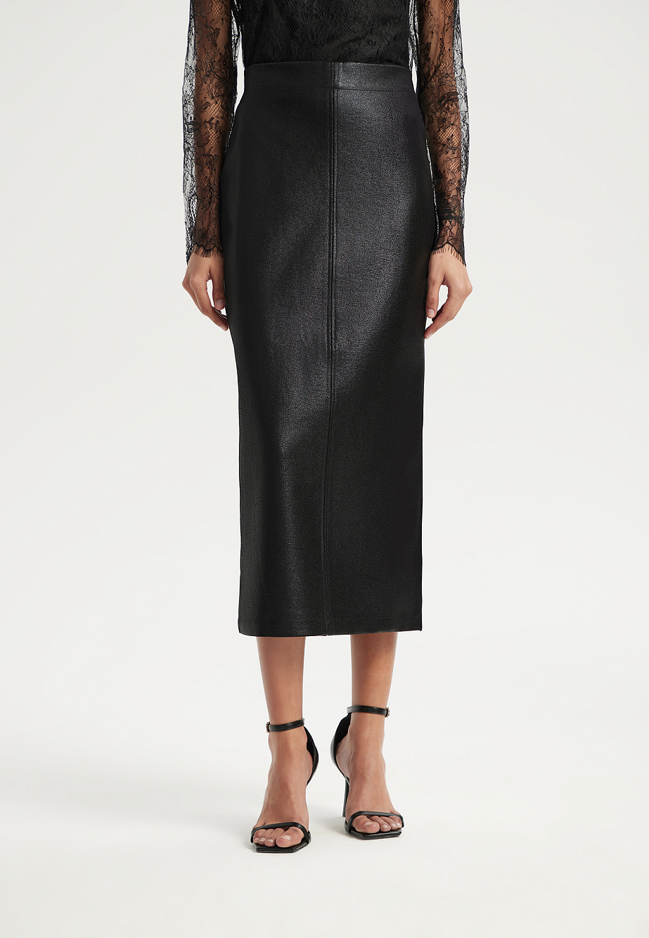 Элегантная юбка прямого кроя из плотного фактурного трикотажа — универсальная вещь в гардеробе. Модель с аккуратной обтачкой вместо пояса и скрытой резинкой сзади обеспечивает идеальную посадку по талии. Боковая потайная молния и задний разрез подчеркивают чистоту линий. Благодаря плотному материалу юбка не требует подкладки.