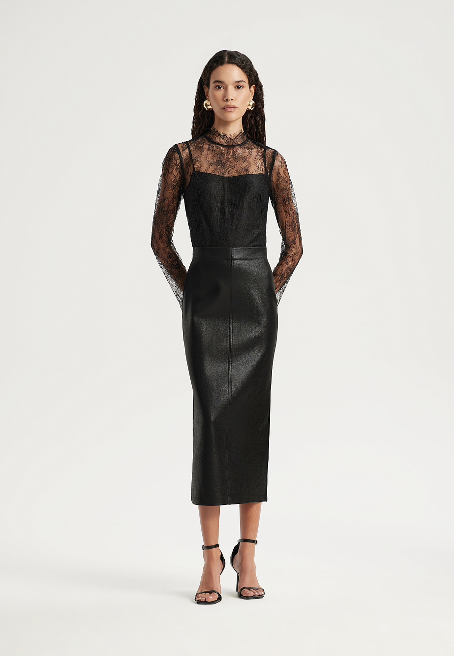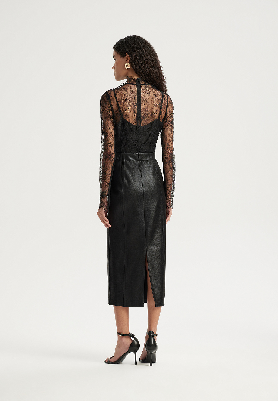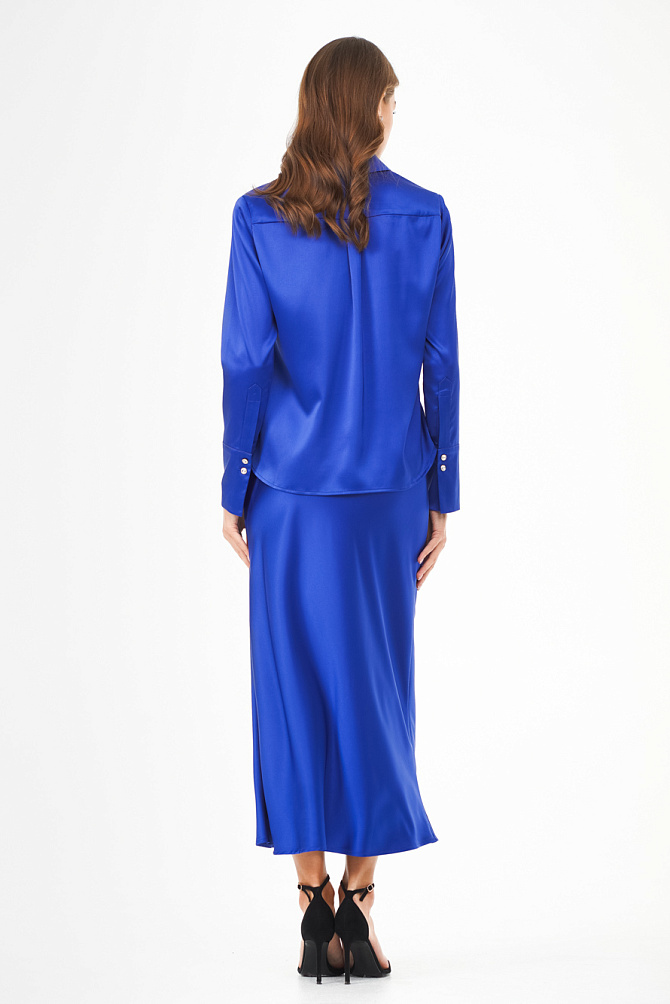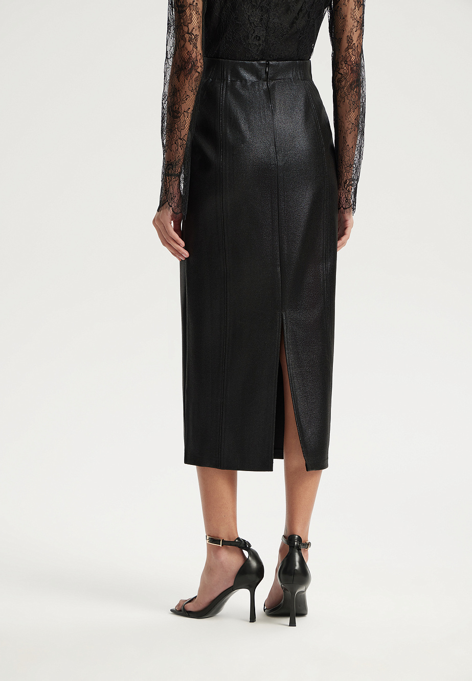 Элегантная юбка прямого кроя из плотного фактурного трикотажа — универсальная вещь в гардеробе. Модель с аккуратной обтачкой вместо пояса и скрытой резинкой сзади обеспечивает идеальную посадку по талии. Боковая потайная молния и задний разрез подчеркивают чистоту линий. Благодаря плотному материалу юбка не требует подкладки.
