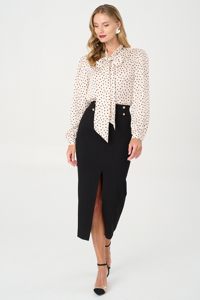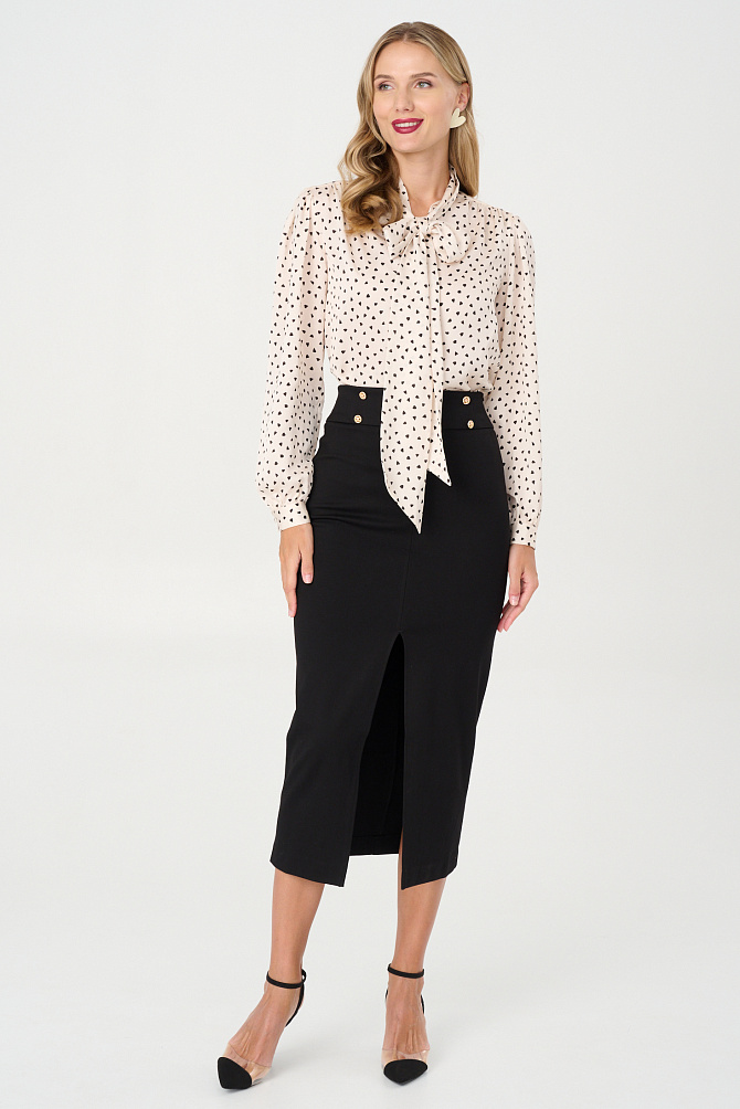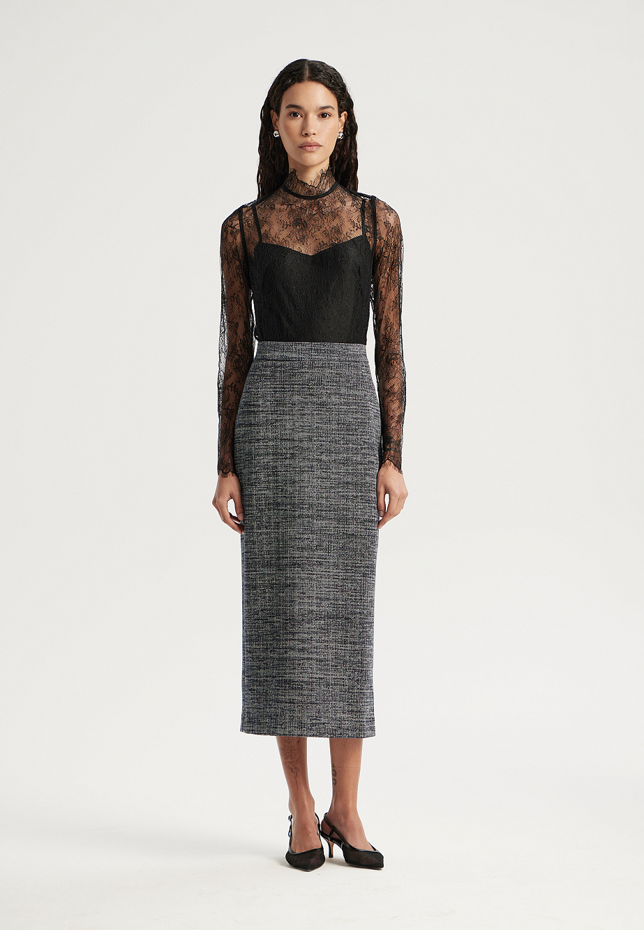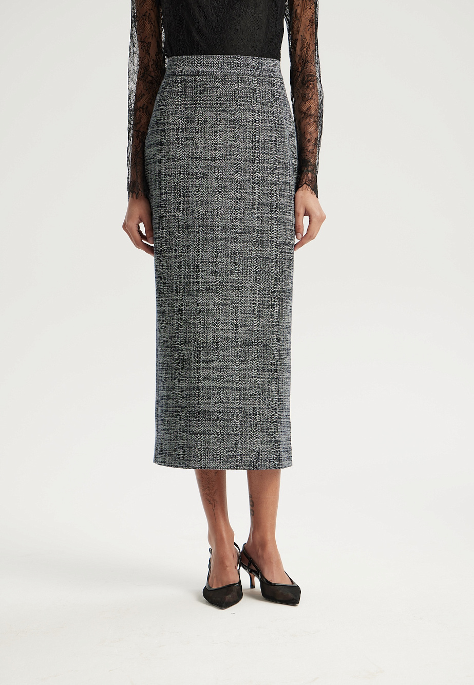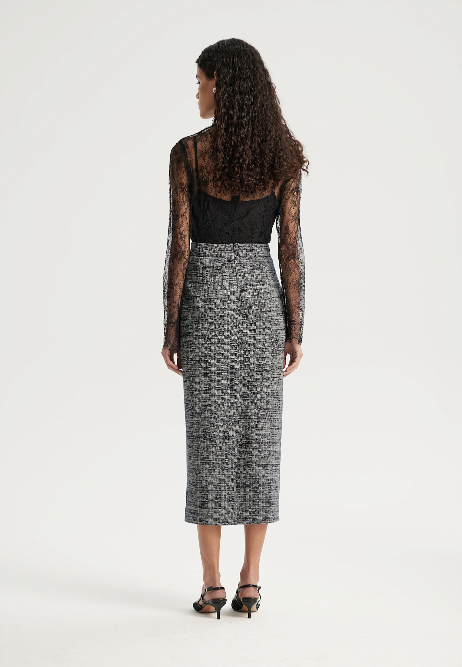 Элегантная юбка мидакси из плотного трикотажа с рисунком «елочка» — идеальное дополнение к жакету из той же ткани для создания безупречного ансамбля. Модель с высокой шлицей сзади подчеркивает силуэт, а эластичная подкладка и потайная молния на спинке обеспечивают идеальную посадку и удобство в движении.