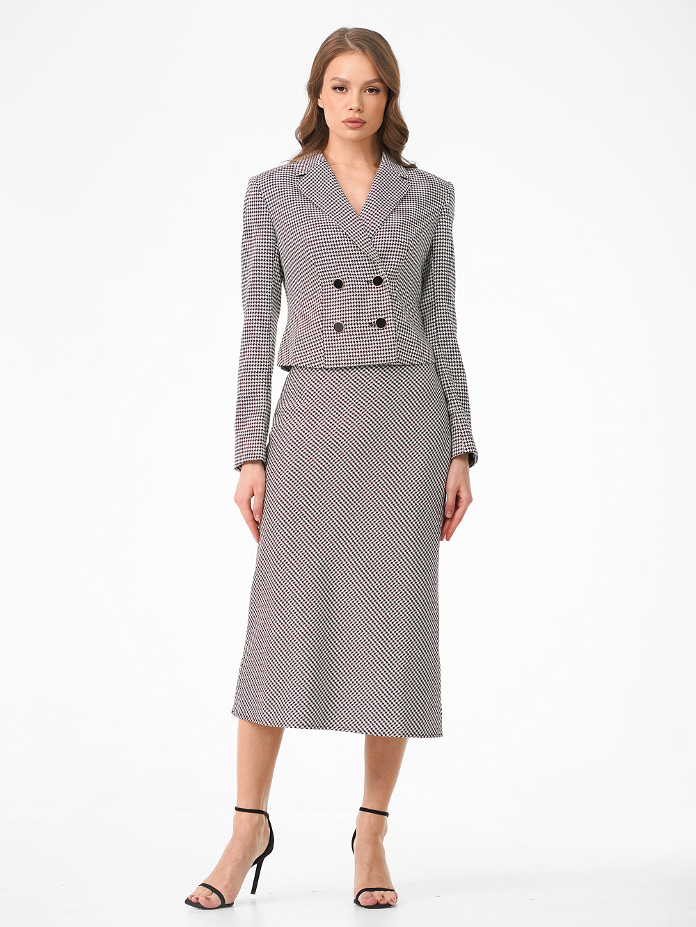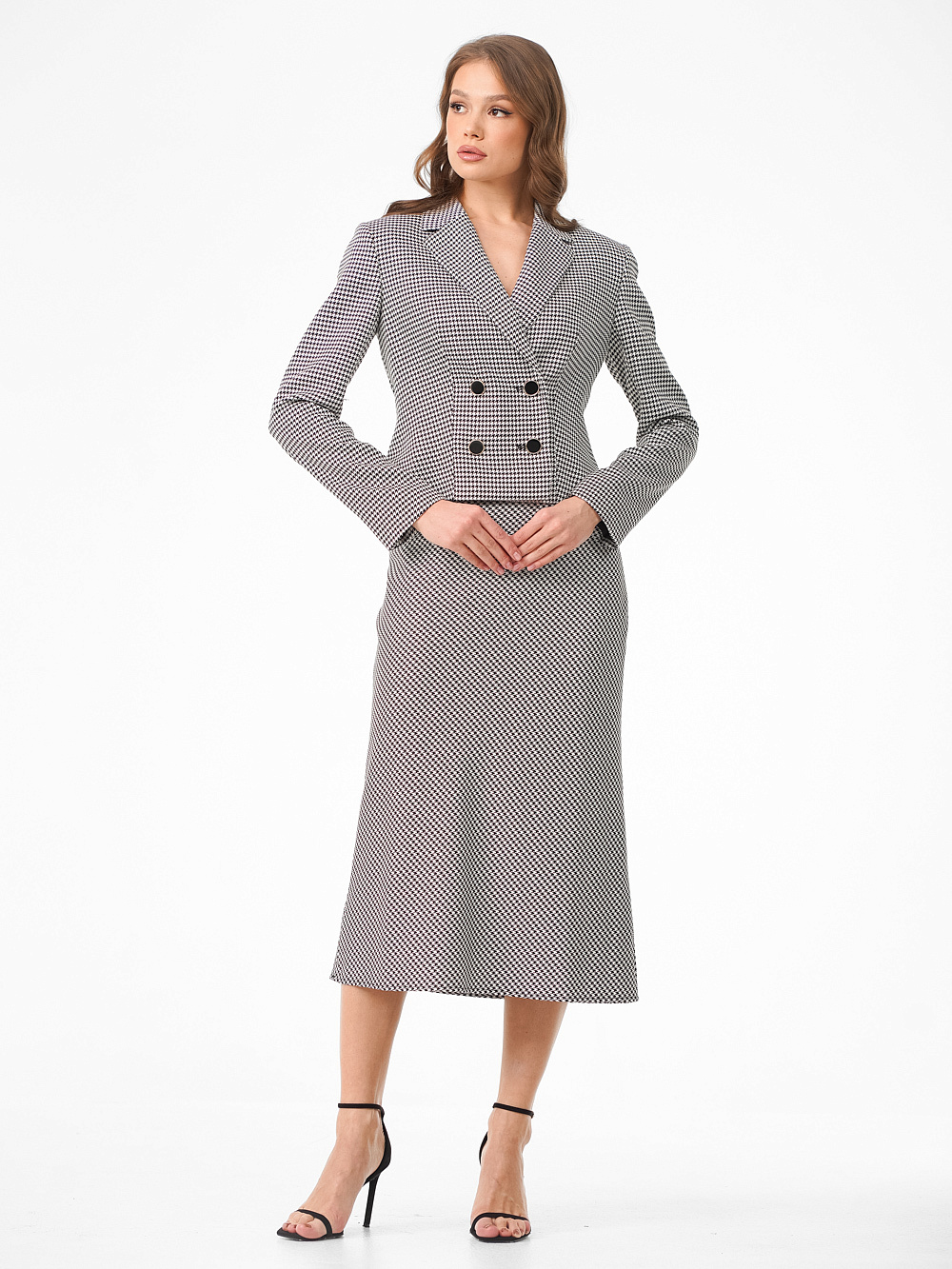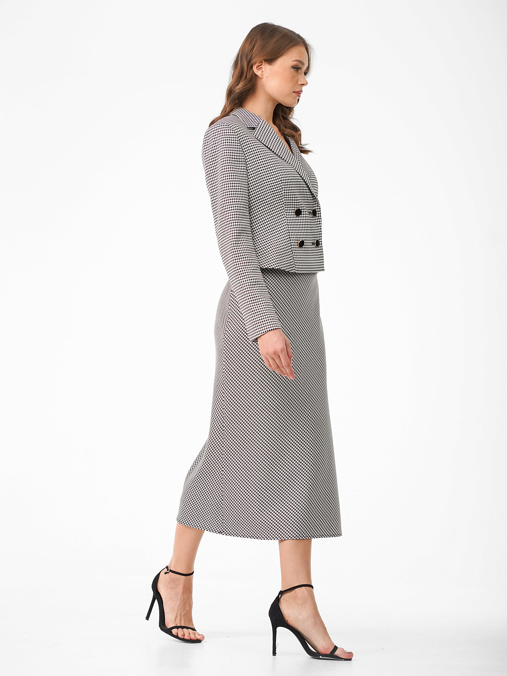 Костюм, состоящий из укороченного жакета и юбки длиной миди. Жакет приталенный и укороченный, с четкой линией плеча и выверенными пропорциями, прекрасно дополнит весенние образы и позволит разнообразить офисный строгий стиль. Стоит обратить внимание на четкость линий борта и лацканов, на фурнитуру- стильные пуговицы с металлическим ободком и на качественный и приятный к телу подклад. Слегка расклешенный книзу силуэт юбки и безупречная посадка достигается за счет кроя юбки по косой. Костюмная ткань- поливискоза с фактурным переплетением, очень пластичная и приятная на ощупь , хорошо держит форму и придает женственные очертания.