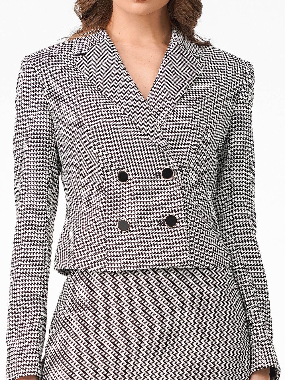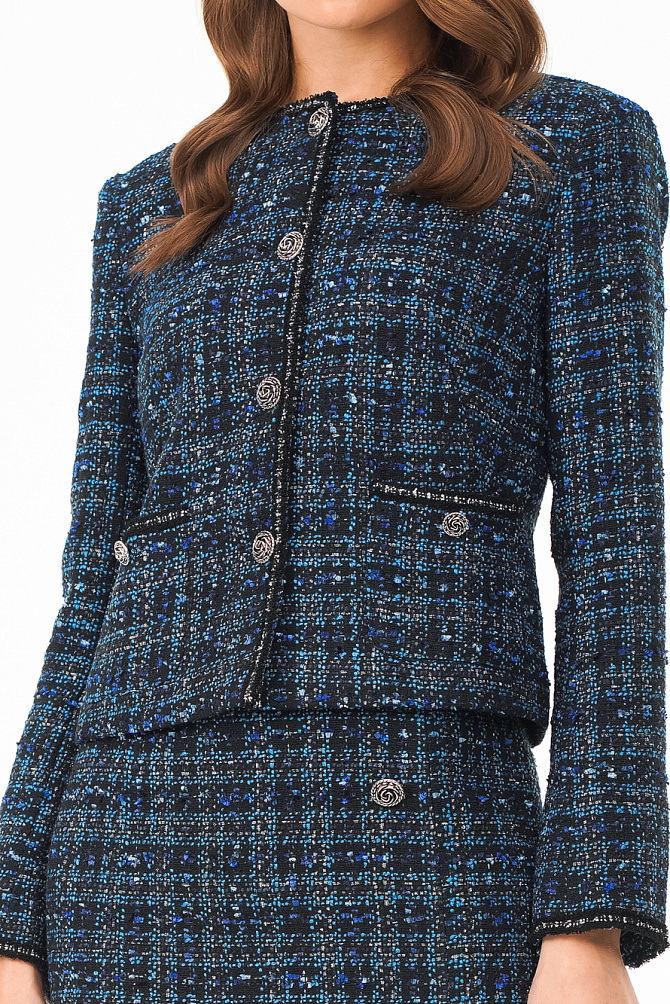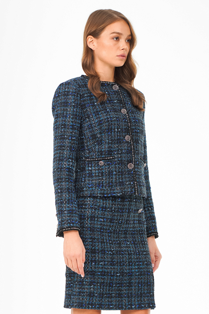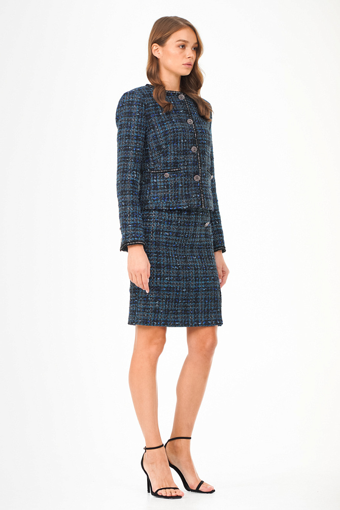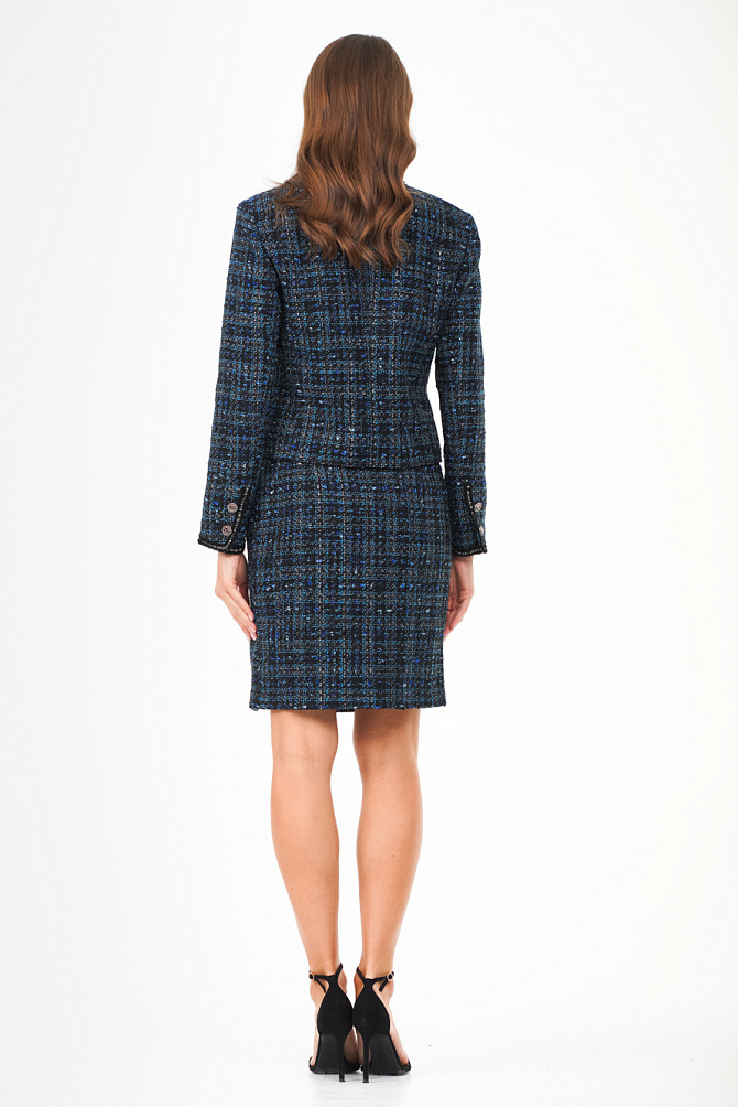 Костюм, состоящий из укороченного жакета и юбки длиной миди. Жакет приталенный и укороченный, с четкой линией плеча и выверенными пропорциями, прекрасно дополнит весенние образы и позволит разнообразить офисный строгий стиль. Стоит обратить внимание на четкость линий борта и лацканов, на фурнитуру- стильные пуговицы с металлическим ободком и на качественный и приятный к телу подклад. Слегка расклешенный книзу силуэт юбки и безупречная посадка достигается за счет кроя юбки по косой. Костюмная ткань- поливискоза с фактурным переплетением, очень пластичная и приятная на ощупь , хорошо держит форму и придает женственные очертания.