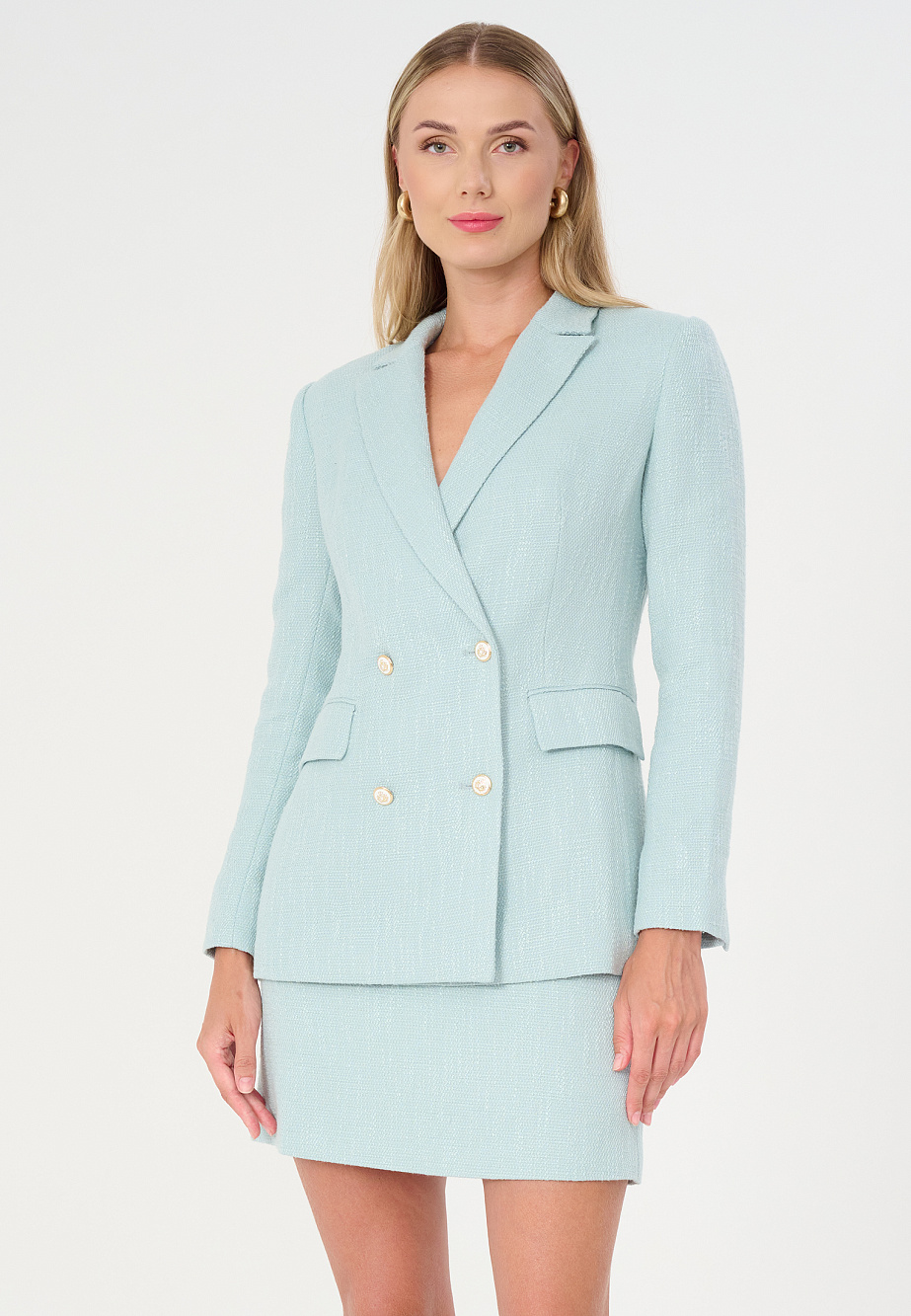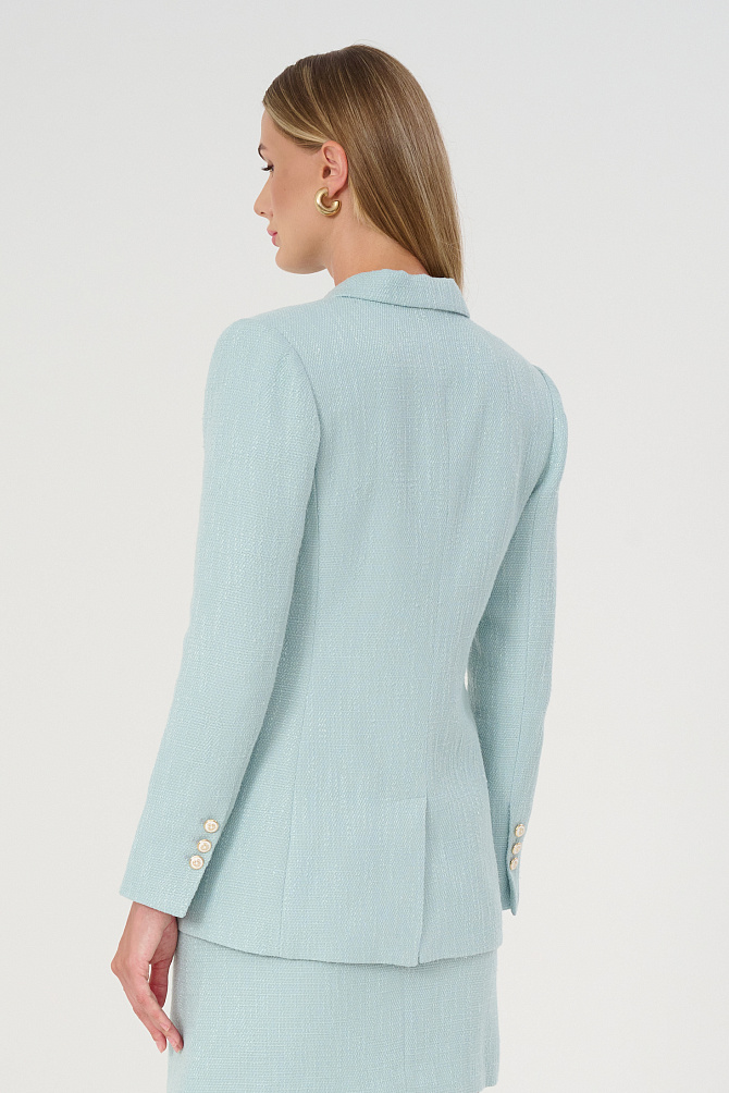 Юбка силуэта трапеция длиной мини выполнена из костюмного твида в свежем оттенке Tiffany. Такая модель юбки легко комбинируется с блузами, водолазками и футболками светлых оттенков.Изысканный цвет,смесовый состав твида с вискозой и хлопком, пуговицы с геральдикой и классические пропорции отсылают к популярному стилю Old Money, универсальность и функциональность которого проверена временем.