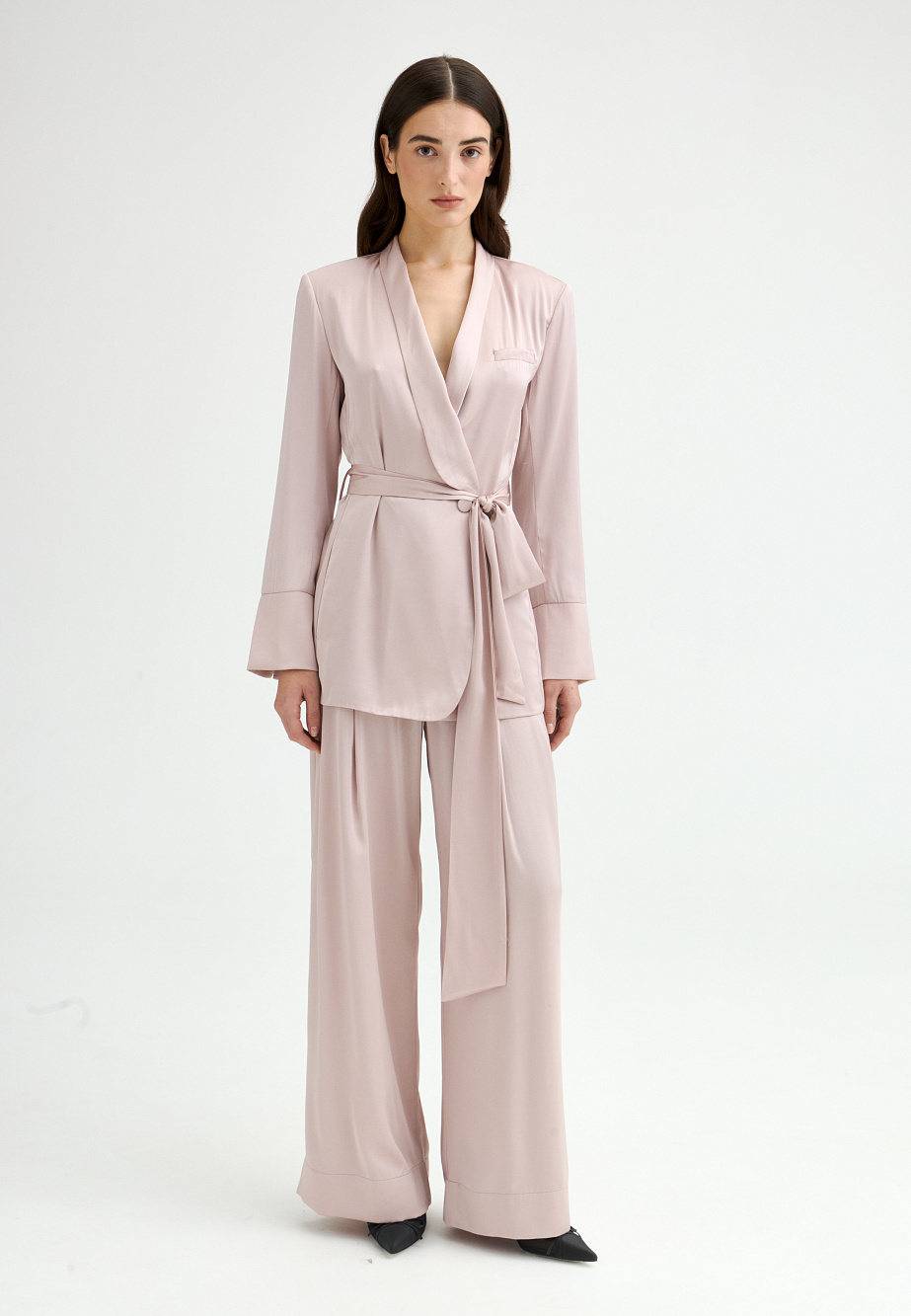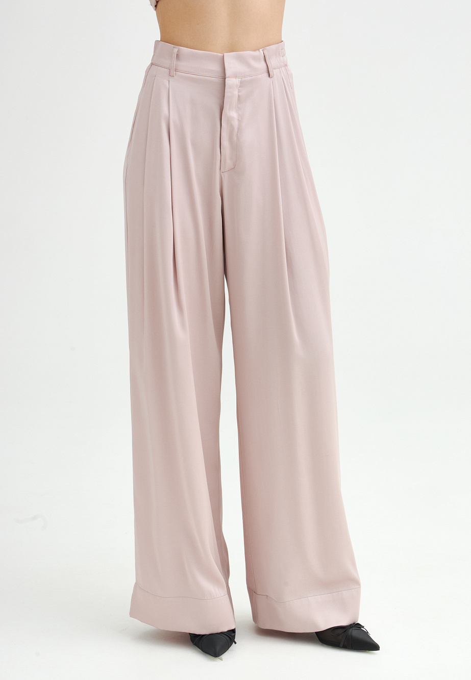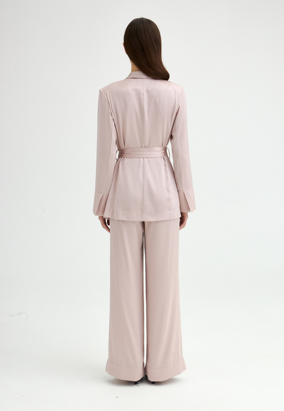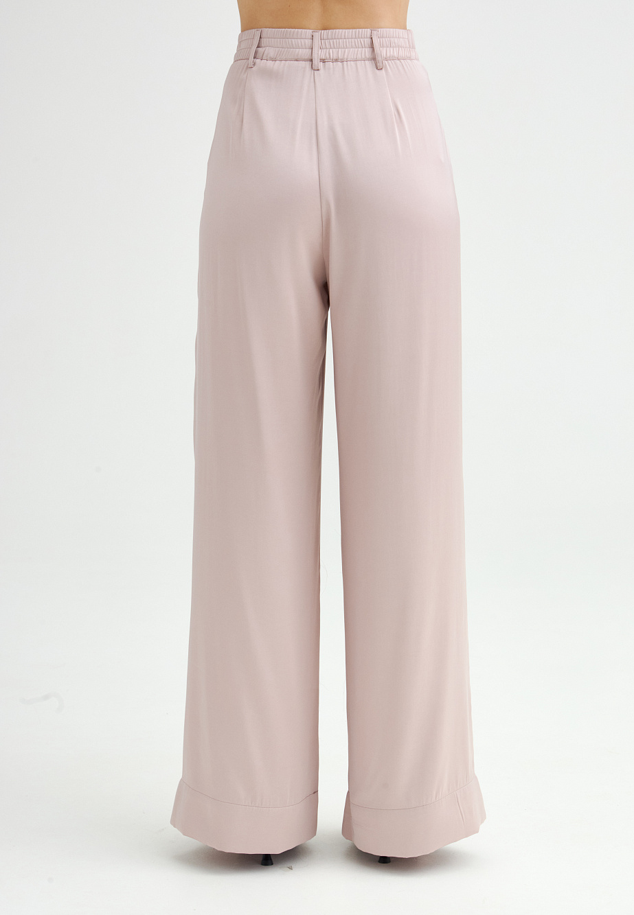 Брюки-палаццо с высокой посадкой, выполненные из прохладной поливискозы с матовым сатиновым блеском, дарят ощущение легкости. Резинка по поясу обеспечивает удобную посадку, а карманы в боковых швах и защипы спереди дарят ощущение свободы. Широкая подгибка по низу брючин сохраняет форму, добавляя завершенность образу. В сочетании с жакетом такие брюки создают безупречный монохромный силуэт, сохраняя чистоту линий и минимализм.