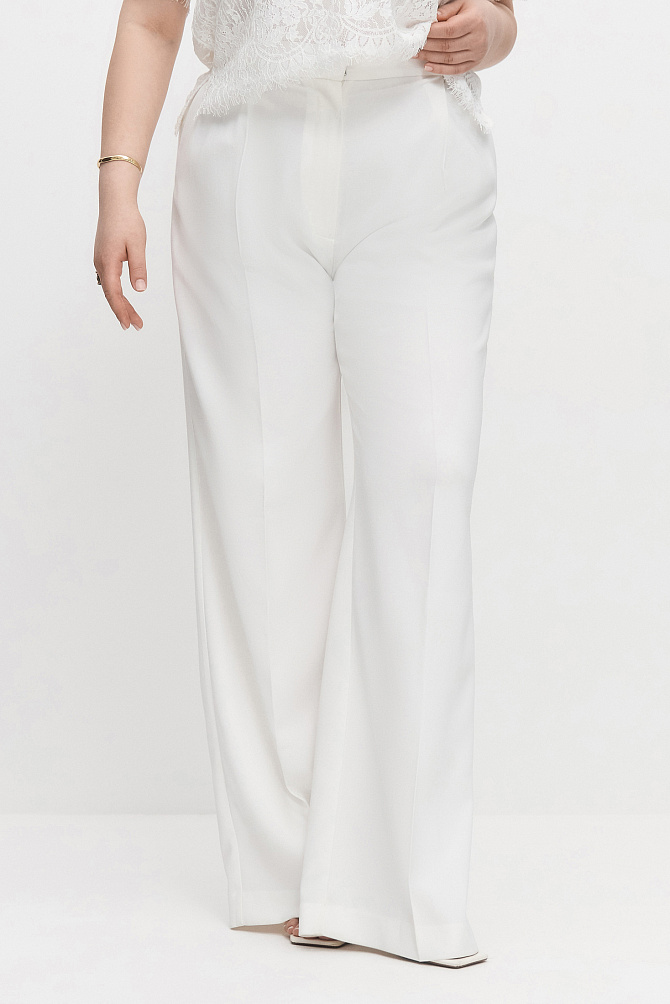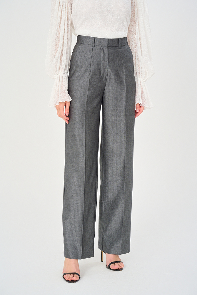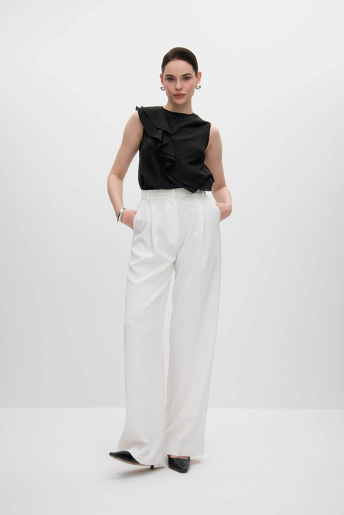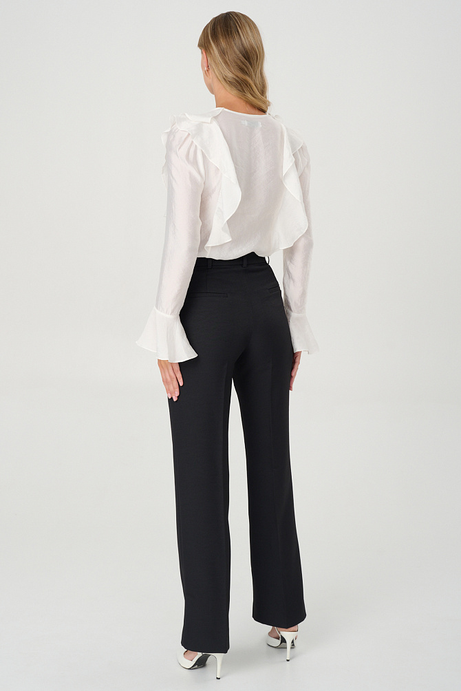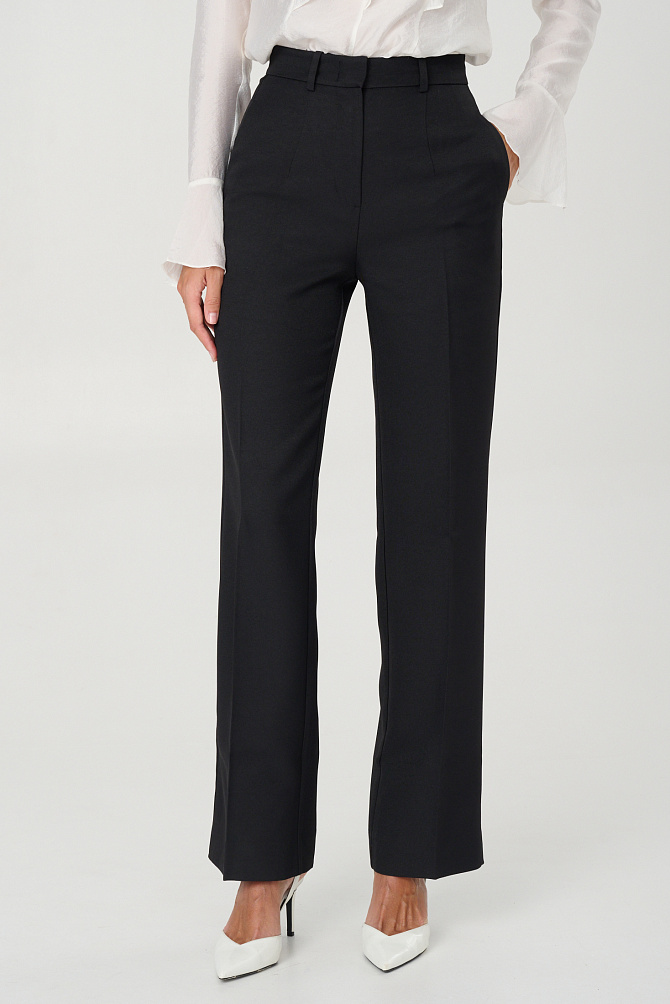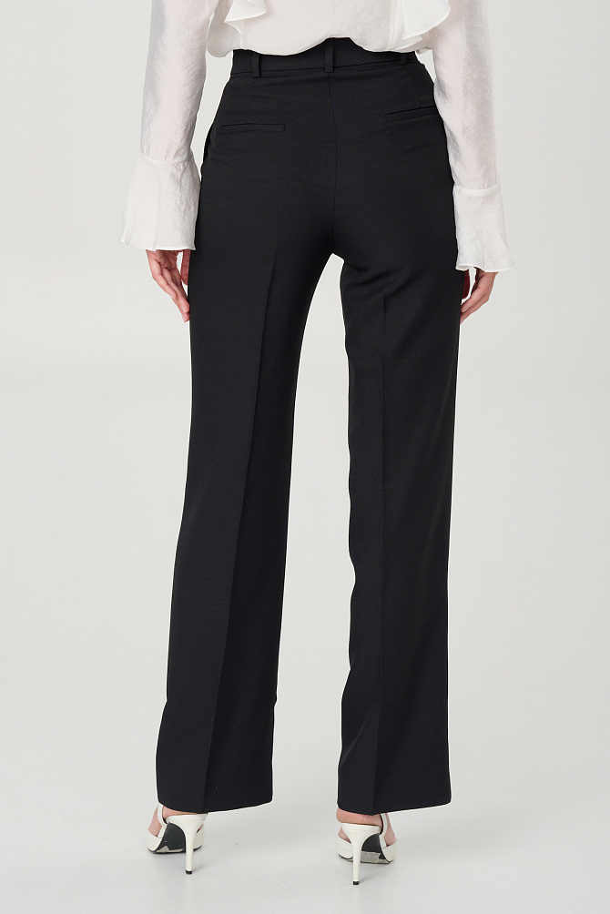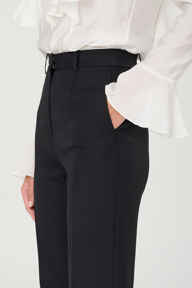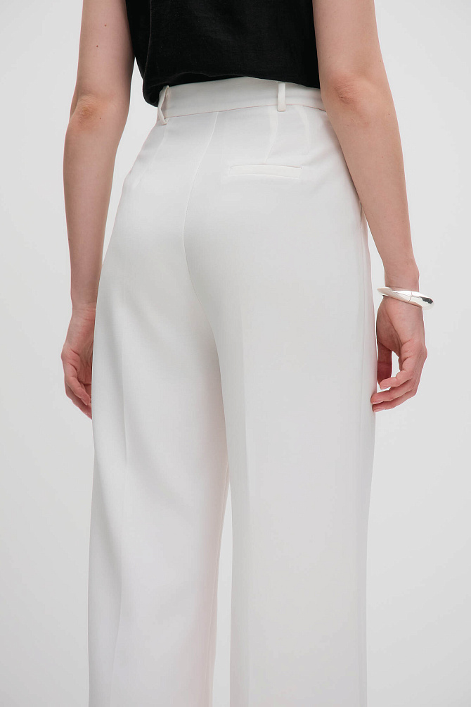 Брюки с высокой посадкой и лёгким расклешением книзу выполнены с защипами, переходящими в стрелки. Модель дополнена боковыми карманами, хлопковой корсажной лентой для идеальной фиксации пояса, застёжкой на крючок и декоративной имитацией карманов сзади.