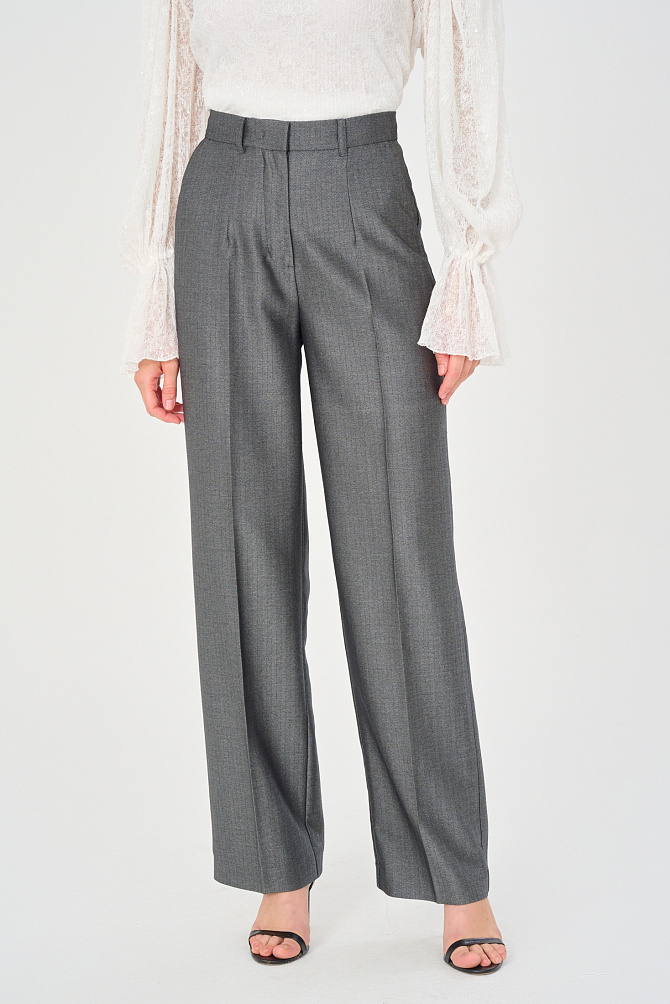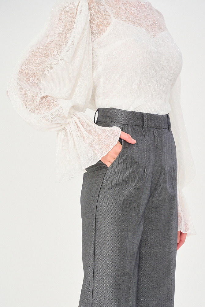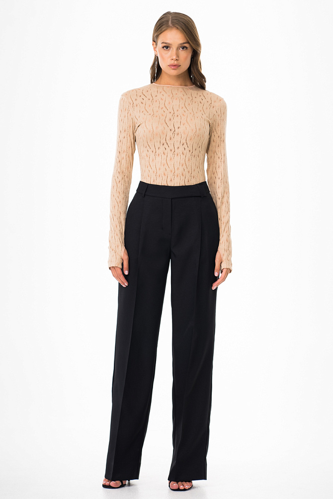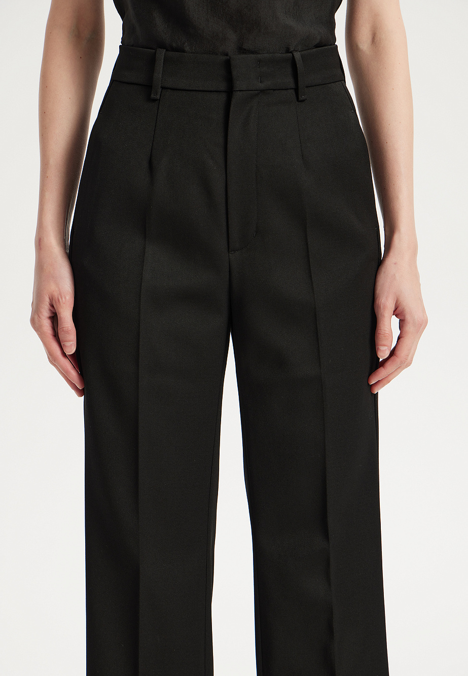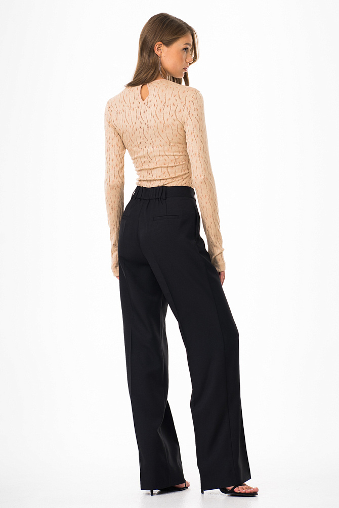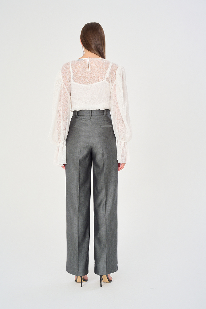 Брюки с высокой посадкой и лёгким расклешением книзу выполнены с защипами, переходящими в стрелки. Модель дополнена боковыми карманами, хлопковой корсажной лентой для идеальной фиксации пояса, застёжкой на крючок и декоративной имитацией карманов сзади.