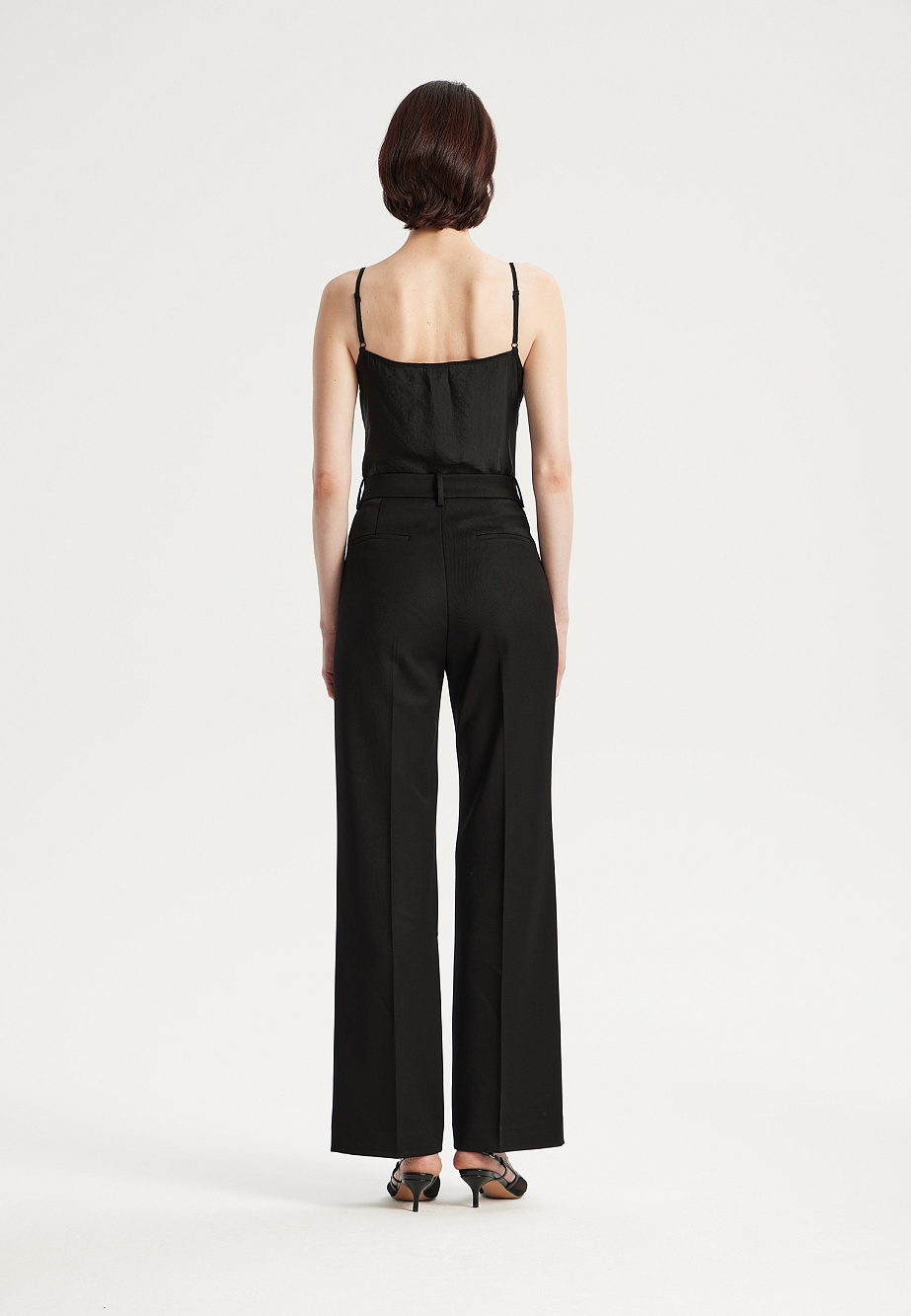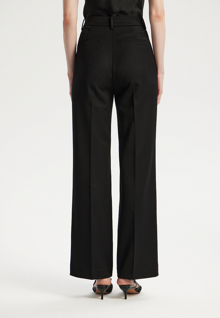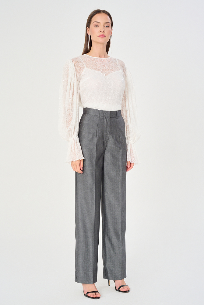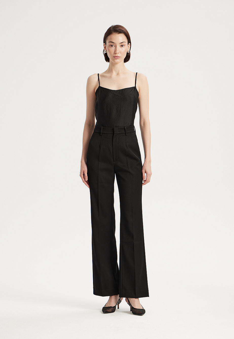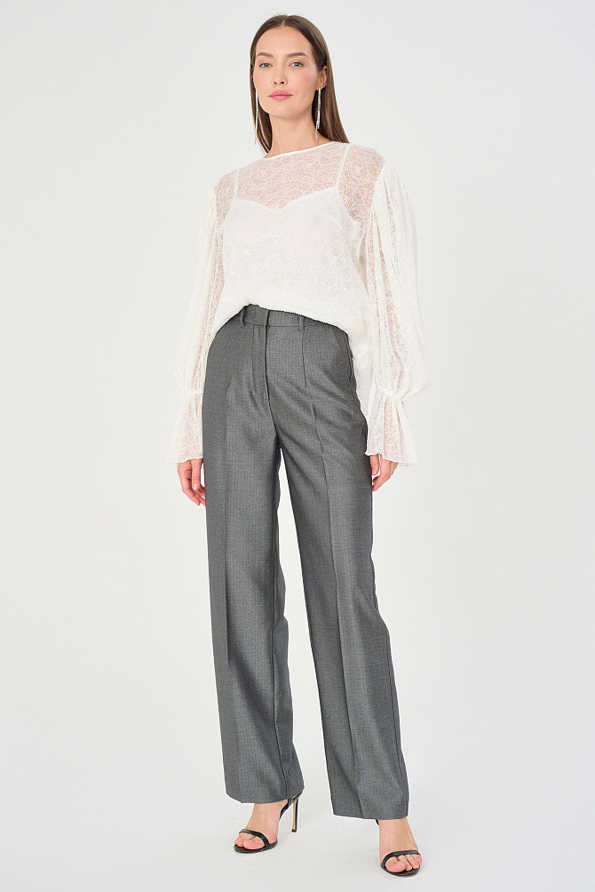 Брюки с высокой посадкой и лёгким расклешением книзу выполнены с защипами, переходящими в стрелки. Модель дополнена боковыми карманами, хлопковой корсажной лентой для идеальной фиксации пояса, застёжкой на крючок и декоративной имитацией карманов сзади.