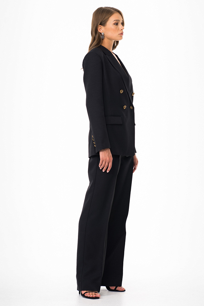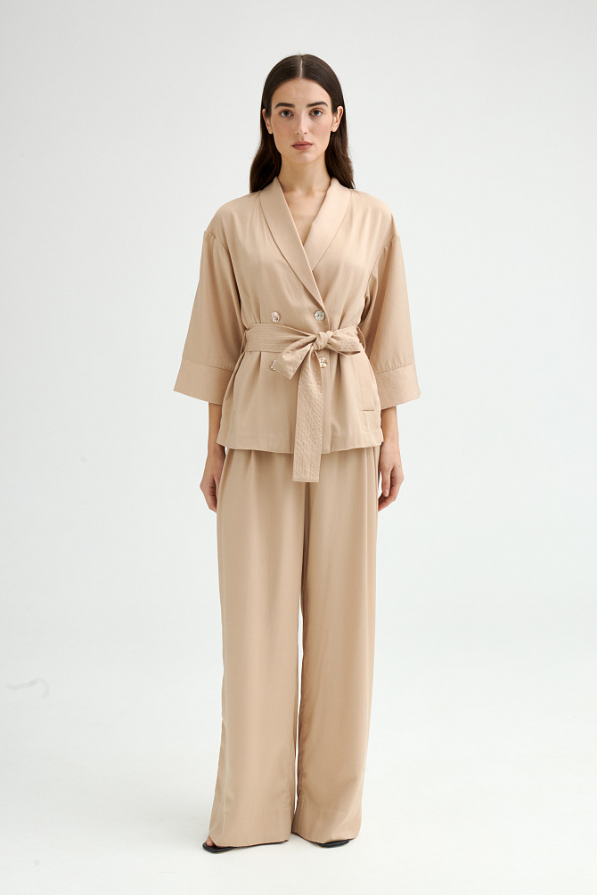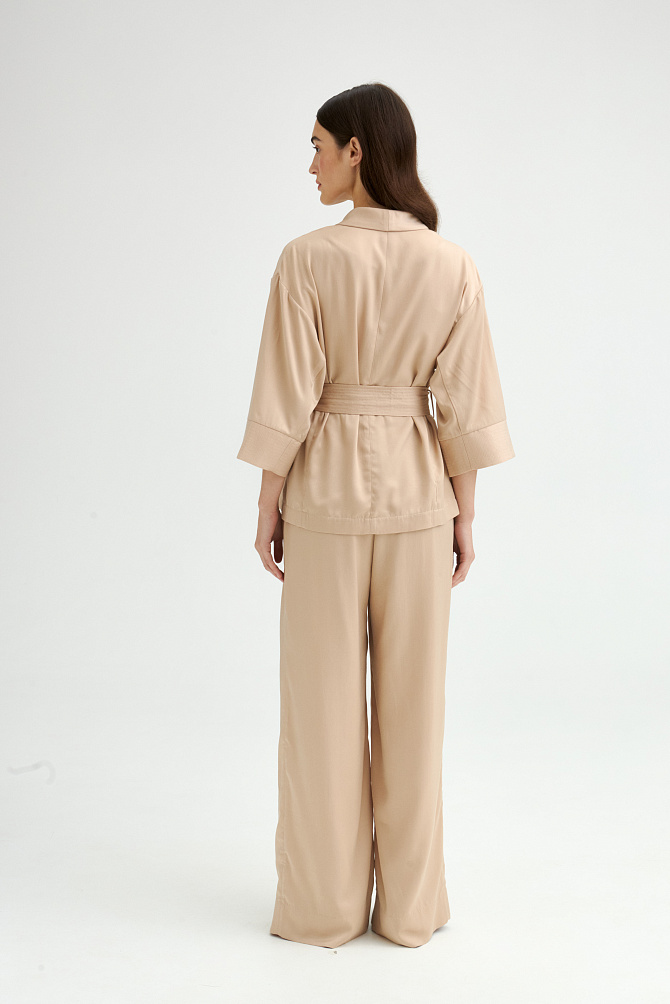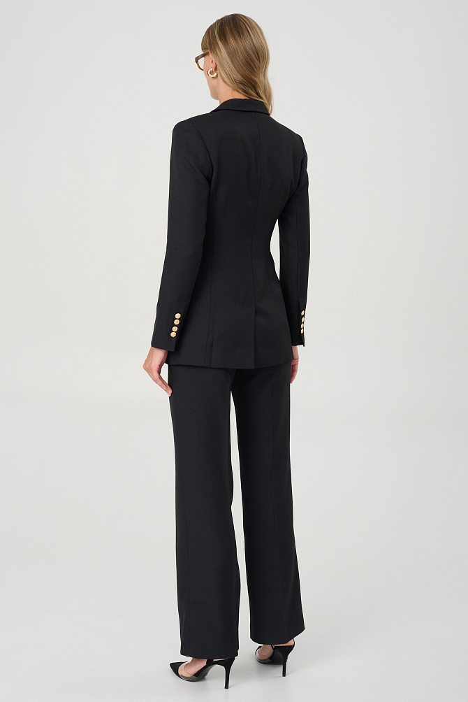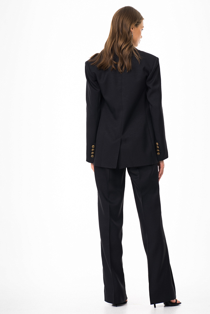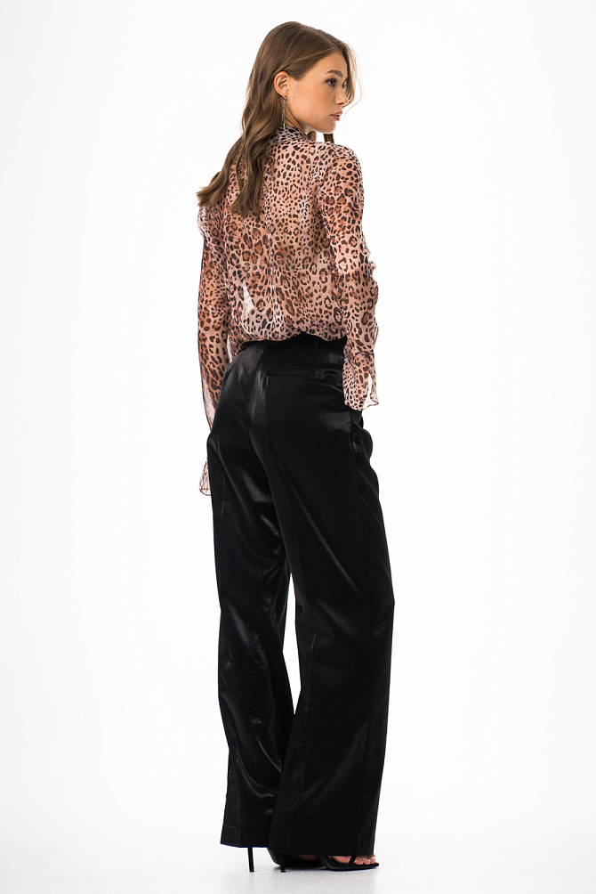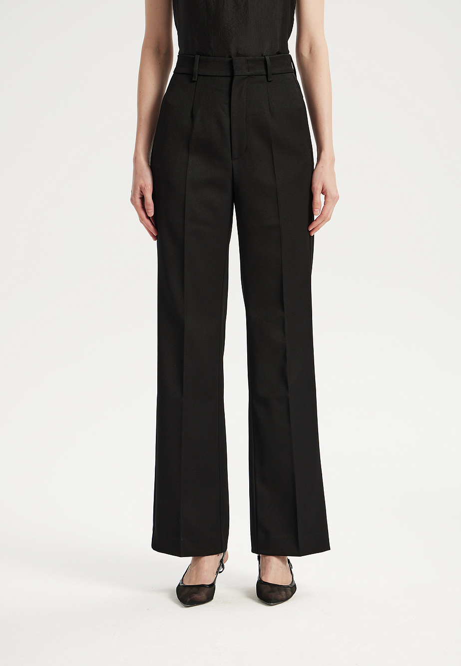 Брюки с высокой посадкой и лёгким расклешением книзу выполнены с защипами, переходящими в стрелки. Модель дополнена боковыми карманами, хлопковой корсажной лентой для идеальной фиксации пояса, застёжкой на крючок и декоративной имитацией карманов сзади.