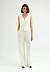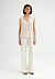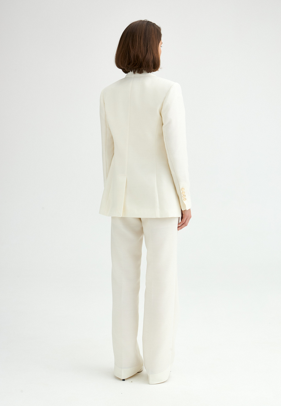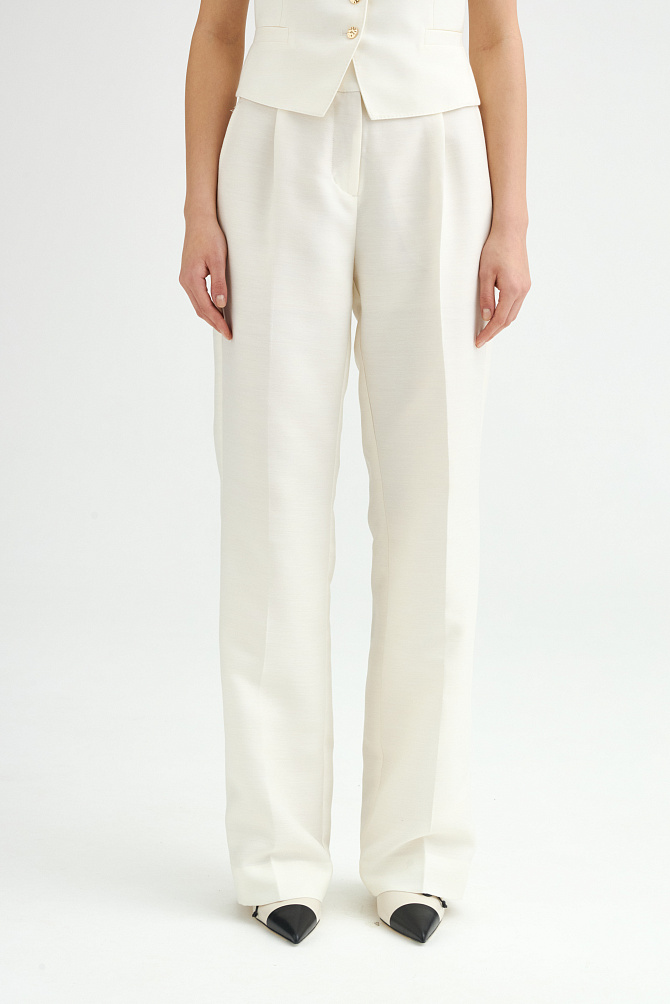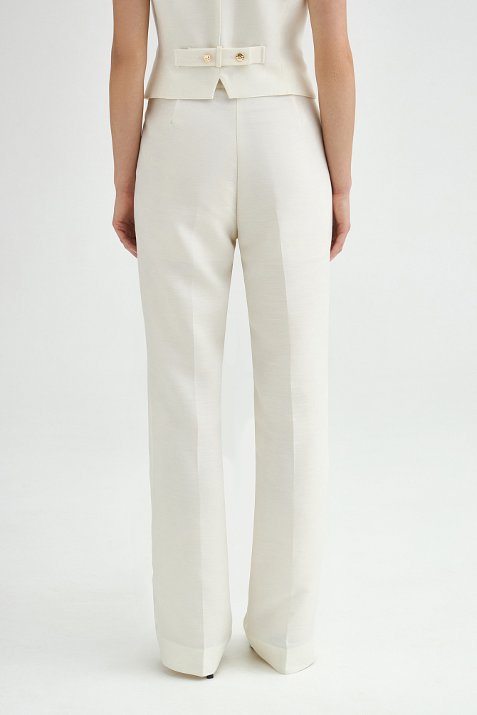 Летние брюки молочного оттенка из смесовой ткани с вискозой и шерстью идеально подходят для теплых дней. Брюки с высокой посадкой и прямым кроем, оформленные защипами на талии и карманами в боковых швах, создают стильный и элегантный силуэт. Внутренний подклад из вискозы телесного цвета сохраняя форму изделия и обеспечивает удобство в носке.