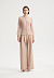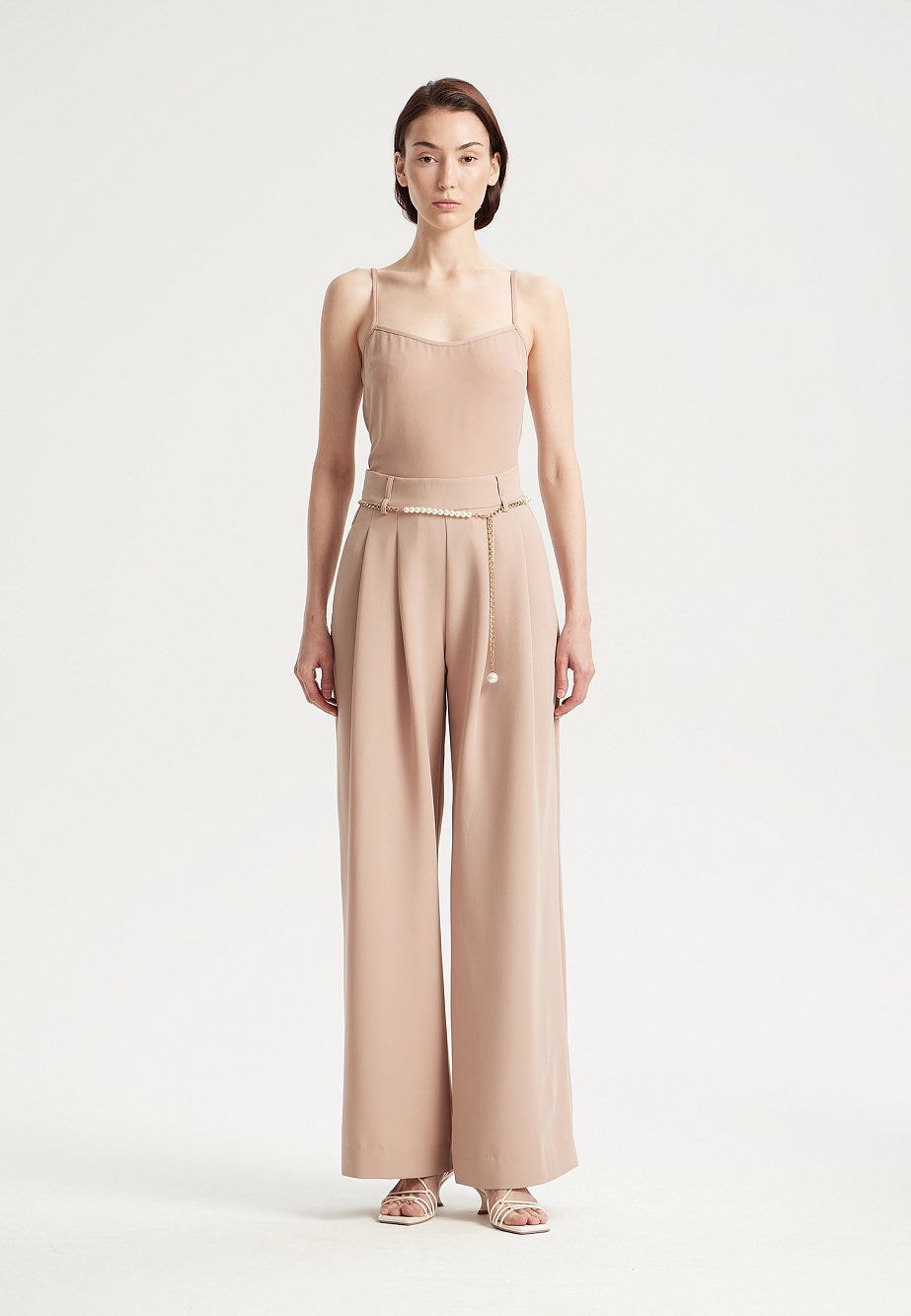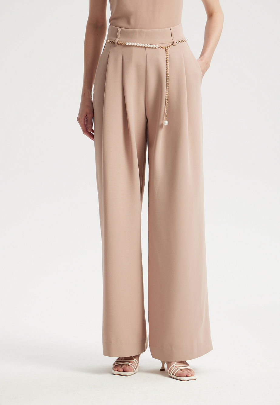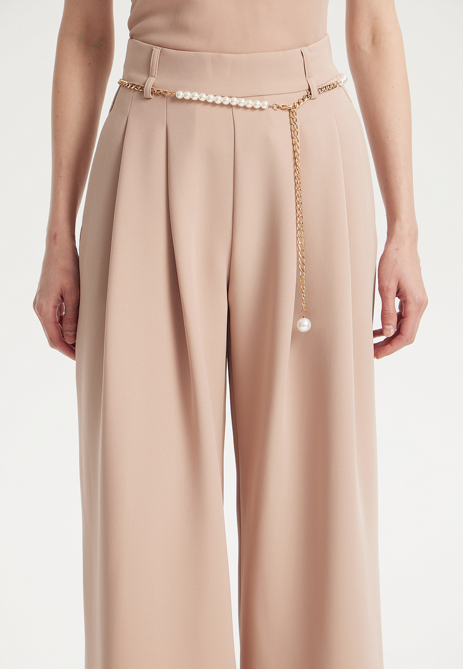 Брюки - палаццо из креповой ткани с высокой посадкой составляют идеальный комплект с кружевной блузой из коллекции Emilia dell'Oro. Такой комплект станет прекрасной альтернативой платью для выхода и торжественных случаев. Свободные брюки с двойными защипами и широким поясом смотрятся щедро и акцентно. Украшением служит пояс на цепочке с жемчужными бусинами.