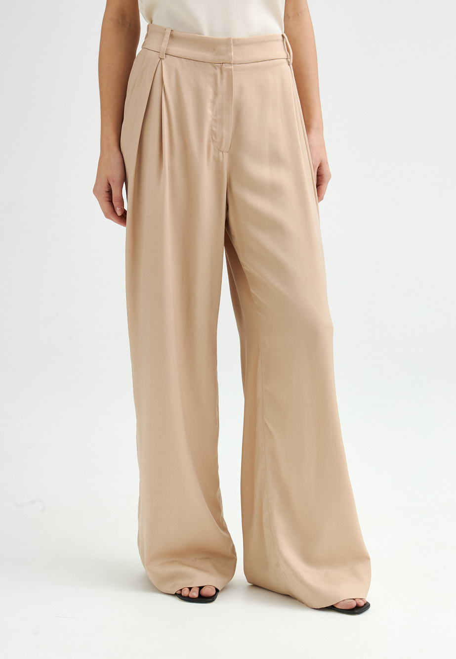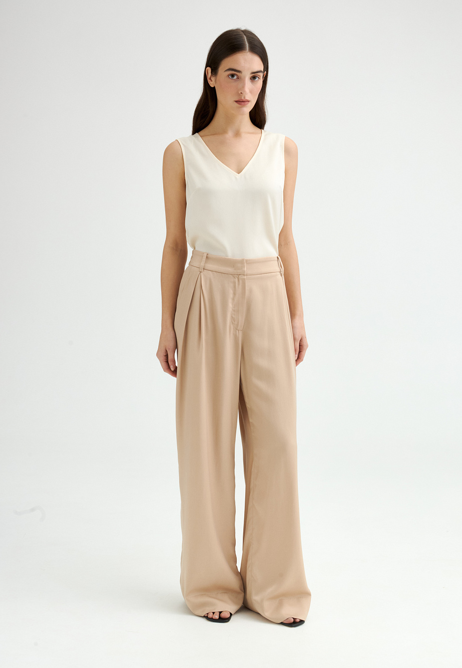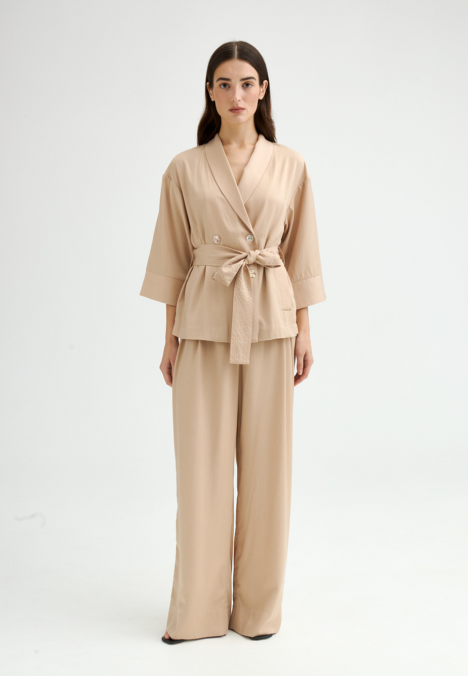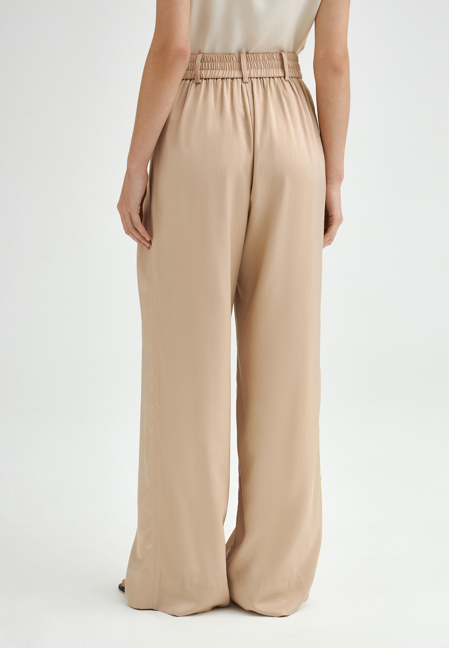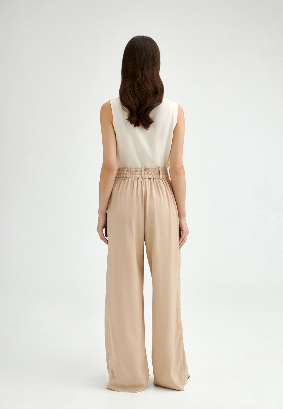 Свободные струящиеся брюки -палаццо отлично смотрятся в комплекте с жакетом в стиле кимоно. Защипы спереди и резинка по талии сзади позволяют комфортно двигаться в течении дня,не стесняя в движении. Брюки выполнены из смесовой вискозной ткани с благородным сатиновым блеском. Такие брюки идеально дополняют аутфиты с другими свободными жакетами, футболками, рубашками и женственными блузками.