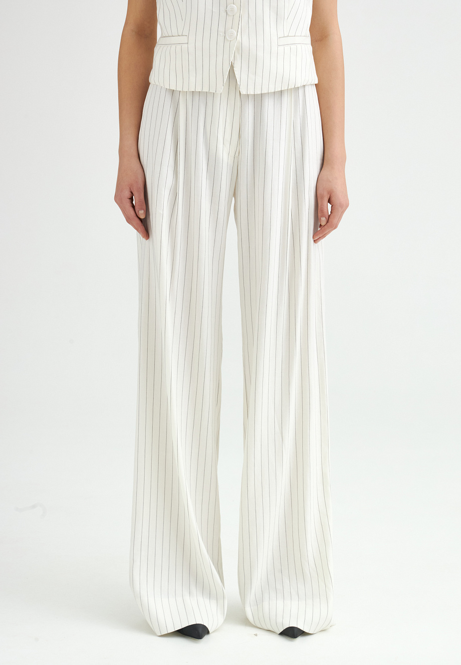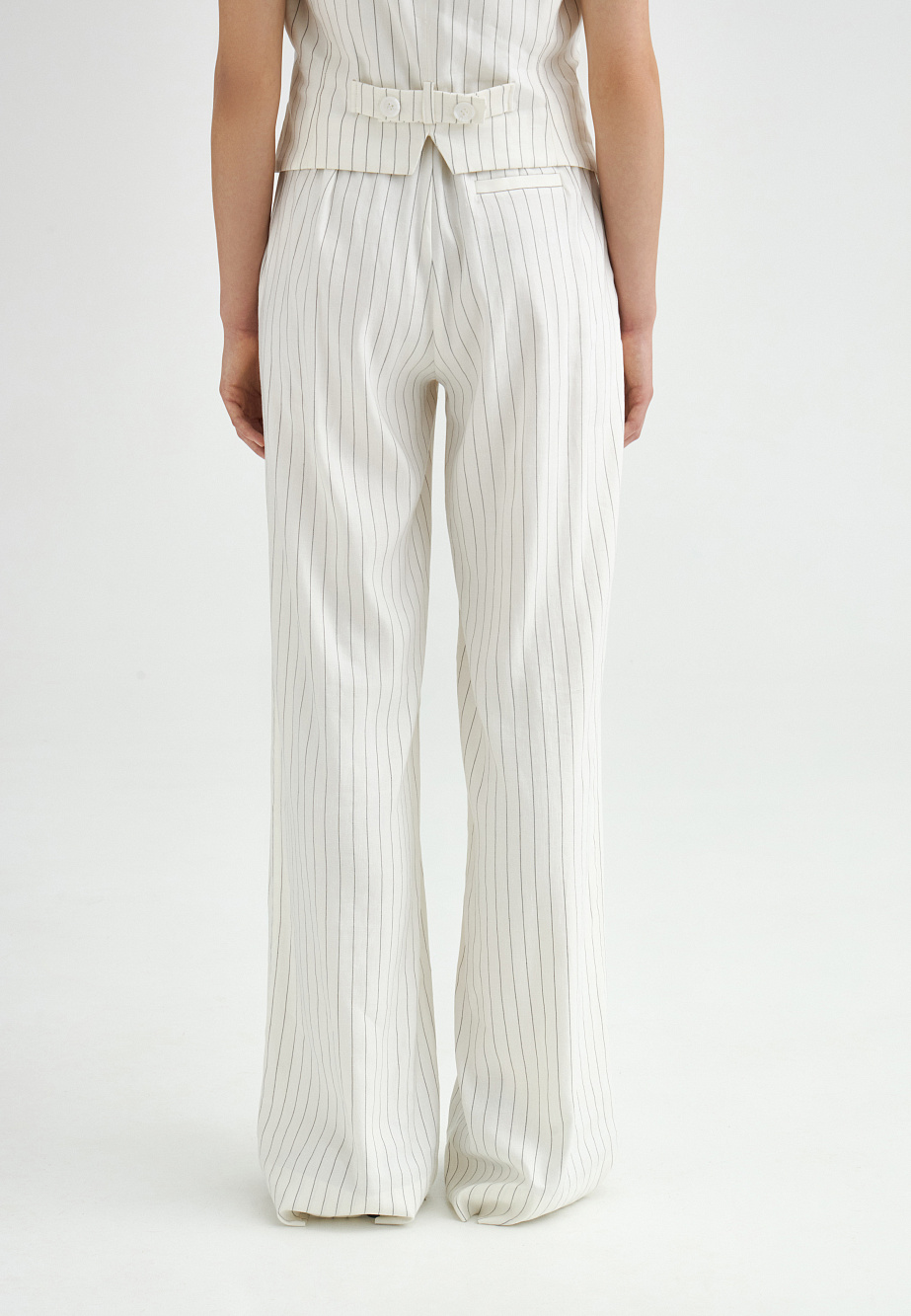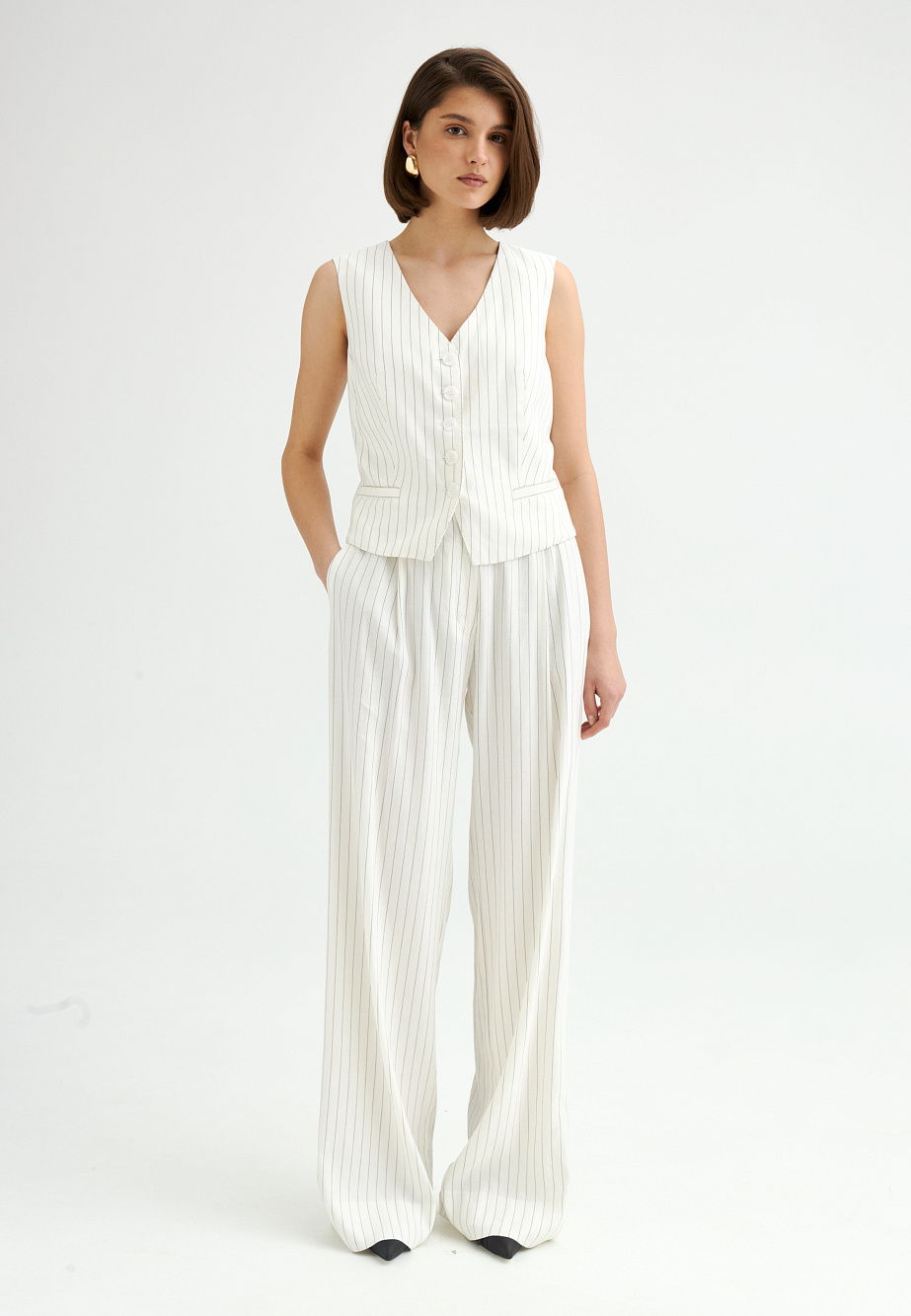 Брюки из смесовой ткани станут многофункциональными в вашем летнем гардеробе. Льняной состав и тонкая карандашная полоска позволят их носить как в офис, так и на прогулку. Брюки свободного силуэта, с защипами на талии и глубокими карманами. Длина макси и широкая подгибка по низу брюк хорошо держат форму и современно смотрятся.