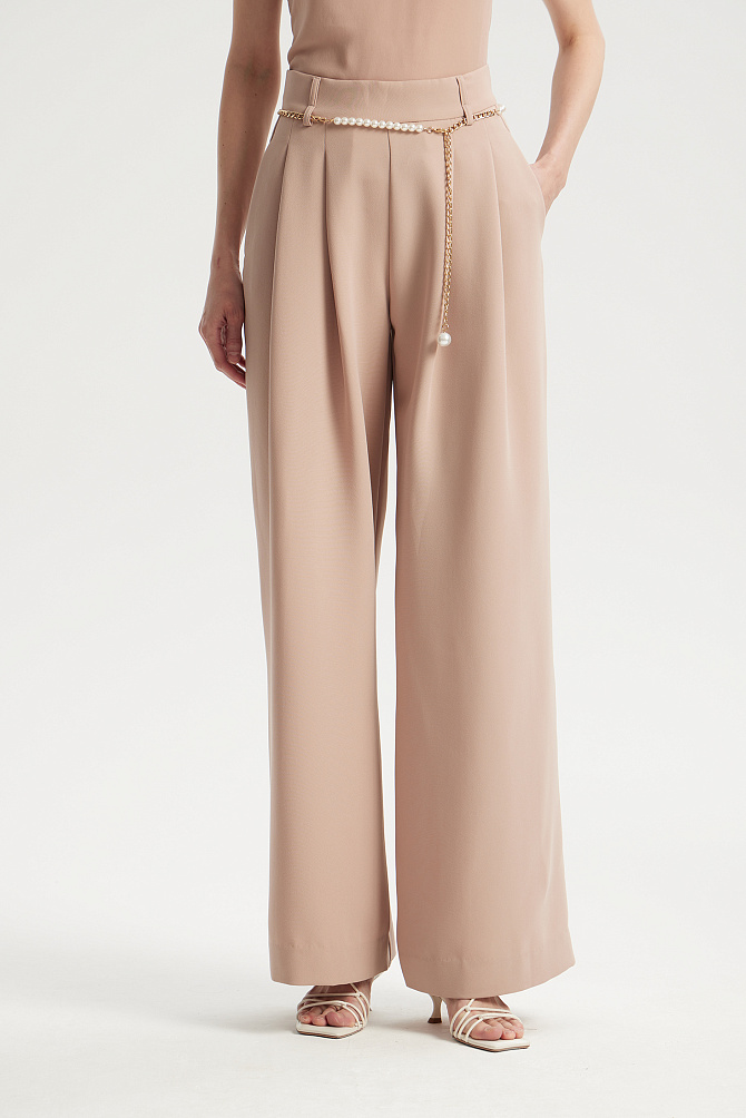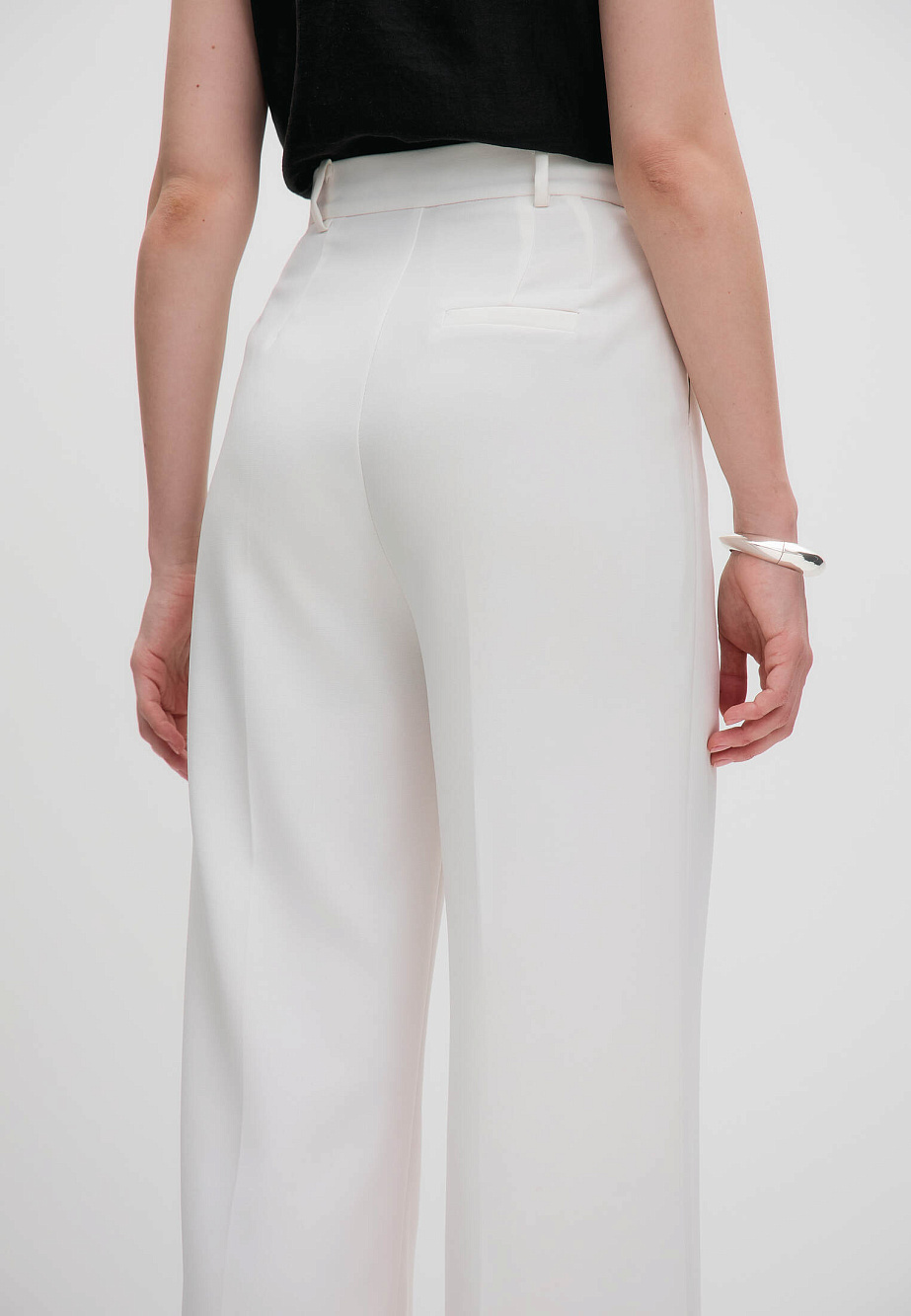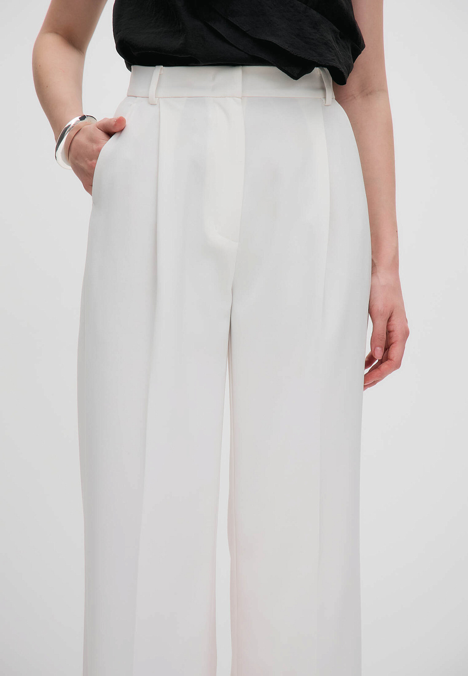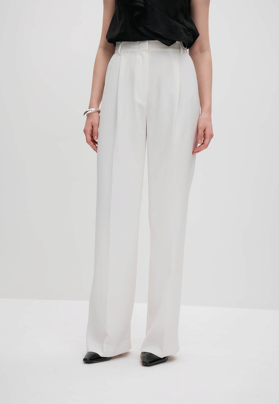 Прямые брюки на высокой посадке с защипами на талии и стрелками. Свободный силуэт и длина макси смотрится актуально и современно. В брюках предусмотрен полувискозный подклад шортами телесного цвета, чтобы избежать просвечивания нижнего белья. Брюки рекомендуется сочетать с жакетом из нашей коллекции.